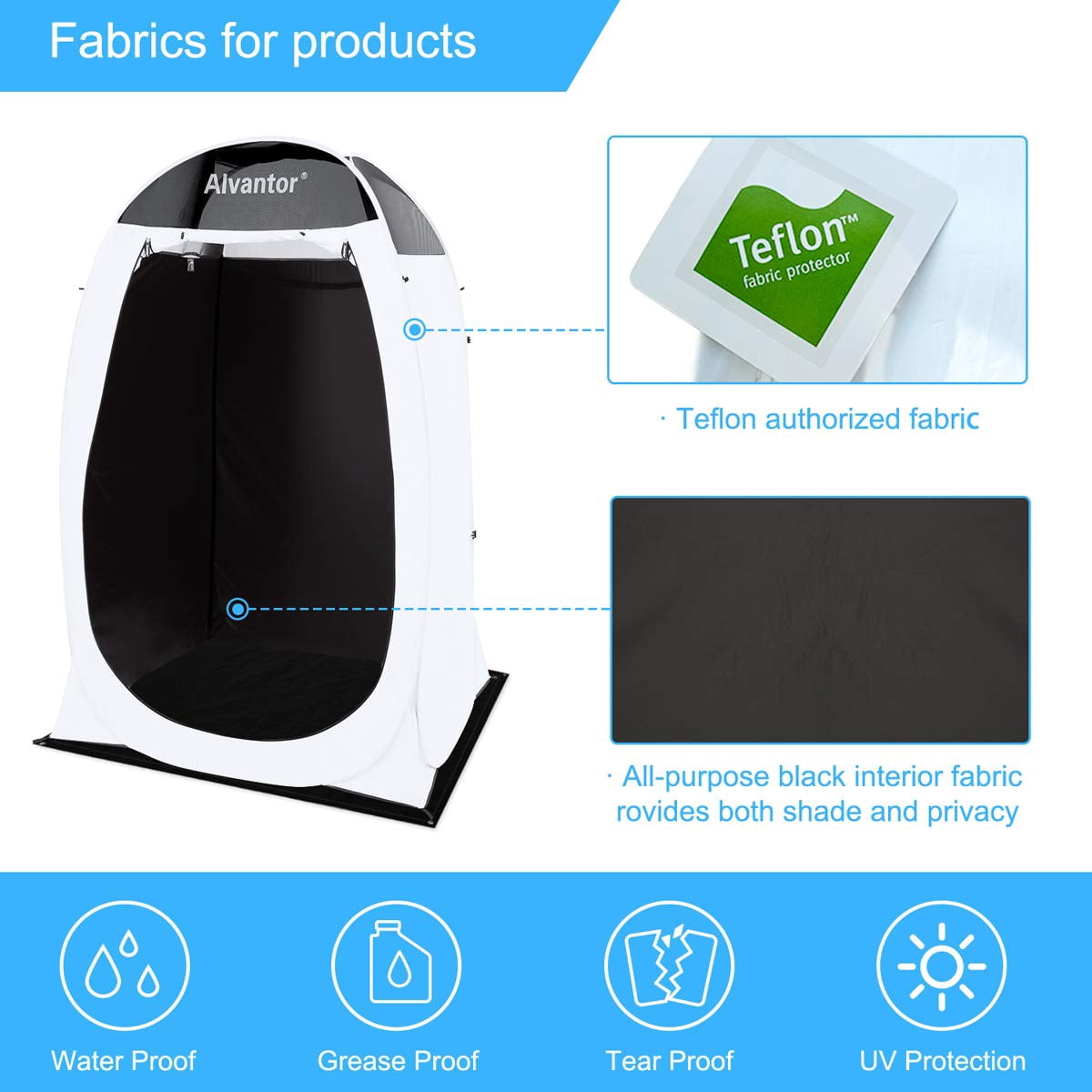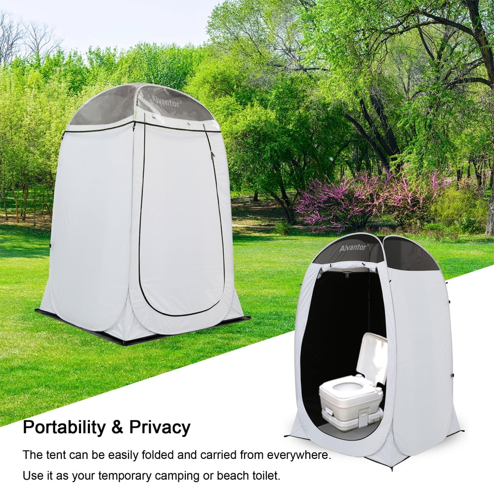 Description: Patented Design: Patented pop up style shower canopy. It Only take 1 minute to complete the quick set up and fold down with the patent design. Easy assemble by one person. Folding into the compact carry bag, it is easy to take away! Teflon Coated Fabric: Completely Black out and no shadow for privacy. Teflon coated fabric is water, oil, tear and dirt-proof, easy to clean. There have mesh on top for ventilation and with extra top cover for water proof while raining. Big Size: 4′ x 4′ x 7′ H fits person of all shapes. This tent can be folded into the flat compact small carrying size: 20.8” x 3.5” H. Weight: 7.4 lbs. Versatile Usage: There are hooks, rope and pockets inside the privacy tent. And with removable floor. It can be used as changing room, restroom and shower room on the beach, at camp, photo studio and wherever you want! 1 Year 100% SATISFACTION GUARANTEE: Alvantor is a U.S. based company which is located in Los Angeles, CA. Trademark is registered. if you have any question about Alvantor Tent, please contact us 626-542-3420. Alvantor 1-Person Camping Tent: Patent Pending Design: Patent pending pop up style personal shower canopy. It Only take 1 minute to complete the quick set up and fold down with the patent pending design. Easy assemble by one person. Folding into the compact carry bag, it is easy to take away! Teflon Coated Fabric: Completely Black out and no shadow for privacy. Teflon coated fabric is water, oil, tear and dirt-proof, easy to clean. There have mesh on top for ventilation and with extra top cover for water proof while raining. Big Size: 4′ x 4′ x 7′ H fits person of all shapes. This tent can be folded into the flat compact small carrying size: 20.8” x 3.5” H. Weight: 7.4 lbs. Versatile Usage: There are hooks, rope and pockets inside the privacy tent. And with removable floor. It can be used as changing room dressing, restroom, bathroom, potty and shower room on the beach, at camp, backpacking, photo studio and wherever you want! 1 Year 100% SATISFACTION GUARANTEE: Alvantor is a U.S. based company which is located in Los Angeles, CA. Trademark is registered. if you have any question about Alvantor Tent, please contact us 626-542-3420.
