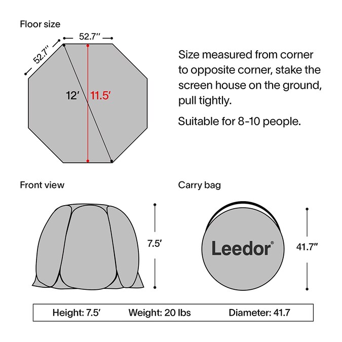 - The screen tent is 12x12x7.5ft H, 20 lbs, carry bag diameter 41.7×2.8in H.