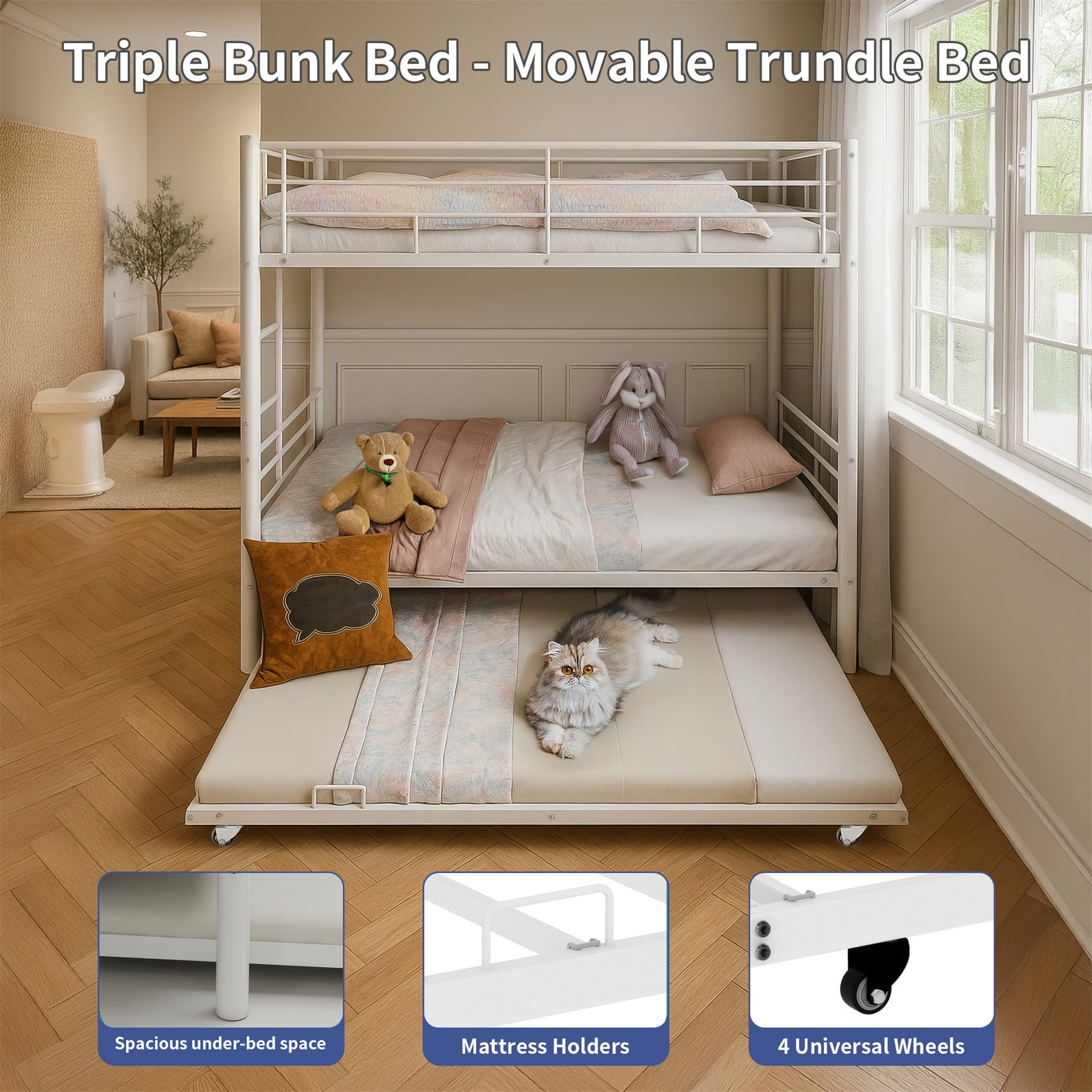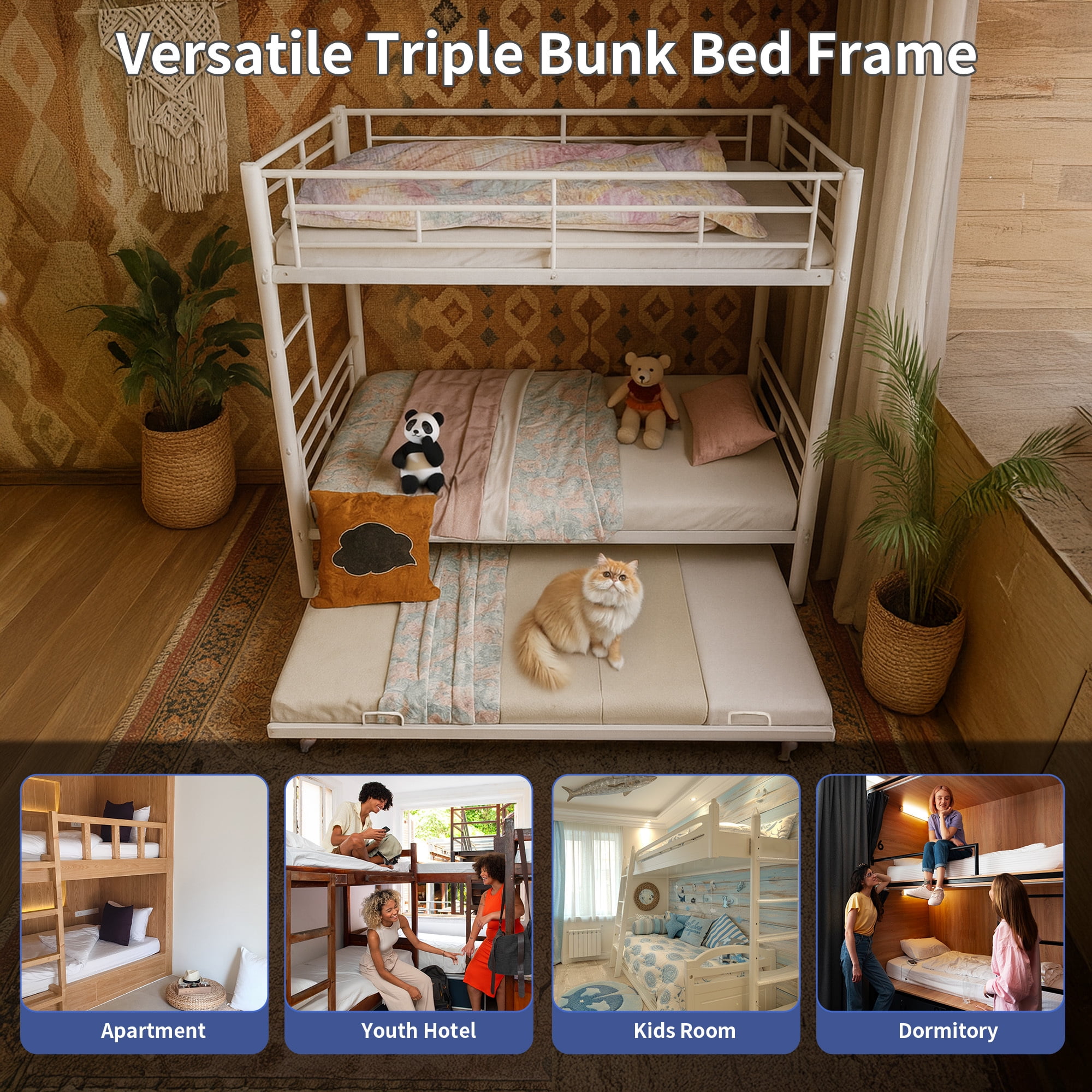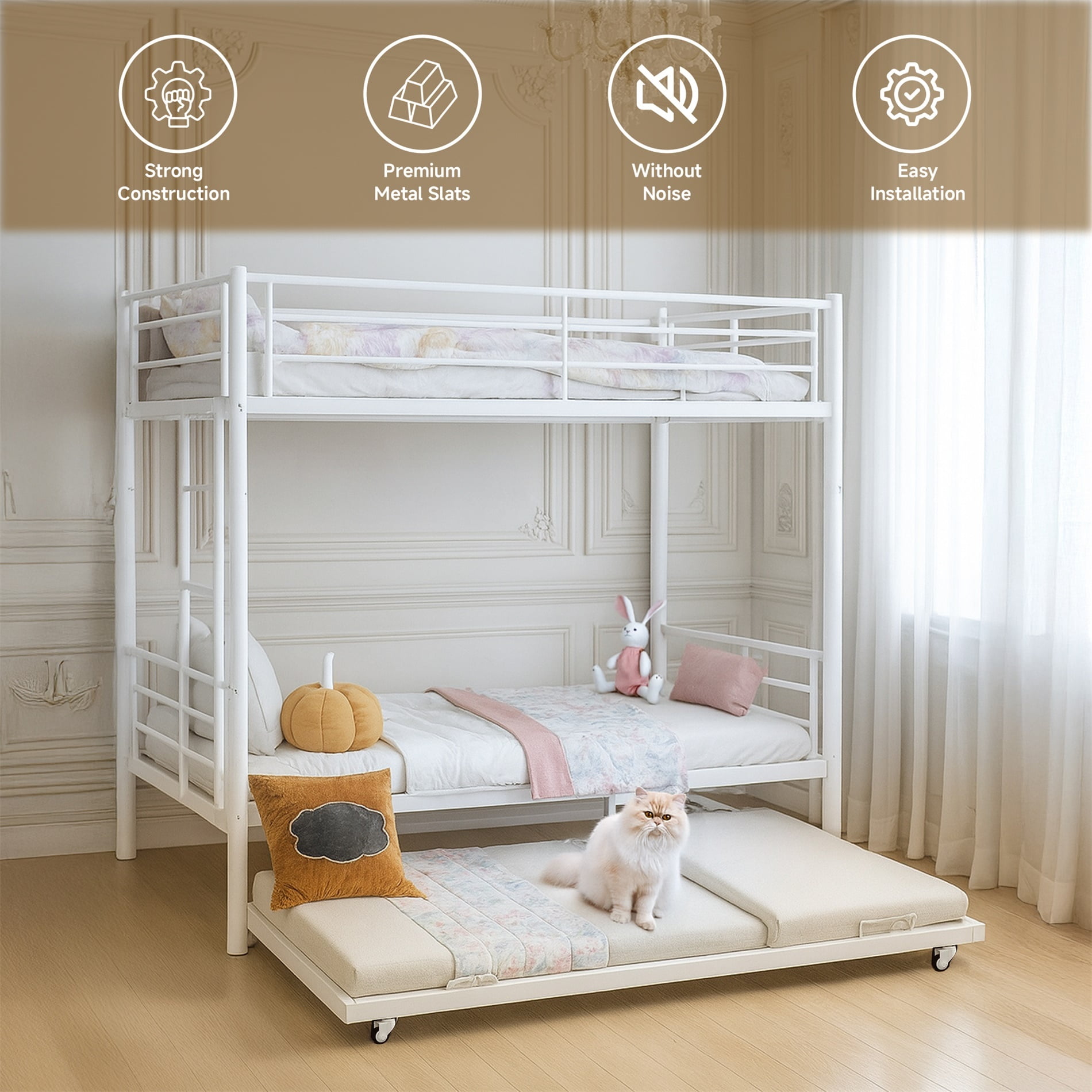 Alvantor Triple Bunk Beds Frame, Twin over Twin Bunk Bed with Trundle, Heavy Duty Metal Bed with Guardrail and Ladders, Divided Into 3 Twin Beds for Boys, Girls, Kids, Easy Assembly White