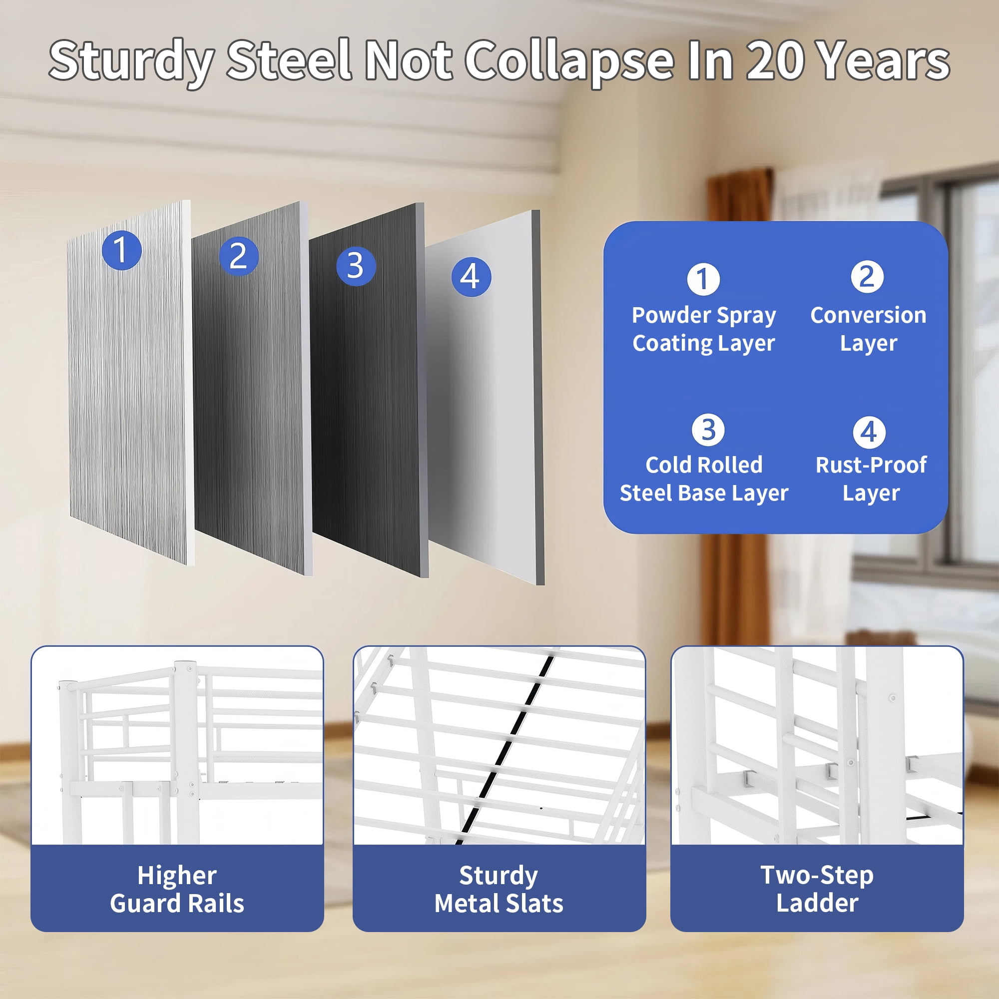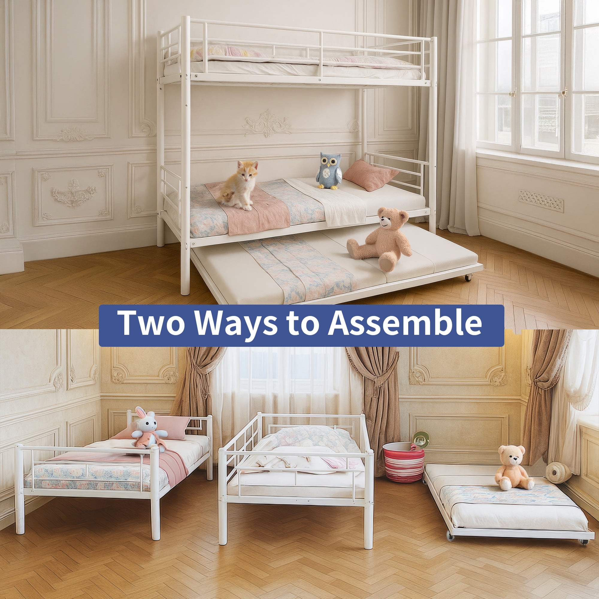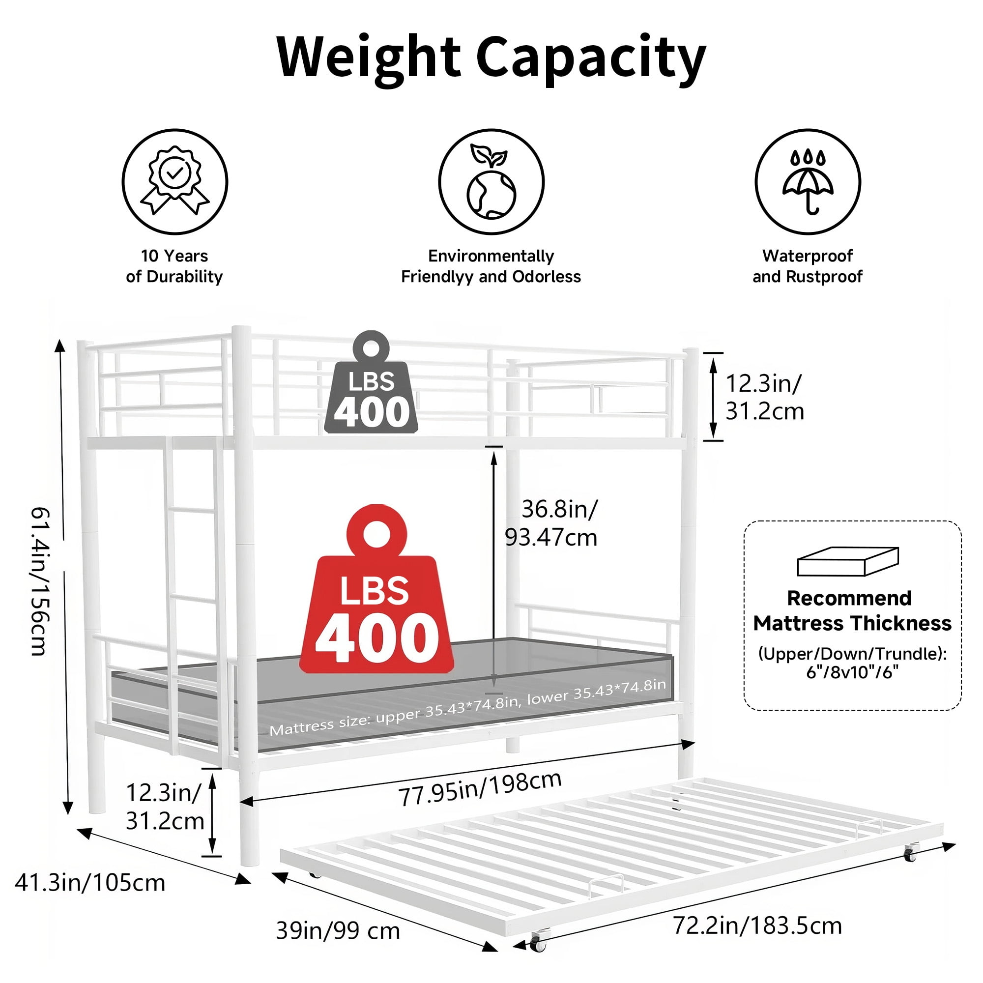 ????【3-in-1 Convertible Design – Twin Over Twin Bunk Bed with Trundle】:This metal twin bunk bed with trundle easily converts into two individual twin beds, while the pull-out trundle adds a third sleeping space. Perfect for kids’ bedrooms, teens, or guest sleepovers—no box spring required. ????【Heavy-Duty Steel Frame – 400lbs Weight Capacity】:Constructed from premium powder-coated steel, each sleeping area (top, bottom, and trundle) can support up to 400lbs, making this a sturdy metal bunk bed for adults and children alike. ????【Enhanced Safety – Full-Length 12.3″ Guardrails & Side Ladder】:The top bunk features 12.3-inch tall guardrails to prevent accidental falls, while the side ladder design improves access and saves space. This makes it an ideal bunk bed for kids with safety rails. ????【Space-Saving & Stylish for Any Room】:Maximize your vertical space with this space-saving bunk bed for small rooms. Whether used in a shared kids’ bedroom, teen loft, or vacation rental, it fits seamlessly into any décor thanks to its sleek black or white finish. ????【Easy Assembly & Mattress Friendly – No Box Spring Needed】:Includes built-in metal slats to support any standard twin-size mattress. Clear instructions and tools are included for hassle-free assembly—a perfect twin bunk bed with trundle for families on the go.
