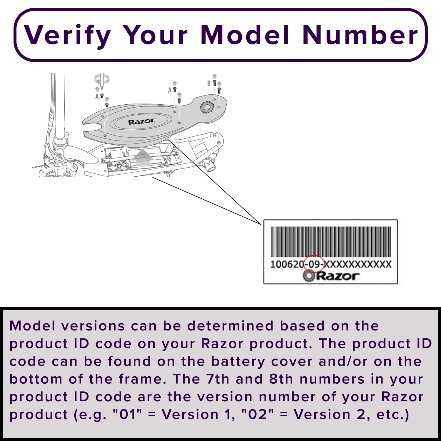 KEEP YOUR SCOOTER MOVING – Motors like this are what allow electric scooters and bikes to move on their own. EASY TO INSTALL – This motor comes with a bracket to make installation a breeze even if you have no DIY repair experience. HIGH QUALITY – Our brushed motor is made up of high quality parts and components to ensure long lasting fun. Also included is an 11 tooth #25 chain gear sprocket. WIDE COMPATIBILITY – This motor is the perfect replacement for a variety of Razor and other brand electric scooters, bikes, and go-karts. Note: Model versions can be determined based on the product ID code on your Razor product. The product ID code can be found on the battery cover and/or on the bottom of the frame. The 7th and 8th numbers in your product ID code are the version number of your Razor product (e.g. “01” = Version 1, “02” = Version 2, etc.)