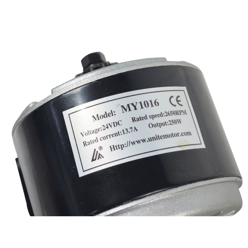 Looking for a powerful and compatible electric motor for your electric scooter, dirt bike, mini bike, electric bicycle, or go-kart? Look no further than the AlveyTech 24 volt 250 watt electric MY1016 DC motor. This motor is perfect for anyone looking to add some speed and power to their ride. It’s compatible with a wide variety of Razor scooters, and it even includes a mounting bracket so you can get started right away. Plus, it offers 250 watts of power for a truly exhilarating ride. Best of all, the motor offers left or right rotation by reversing the wires, so you can choose which direction works best for you. Add one of these motors to your cart today! – MODEL COMPATIBILITY Boreem: Jia 601-S. Dynacraft: Hello Kitty City Cruiser. Electra: Scoot-N-Go. MotoTec: MT-MB; MT-MR Mini Racer V2. Pulse: Super-C. Razor: E300; E300S; E325; Ground Force; Ground Force Drifter Fury; Ground Force Drifter Go Kart; Mini Chopper; MX350 Dirt Rocket; MX400 Dirt Rocket; Pocket Mod (Bella, Betty, Bistro, Blossom, Chrissy, Daisy, Hannah Montana, Kiki, Sweet Pea, Vapor); Pocket Rocket; Sport Mod. Surge: 24 Volt City Scooter. – SPECIFICATIONS Model: MY1016 Type: Brush Voltage: 24V DC Motor torque: 0.86 N-m Rated speed: 2750 RPM Rated Current: 13.5-13.7 amp Sprocket: 11 tooth #25 chain sprocket Output: 250W