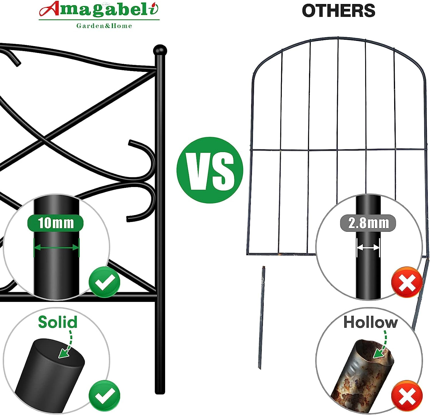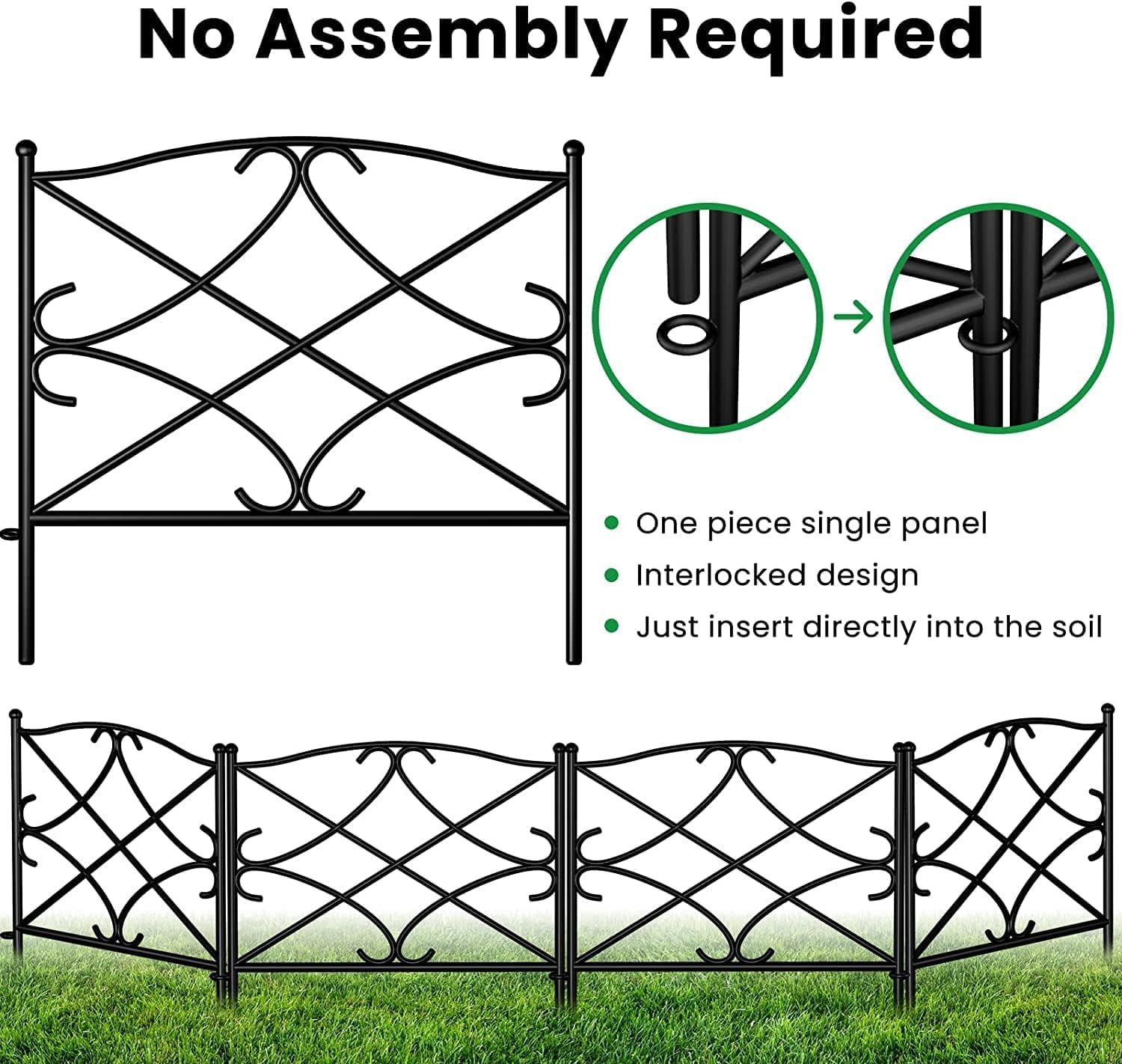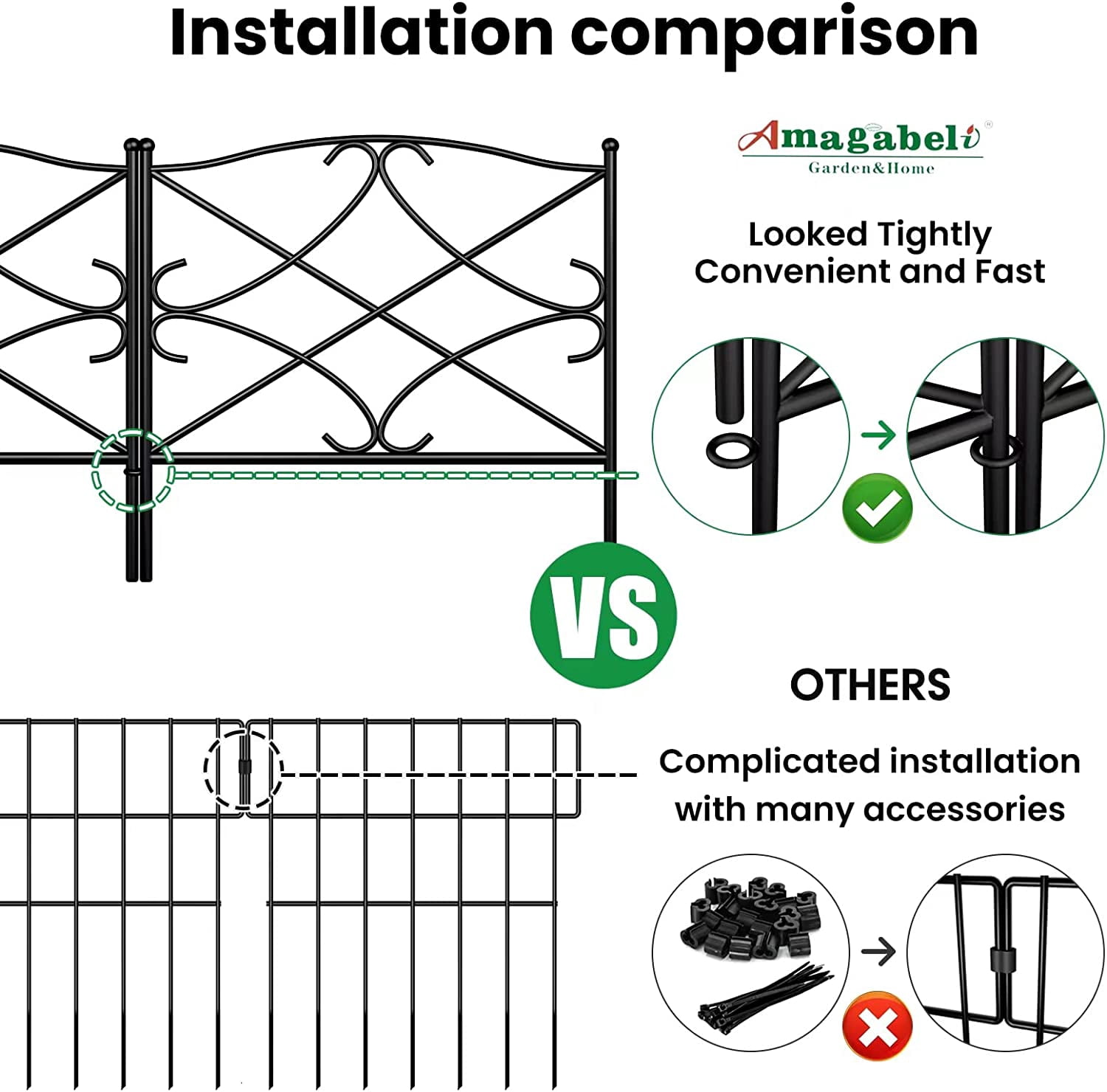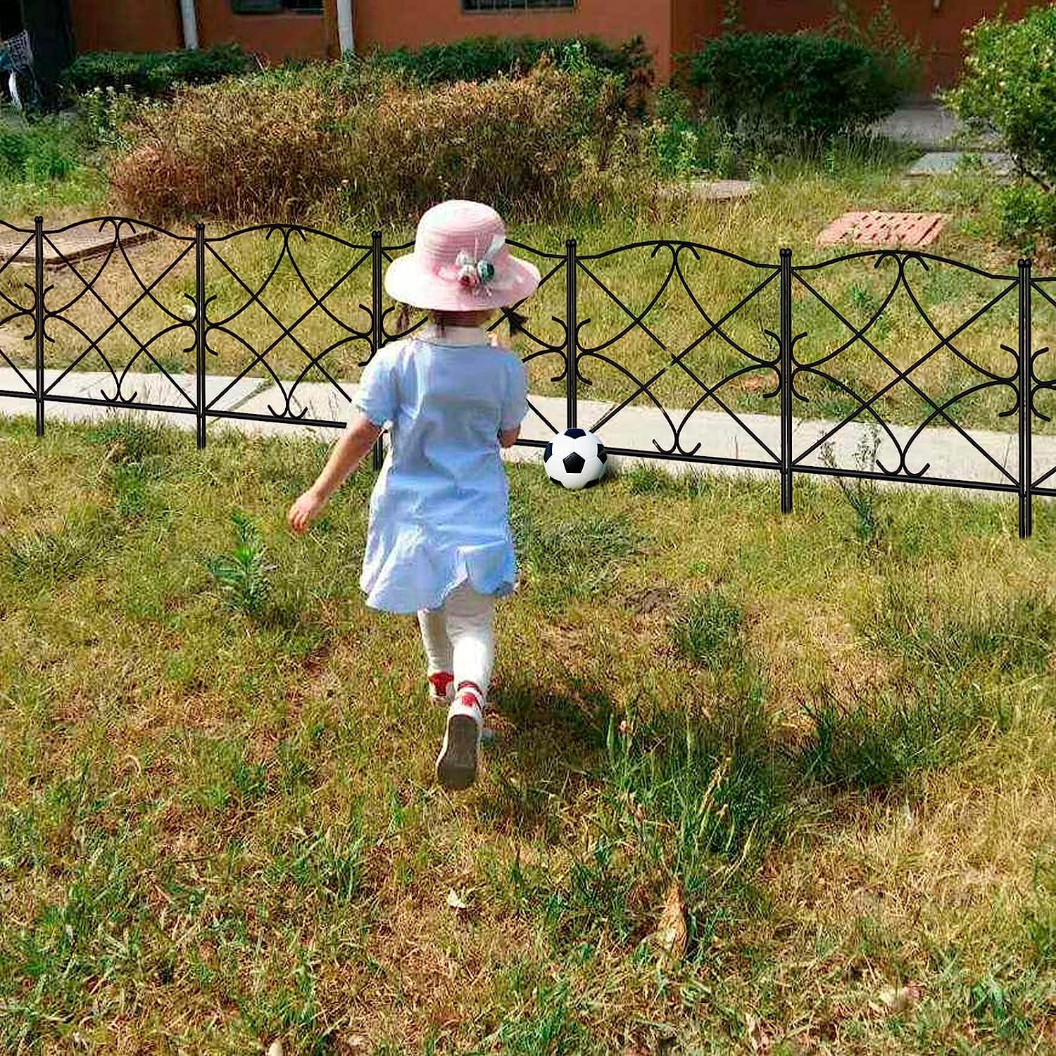 SIZE & RUSTPROOF MATERIAL: Decorative metal garden fence with single panel size 24″ high x 24″ wide, 5 Panels in total. This metal fence panels for front yard is made of black Iron with vinyl pvc powder coated surface will enable you to use the garden fence outdoors durably; the decorative black iron garden flower bed fencing animal barrier is made of rustproof and weather resistant metal material. EASY TO USE & FLEXIBLE SET-UP: Each piece of temporary movable border fencing can be easily interlocked with the ring on the side and folds flat for easy storage; no additional tools required to install this patio landscape edging fence: simply stick and secure the fence leg directly into ground. These no dig metal fence panels can be extended to different shapes according to your special uses of this path edging fence, one straight line, “L”, “O” or zigzag shape. FOLDABLE MOVEABLE PORTABLE & EASY TO STORE: Amagabeli patio steel picket folding fencing is foldable and folds flat for easy storage. Amagabeli garden fence barrier for dogs is movable and removable. No additional tools to remove this temporary wire garden fencing for pets for reinstallation in another place. Simply pull the fence legs of this flower garden border fencing out from the ground where you stick this vegetable garden fencing then reinstall. DECOR AND STURDY: The arched iron arts make this ornamental steel garden border fence itself a decorative element for your garden and add more delights to your life, accent border with classic rod iron design to fit any decor; stylish look of this flower garden border fencing will add a modern touch to your garden, patio or yard. The vinyl rustproof coated garden wire fence is welded with thick wires and it is an architectural structure that is durable and sturdy. CUSTOMER CARE: We offer premium products for you while exceeding highest industry standards and offer thoughtful and considerate customer care. Model Name:garden fence ET305