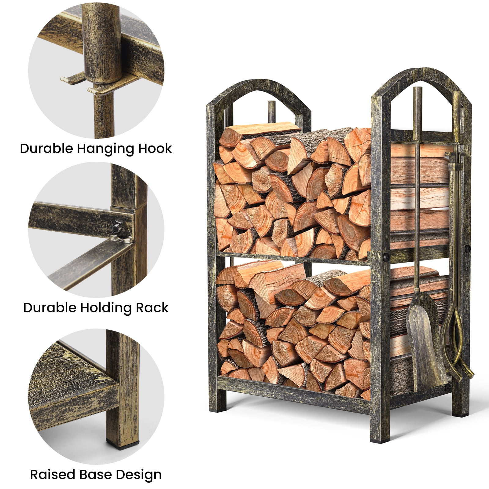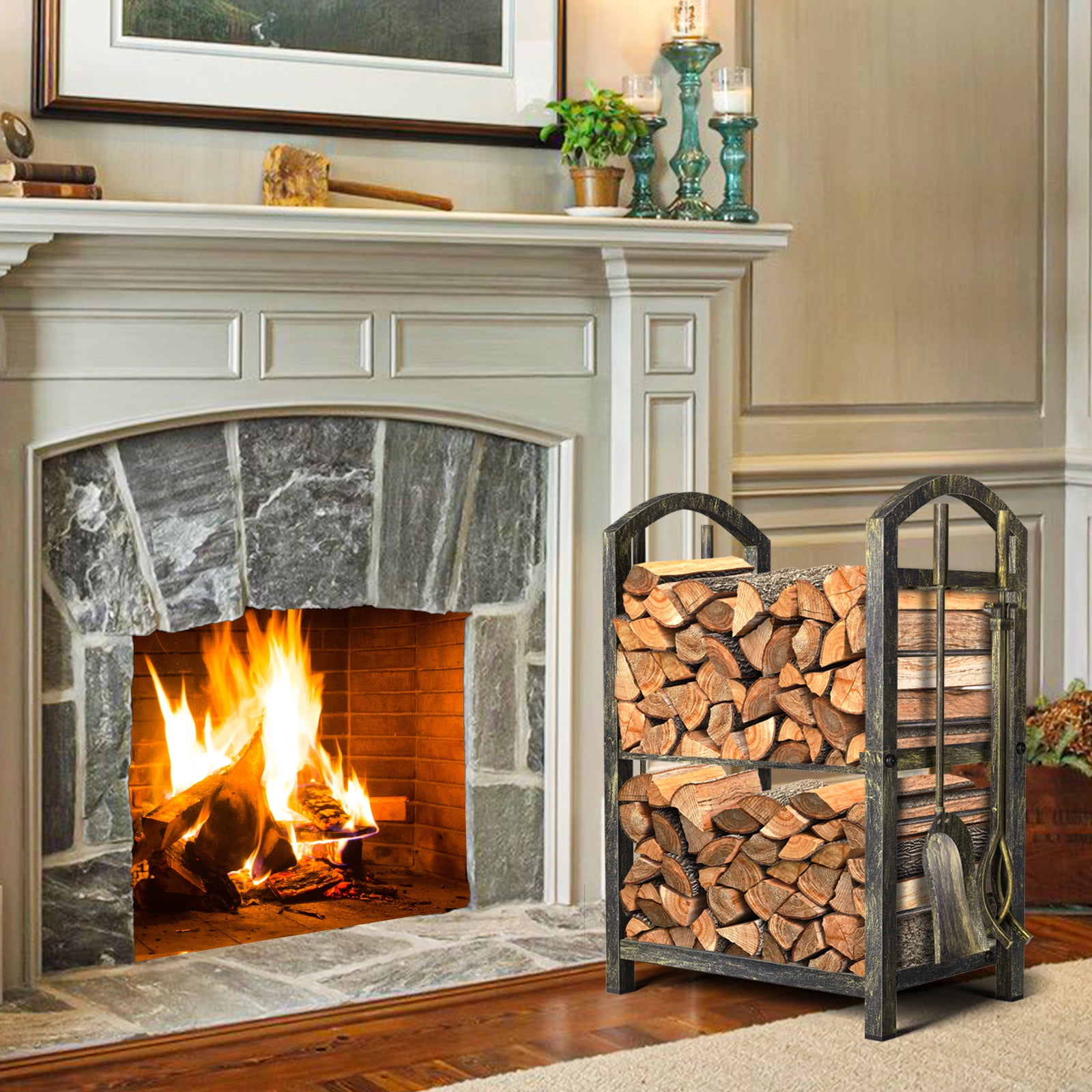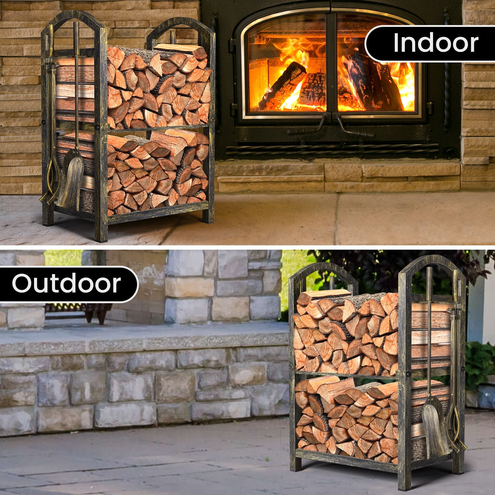 Amagabeli Durable Traditional Wrought Iron Indoor Log Rack with Tongs Durable firewood rack constructed from thickened wrought iron for stability Features two storage shelves with a frame measuring 29.1 inches high, 15.8 inches wide, and 11.8 inches deep Made from durable steel square tubing with a powder-coated finish for enhanced durability Includes premium fireplace tools: tongs, poker, brush, and shovel 2-inch high raised base allows for airflow to keep wood dry and maintain a tidy floor