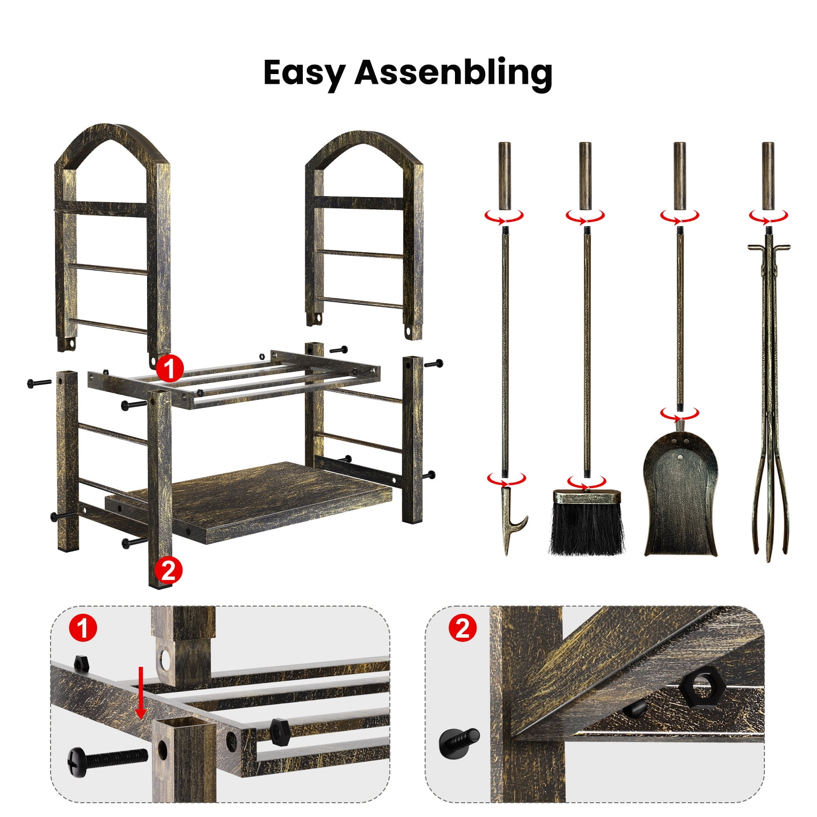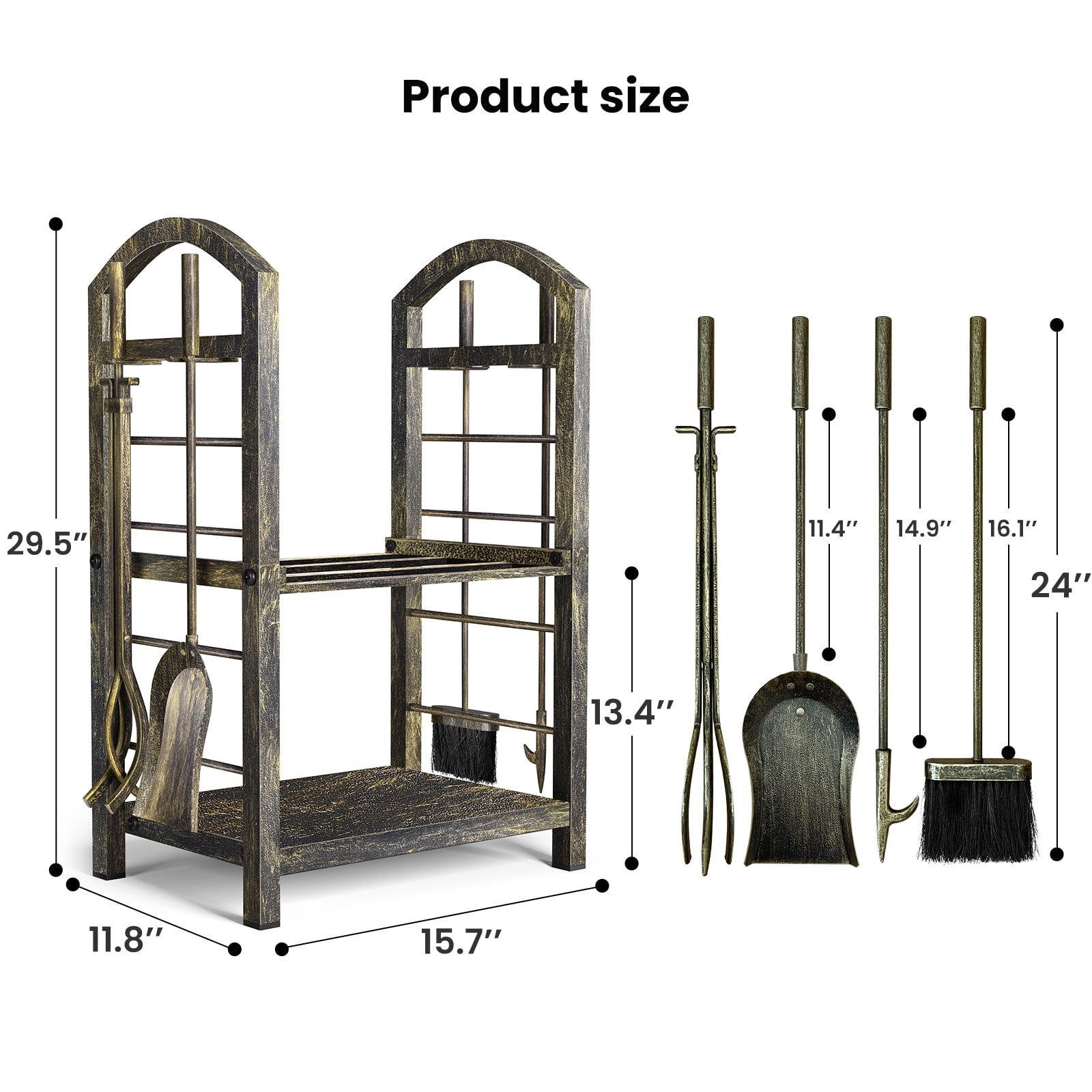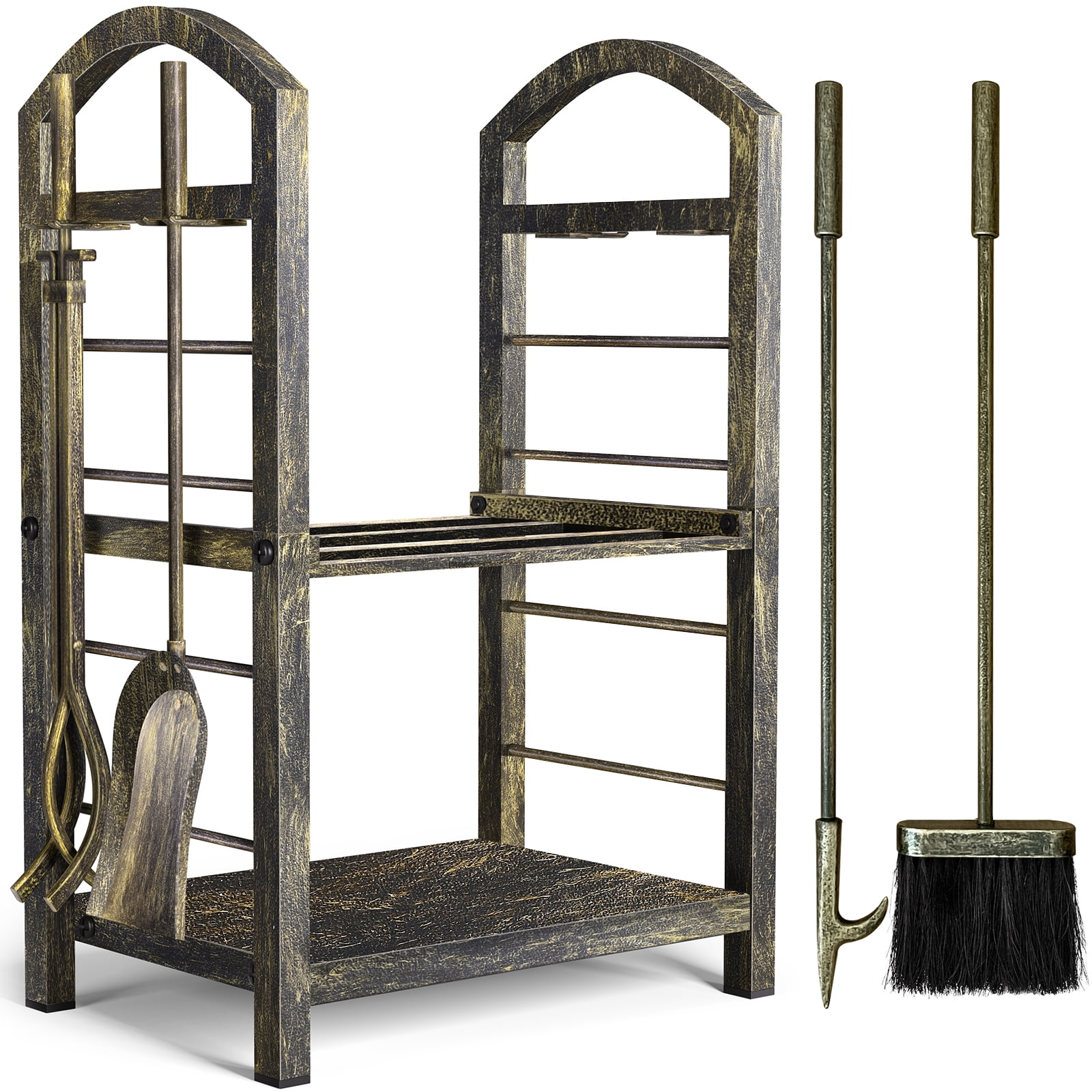 Amagabeli Durable Traditional Wrought Iron Indoor Log Rack with Tongs Durable firewood rack constructed from thickened wrought iron for stability Features two storage shelves with a frame measuring 29.1 inches high, 15.8 inches wide, and 11.8 inches deep Made from durable steel square tubing with a powder-coated finish for enhanced durability Includes premium fireplace tools: tongs, poker, brush, and shovel 2-inch high raised base allows for airflow to keep wood dry and maintain a tidy floor