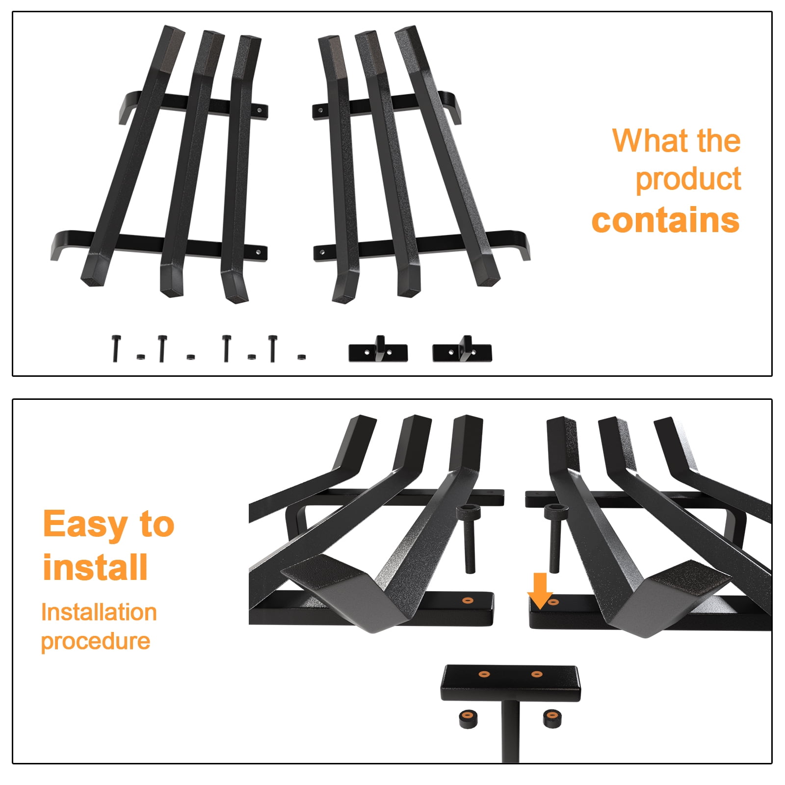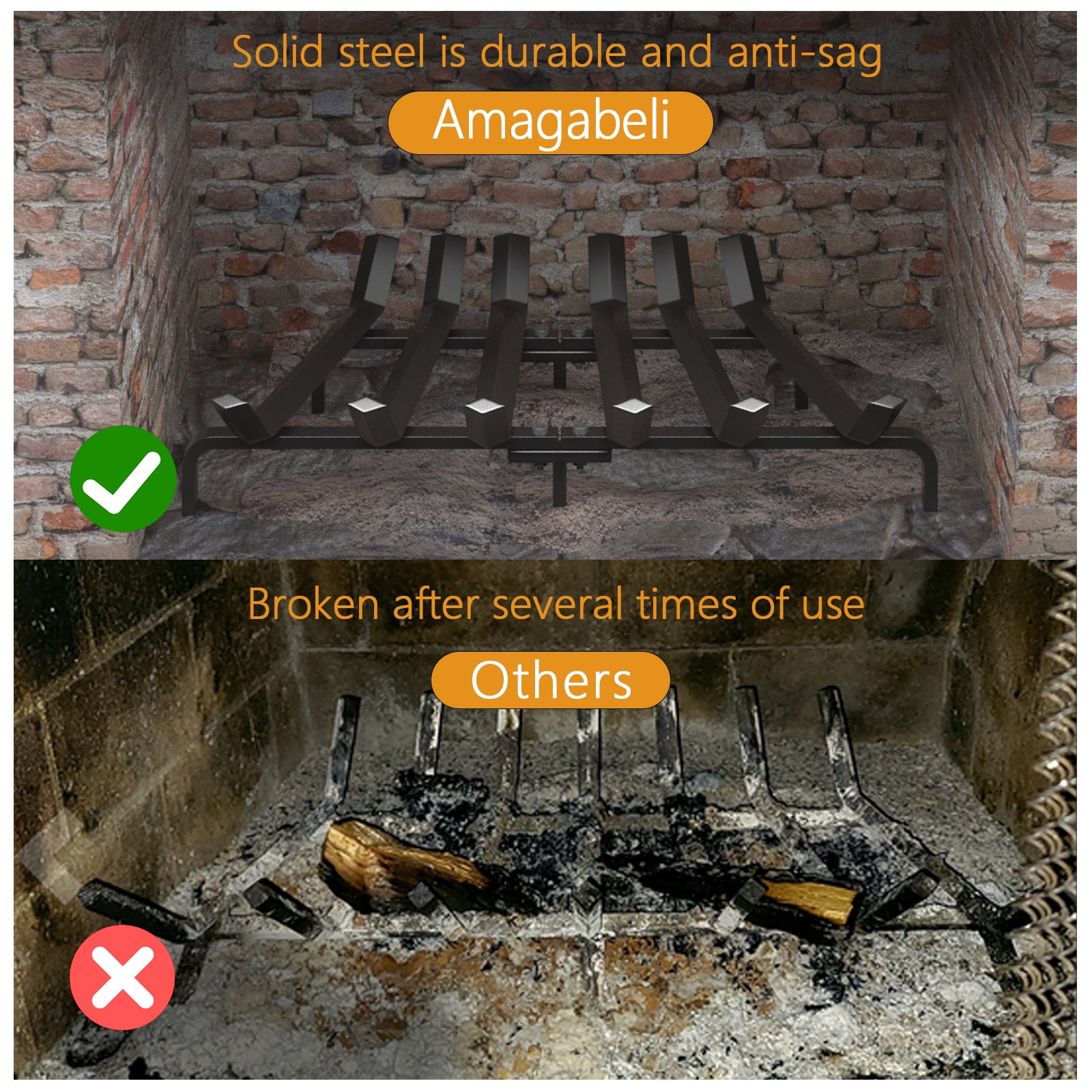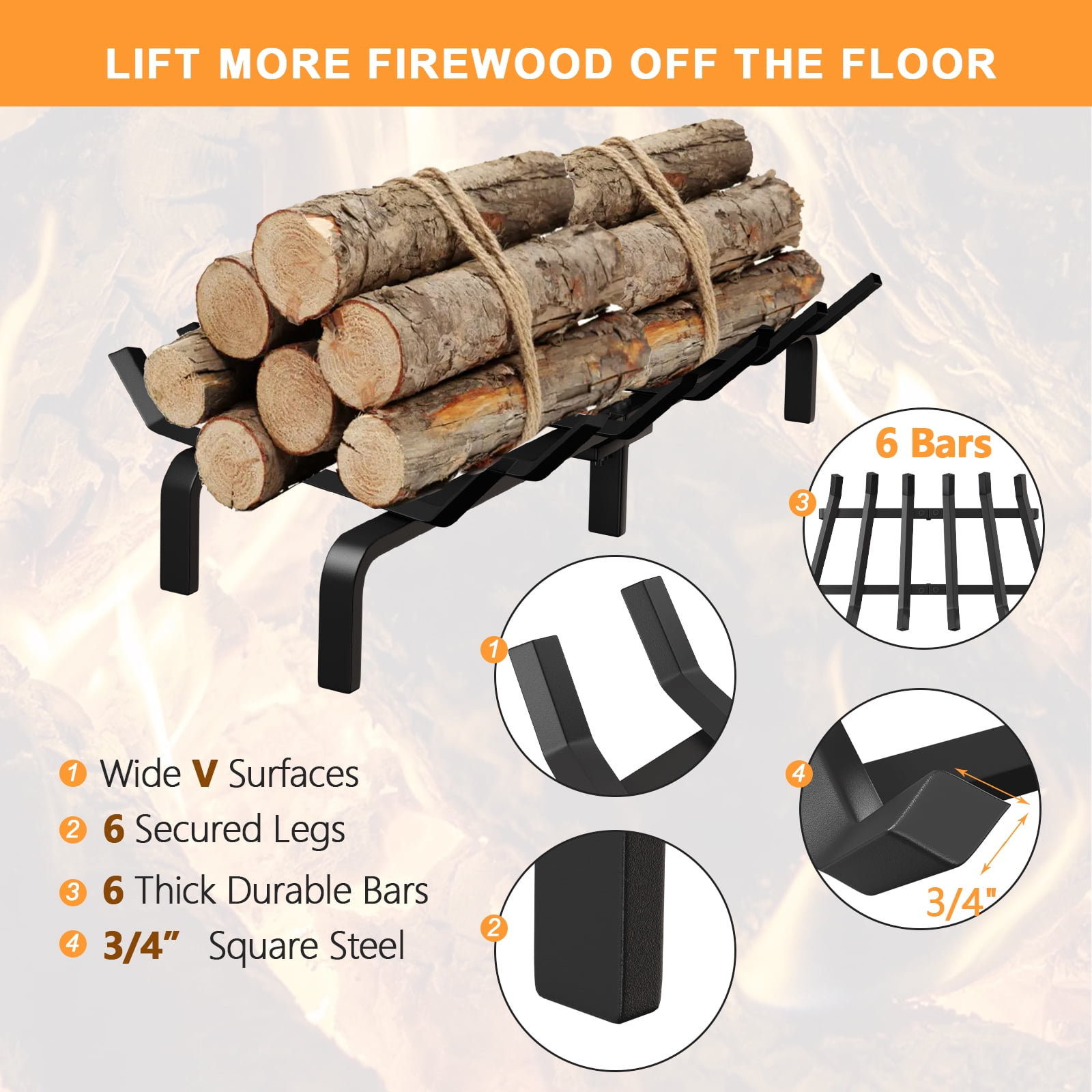 Daily burning: Fireplace log grate decorative measures 24in long x 11.25in wide x 7.5in high, liberty foundry fireplace grate clears 4in under wrought iron crossbar. lift the firewood off the chimney floor and hearth allowing air to better circulate. Thick steel structure fire place log holder rack will last a life time. Thick steel construction:7 steel bars, V-shape fire wood rack hold fire logs and kindling close to fire white birch logs for easy lighting. Wide bars wood burning fireplace tools make it more surface and easier to hold wood, coal burning securely. Solid structure: 24 inch wrought iron firewood log buring grates is crafted from thick and solid 3/4 inch square bar steel. well made metal wood rack allows the air to circulate around the logs. No assembly required:This small sturdy, heavy duty fire place log grate suitable for both indoor decorative wood burning fire places and outdoor durable fire pit grate. Customer care: We are dedicated to provide premium products for you and offer impeccable customer care to you. Don?t wait any longer and just enjoy your ideal products today! Model Name:Fireplace Grates BG014;Weight:20LB