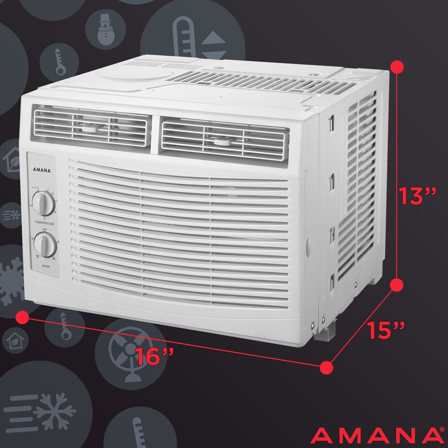 Amana 5,000 BTU 115-Volt Window-Mounted Air Conditione 150 Sq.ft., Washable Filter, AMAP050DW 5.9-ft. LCDI power cord with 3-prong grounded plug uses 115V electrical outlet 8-way directional air louvers directs the air where you need it Easy-to-install window mounting kit included Window width: 22″ min / 35″ max