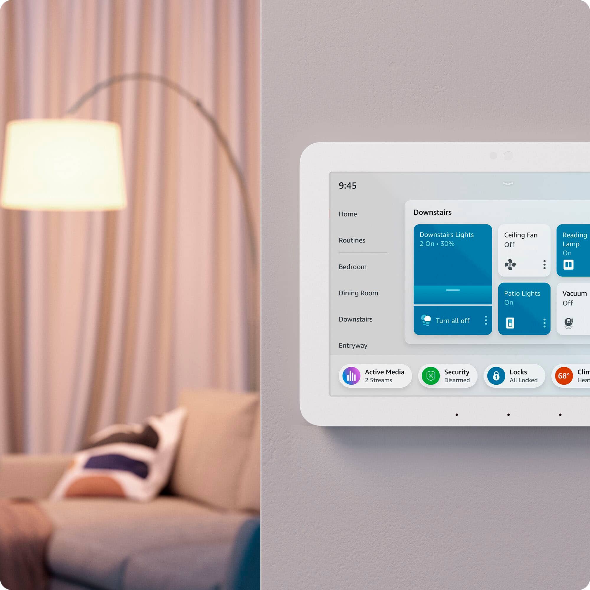An easy-to-use Alexa-enabled control panel for your smart home devices—just ask Alexa or tap the display to control lights, smart plugs, camera feeds, and more.