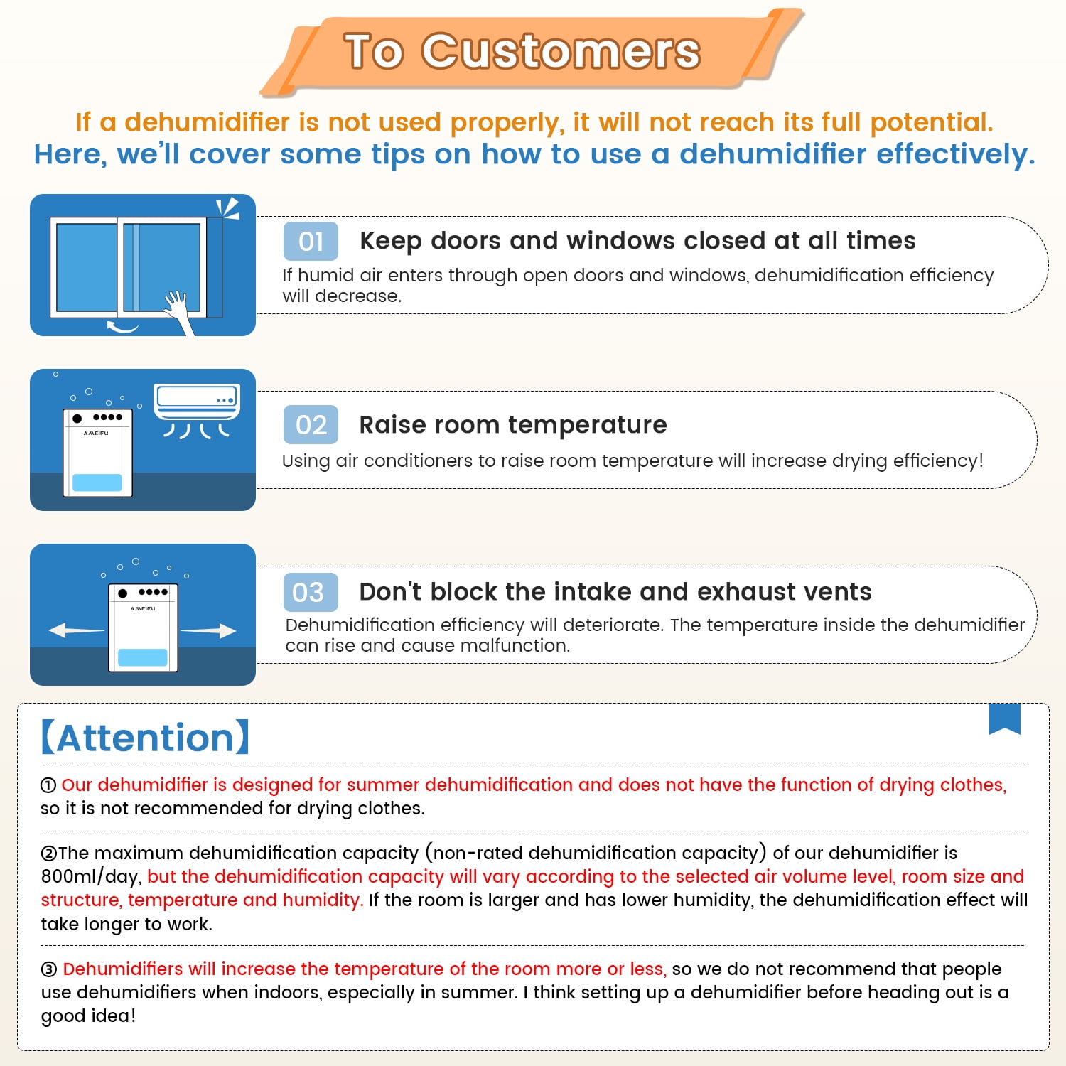 Specifications: Material: ABS Noise: ≤28 dB Water Tank: 4 L Coverage Area: 1000 Sq.ft Dehumidifier Type: Freestanding Timer Function: 1,2,4,8,12,24,48,72 Hour Dehumidification Capacity: 800ml per Day Special Feature: Quiet Operation, Sleep Mode, Automatic Shutoff, Automatic Defrost,Timer Function, 7 Color LED Light Features: Large Capacity & Efficient Dehumidification: This dehumidifier is designed for a space of 1,100 Sq.ft and is equipped with a 135-ounce water tank, which can effectively deal with humidity problems in large rooms. Its powerful dehumidification performance can quickly absorb excess moisture in the air to create a dry and comfortable indoor environment. It is especially suitable in excessive humidity basements, living rooms, bedrooms, or offices. Intelligent Automatic Shutdown: The device has a built-in precise humidity sensing system. When the water tank is full, the dehumidifier will automatically stop running to avoid the risk of water tank leakage or overflow caused by excessive dehumidification. The red indicator light will flash to remind you to empty the water tank. It’s safe to use even when you’re not at home. Ultimate Silent Experience: The working noise is as low as 28 decibels, which is quieter than a library environment, ensuring that while providing efficient dehumidification services, it creates a quiet and undisturbed living or working space for you, Whether you are resting at night, working intensively, or entertaining, you can be sure that you will not be disturbed by any noise. 7-Color LED Ambient Light: The dehumidifier has built-in 7-color LED lights, which can be switched freely according to personal preferences or scene needs, adding a warm and unique visual charm to your home. Whether it is a romantic dinner moment, a relaxing reading time, or a peaceful bedtime atmosphere, you can find the right lighting tone to integrate practical functions and artistic beauty perfectly. Timing Function: The dehumidifier is equipped with a multi-time timing function (1h, 2h, 4h, 8h, 12h, 24h, 48h, 72h) to create a dry environment for you as you wish. Such a variety of timing options are only for you to easily enjoy the right comfortable humidity in different scenarios so that the quality of life can be taken to a higher level. Convenient Operation & Maintenance: The user-friendly control panel design makes setting and operation simple and easy. The water tank is designed to be user-friendly and easy to remove, empty and clean, ensuring that the dehumidifier can continue functioning stably. In addition, the equipment also has an automatic defrost function to eliminate the worry of frost accumulation and ensure continuous normal operation. Packages Included: 1 x Dehumidifier 1 x Water Tank 1 x Power Adapter 1 x User Manual