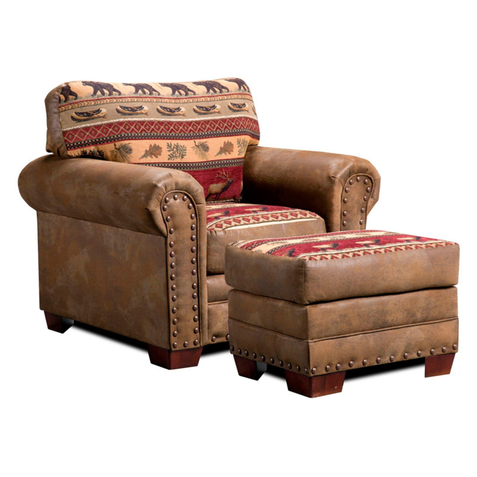 Bring the warmth and comfort of a Sierra Mountain Lodge into your home. Quality construction, featuring solid wood frames and solid wood legs, ensures years of enjoyment. Lodge-inspired tapestry, coupled with beautiful nail head accents, spice up the rustic appeal of this ottoman. Soft, but supportive, cushions are filled with high-density foam and a layer of fiber wrap. This is a perfect ottoman for your den or living room. Features : Materials: Microfiber, solid wood Finish: Brown Leather look solid color microfiber with lodge look cotton tapestry fabric Comfortable foam seat is wrapped with fiber for a comfortable seat Nail head accents bring a rustic look to this group Solid wood legs The fabric on this item is NOT pet friendly. Returns resulting from pet damage will not be allowed. Frames are warranted to be free from defective materials and manufacturing defects for a period of one year from the date of purchase under normal household use Springs and straps are warranted against breakage caused by metal fatigue or spring clips pulling loose from the frame for a period of one year All cushions are warranted against loss of resiliency for a period of one year from the date of purchase All cushions will soften and conform to the shape of the user This is considered normal wear and not loss of resiliency or a defect Fabric is warranted to be free of defects in material and workmanship for a period of one year The warranty does not cover tears, burns, stains, flattening of nap, pilling, fading or shrinking and is not valid when heavy soiling or abuse is evident Any damage resulting from chemical treatment or improper cleaning is also excluded from this warranty Under this warranty, the manufacturer, at its option, will repair or replace any part or parts found to be defective Specifications : Product Dimensions : 19″H x 26.5″W x 20″D Product Weight : 40 lbs