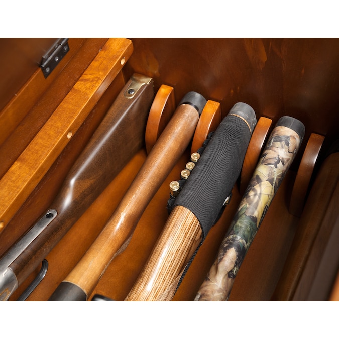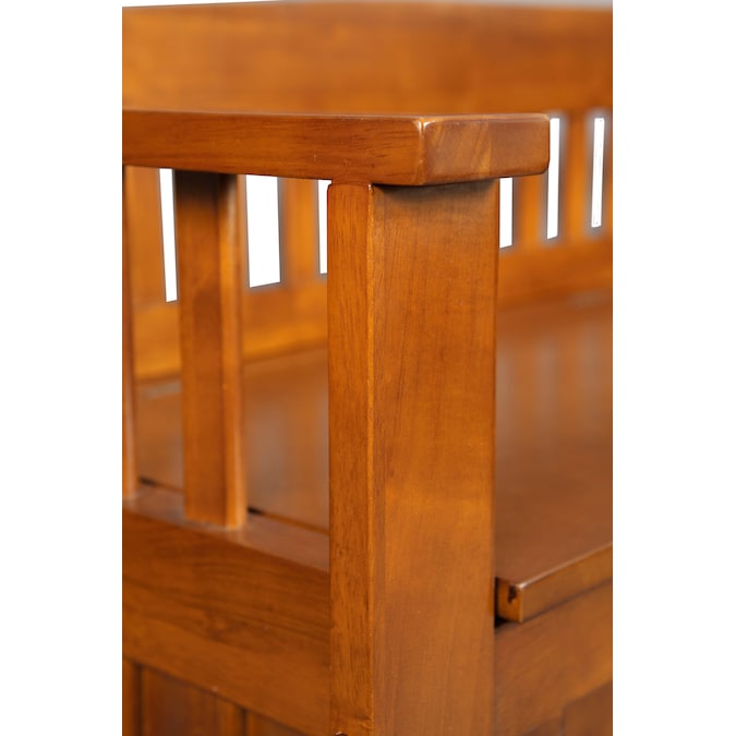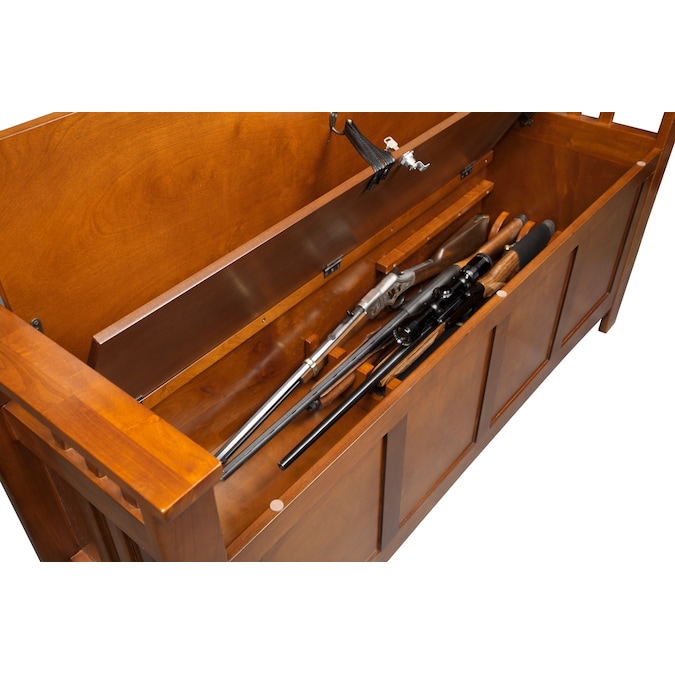 This entryway bench is both attractive and multi functional. There is storage below the seat which includes a clever, lockable long gun storage area. Also includes a removable storage tray and striking slat styling.