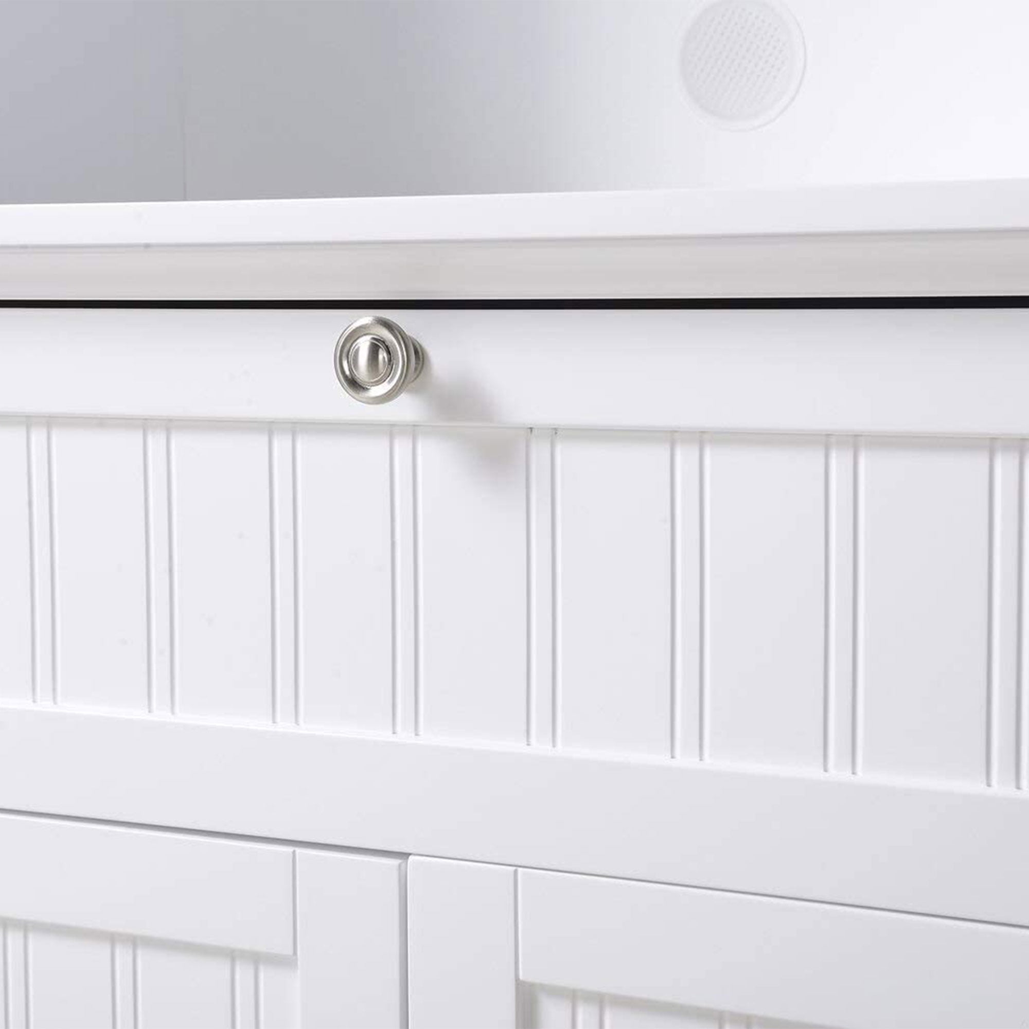 Materials: Paper laminate wood Finish: White Durable White Painted, Raised Panel, Vein Lined doors. Soothing white laminate side panels and shelves. Spacious drawer on high quality nylon and metal drawer guides. Doors feature durable, high quality white paint over medium density fiberboard. Brushed aluminum finished door and drawer pulls. One adjustable and removable shelf behind doors. Tapered front rails and arched kick panel. Work area measures 25.5 wide by 15.75 deep