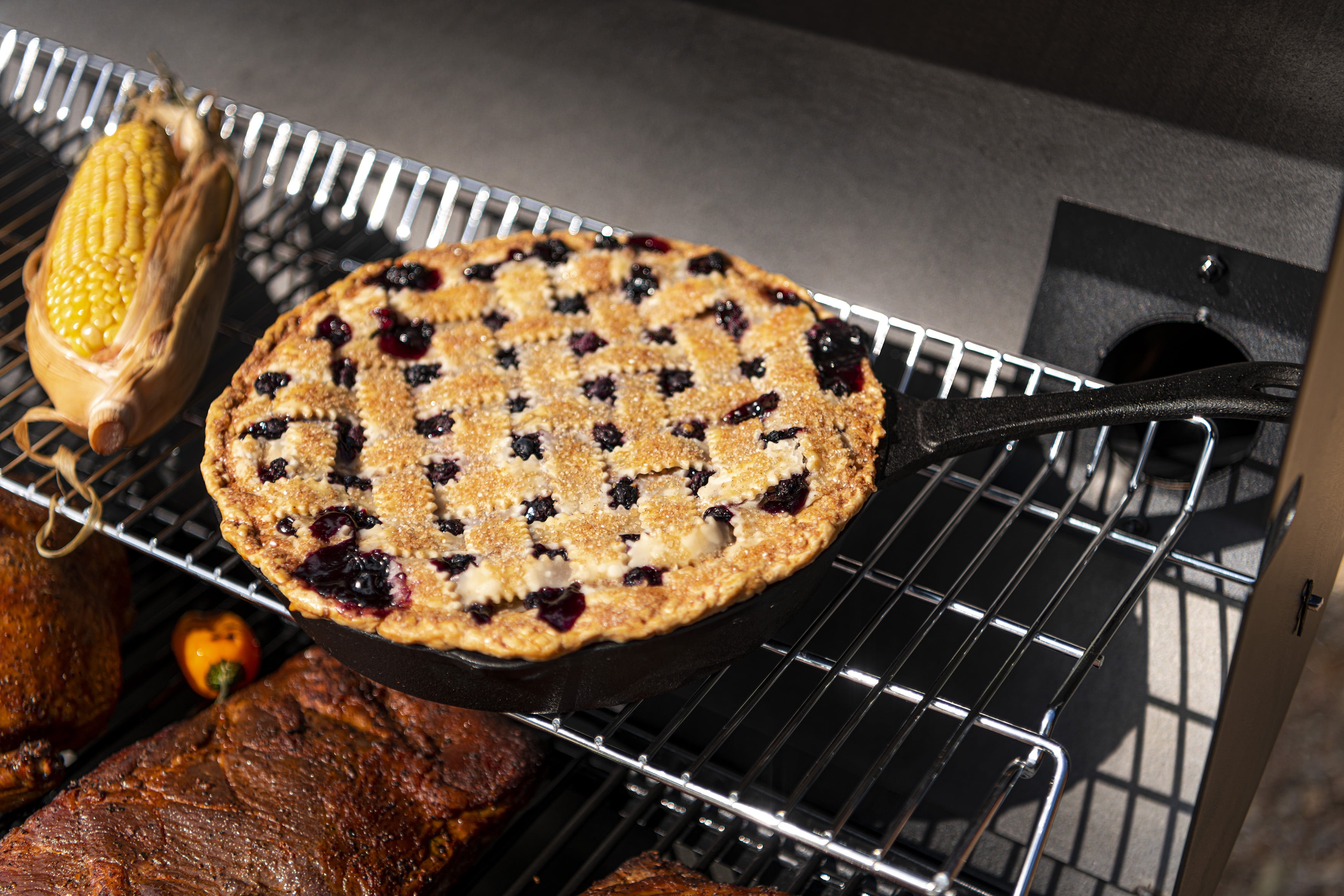 1,280-square-inches of total cooking space Multiple dampers to easily control heat and smoke Lid-mounted temperature gauge to monitor heat Four-level height adjustable charcoal tray for cooking versatility Cool-touch handle on lid Front shelf for convenient work space Three porcelain-coated cooking grates for rust-resistance Firebox door for ash removal Wheels for easy mobility