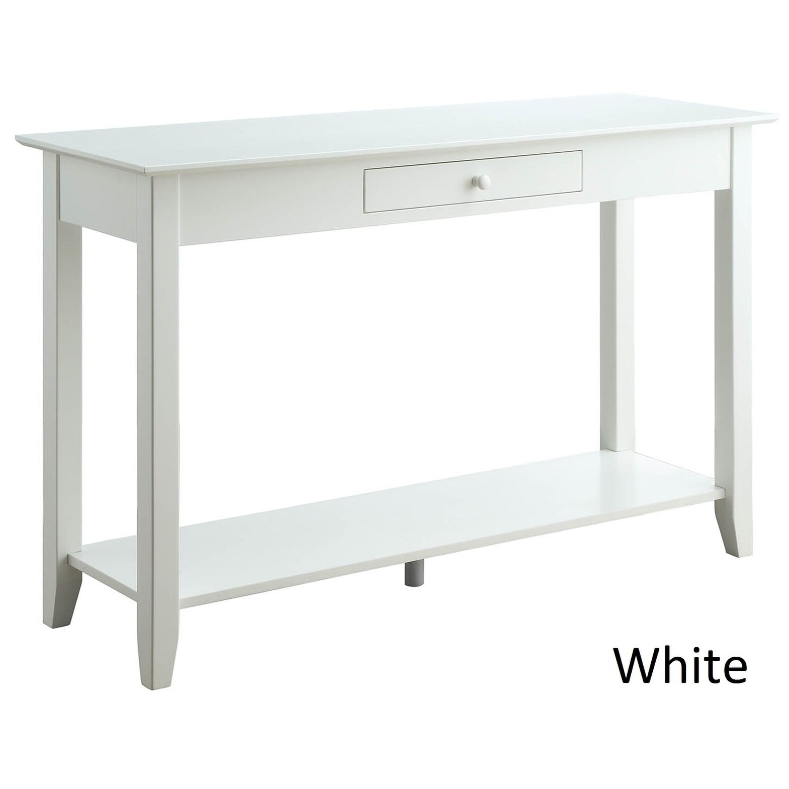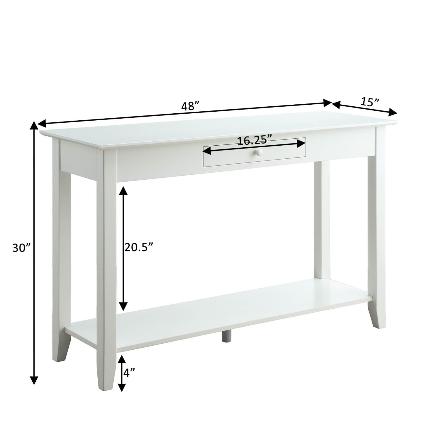 In a classic American style that will fit any decor, the American Heritage Console Table from Convenience Concepts is a great choice for any home. Featuring a drawer for concealed storage and a bottom shelf that is perfect for collectibles. Whether you use it in the living room or any other room it’ll be sure to make a statement. Made of wood, this table is built to last for many years of enjoyment.Now available in multiple finishes. Features: Beautiful white wood finish Bottom Shelf for Additional Storage Material: Solid Pine Wood Legs, Birch Veneer, MDF Quick and Easy Set Up Features one drawer Fits Easily with Any Decor Will Provide years of enjoyment 30″ H x 48″ W x 15″ D Specifications: Product Dimensions: 30″ H x 48″ W x 15″ D Product Weight: 37