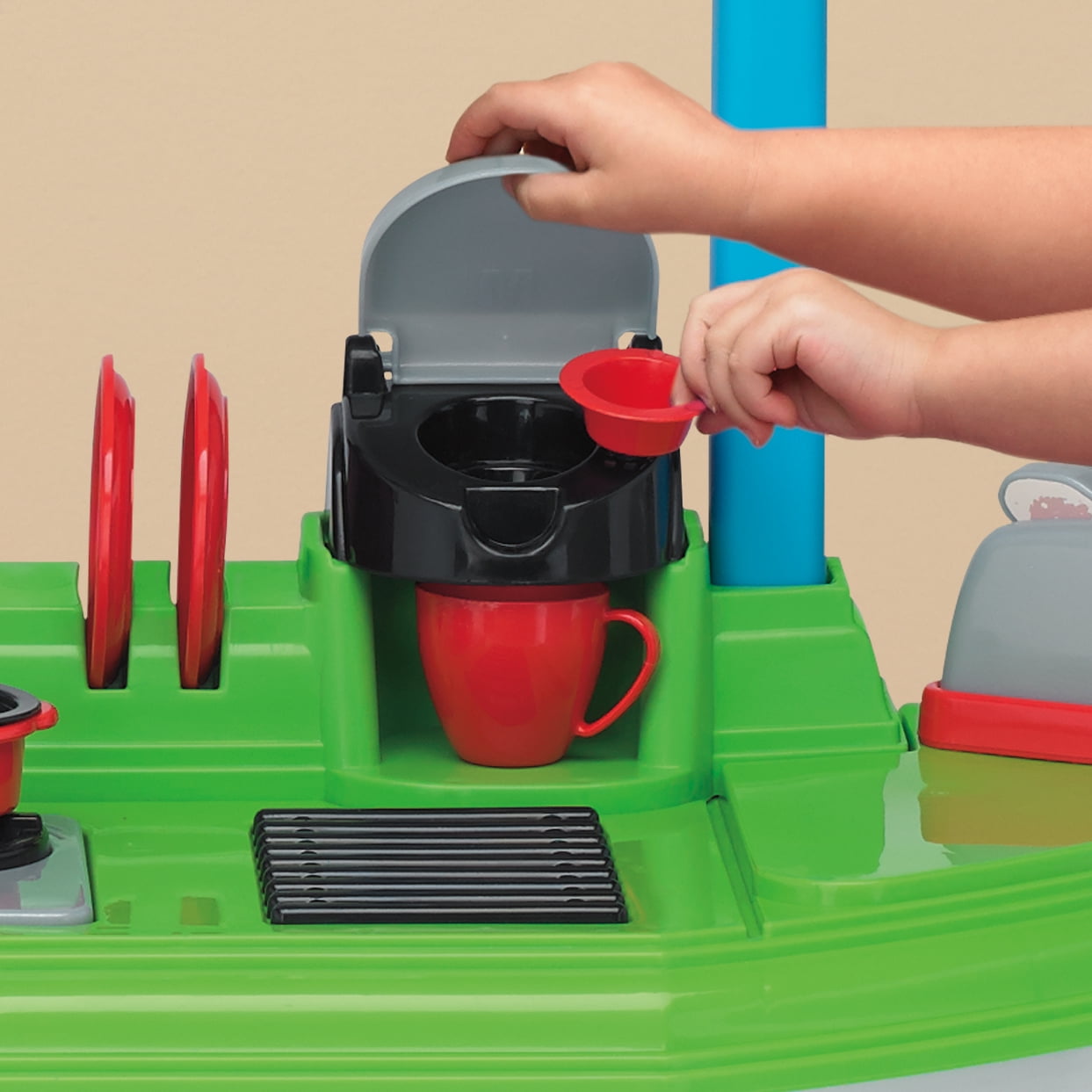 Cozy Comfort Play Kitchen with 22 Piece Accessory Play Set Unisex Indoor & Outdoor Toy for Kids Ultra-modern design Features single-cup coffee machine, microwave, refrigerator, oven, and toaster Realistic raised burner that lights up and make sounds when pots and pans are placed on it Easy, snap-together assembly No trimming or clipping required Includes 22 play kitchen accessories: plates, cups, forks, knives, spoons, toast, muffin tin, pan with lid, cell phone, spatula, large spoon, strainer spoon, and strainer Appliance doors open and close to enhance interactive play Recycling and play bins optimize storage space Constructed with BPA and phthalate-free plastic Encourages role play Dimensions (L x W x H): 28.50 x 11.62 x 34.12 inches Made in Michigan & Mississippi For ages 3+