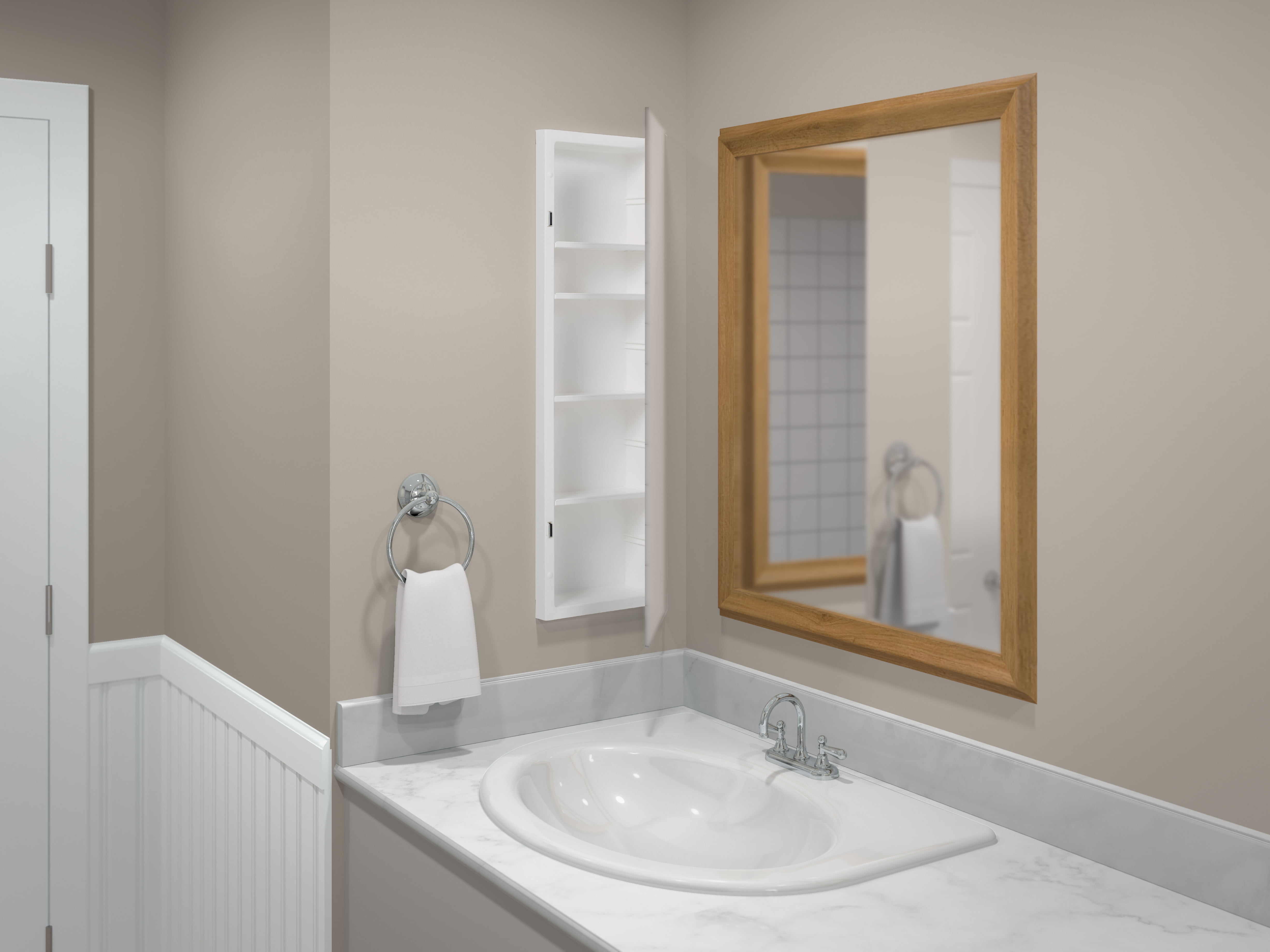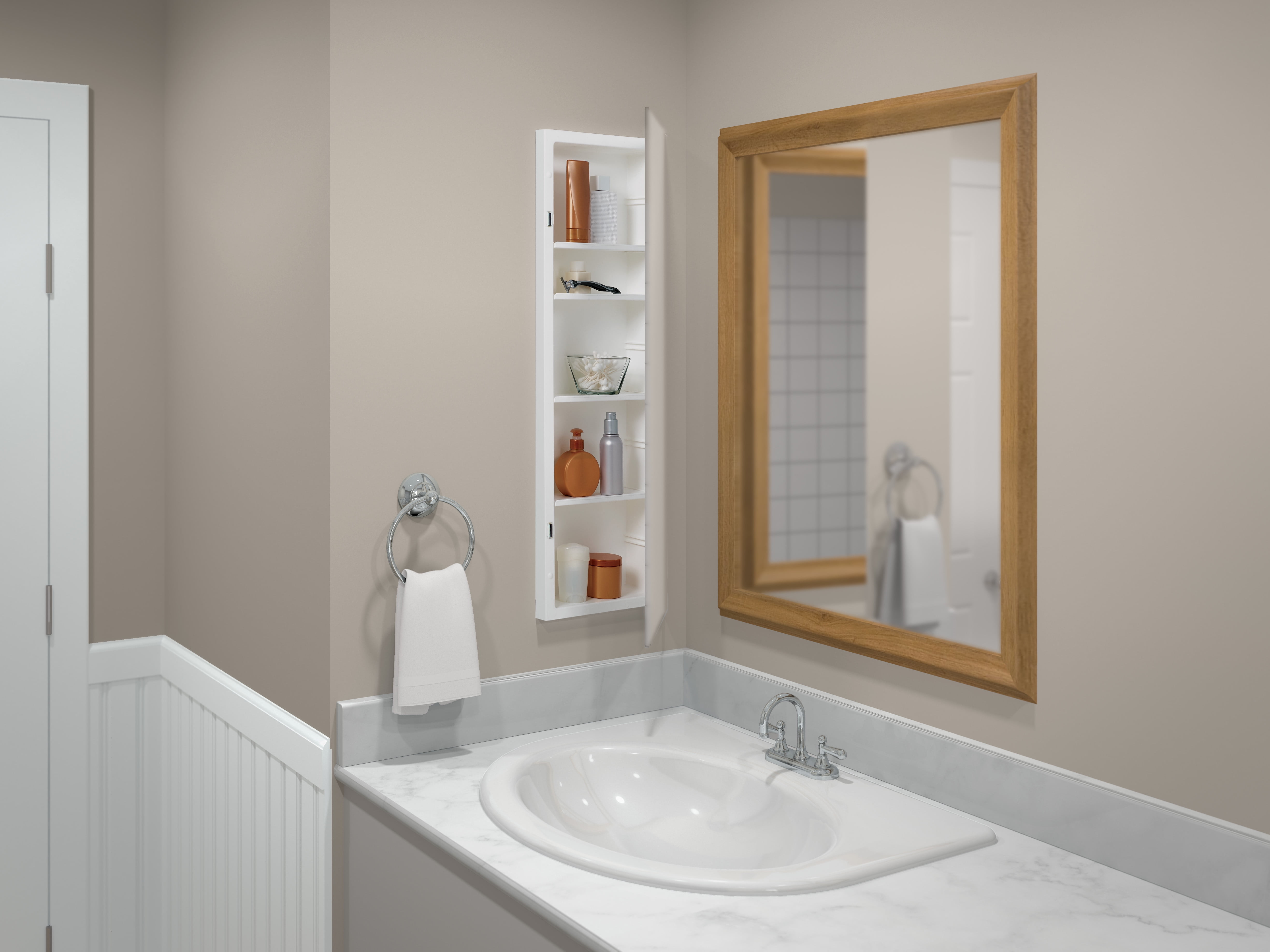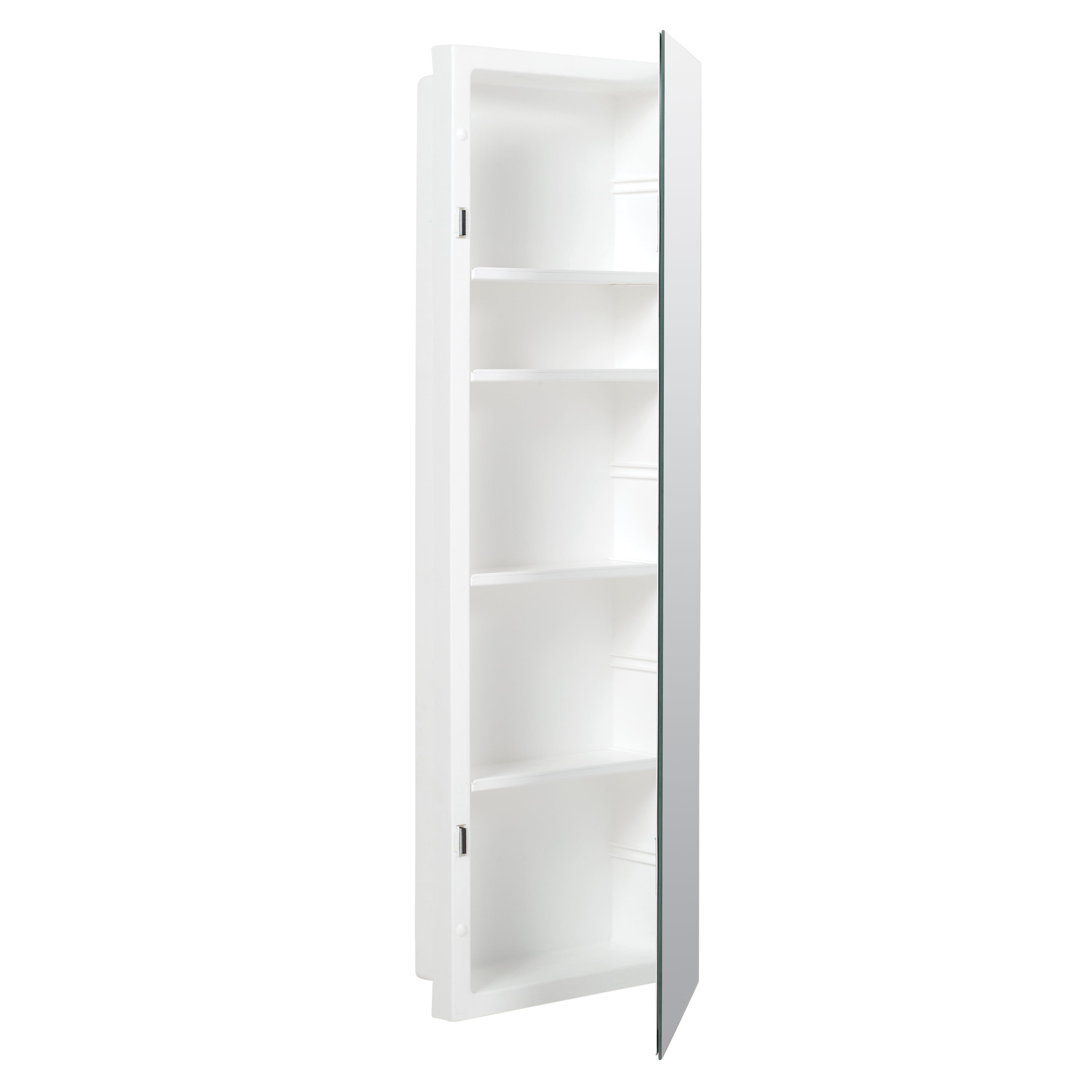 Medicine cabinet has an injection molded white plastic body for long-lasting use Cabinet’s frameless mirror door with polished edges complements any bathroom décor Features a secure galvanized piano hinge and 2 magnetic catches for easy opening and closing Cabinet has 4 adjustable plastic shelves and 1 fixed bottom shelf Reversible design allows choice of left or right-hand door opening during installation; made for recess-mount installation