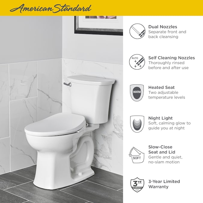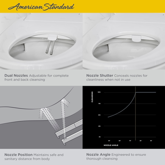 No bathroom is complete without the aqua wash 2.0 manual SpaLet bidet seat from American Standard. This sleek bidet seat promises an unparalleled cleansing experience and improved personal hygiene, right in your own home. Designed for thorough cleansing and personal comfort, the dual nozzles direct water to both front and rear areas for an exceptionally fresh and clean feeling. Especially welcome during pregnancy and postpartum, the aqua wash 2.0 manual bidet seat pampers with a soothing, adjustable warm-water spray and heated seat. Easy-to use side dial and seamless lid design make the aqua wash 2.0 manual SpaLet bidet seat ideal for the whole family and a sleek addition to your bathroom.