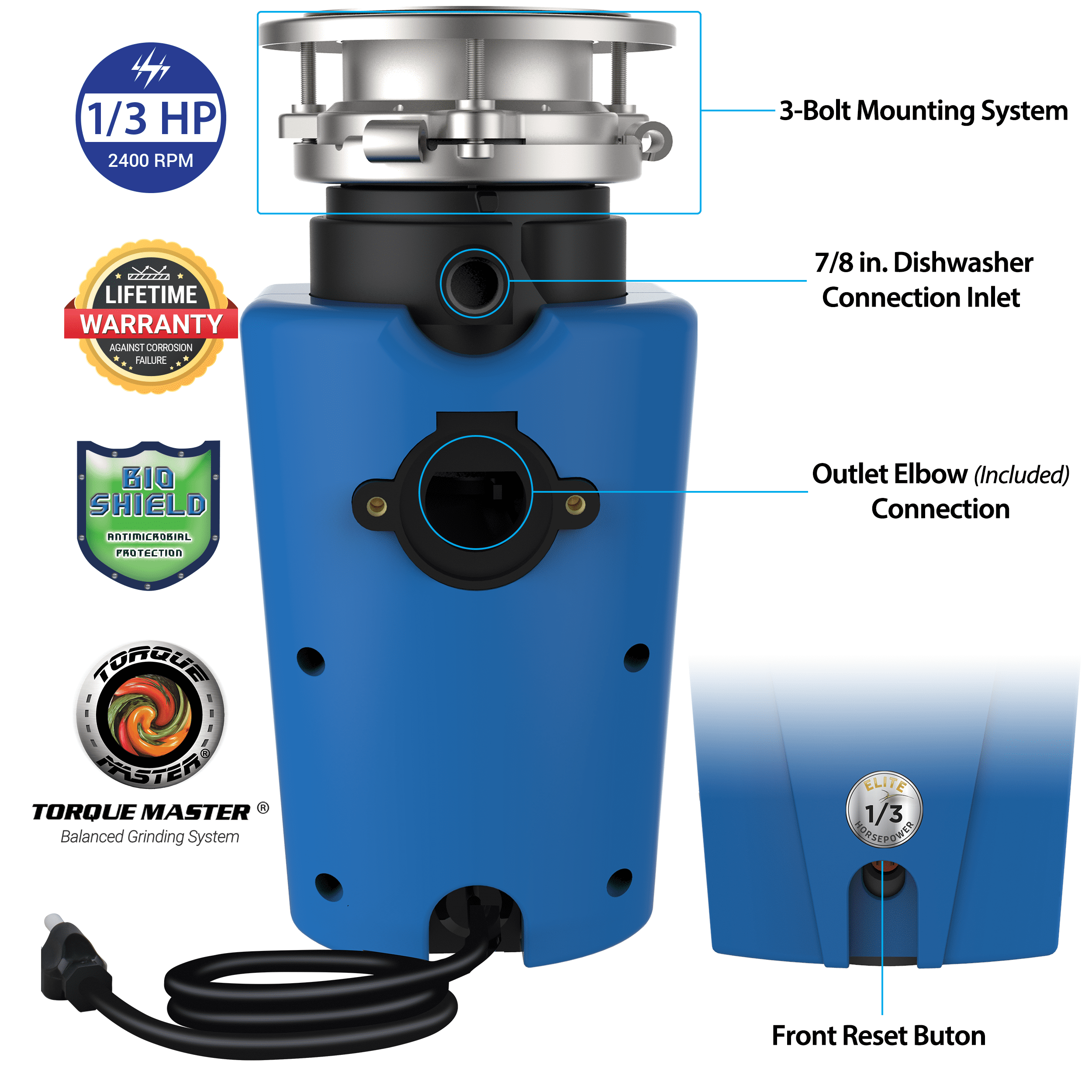The American Standard Elite 10-US-ASE-30, 1/3 HP continuous feed garbage disposal with power cord offers a high torque permanent magnet motor and features anti-microbial protection against odor. The torque master balanced grinding system means a smooth and quiet operation. The disposer comes with a 3-bolt mount system for quick installation and fast replacement of pre-existing 3-bolt mount disposers. The disposal also comes with a removable splash guard for easy cleaning and bulk food insertion. The all stainless-steel grinding components means a lifetime warranty against corrosion failure.