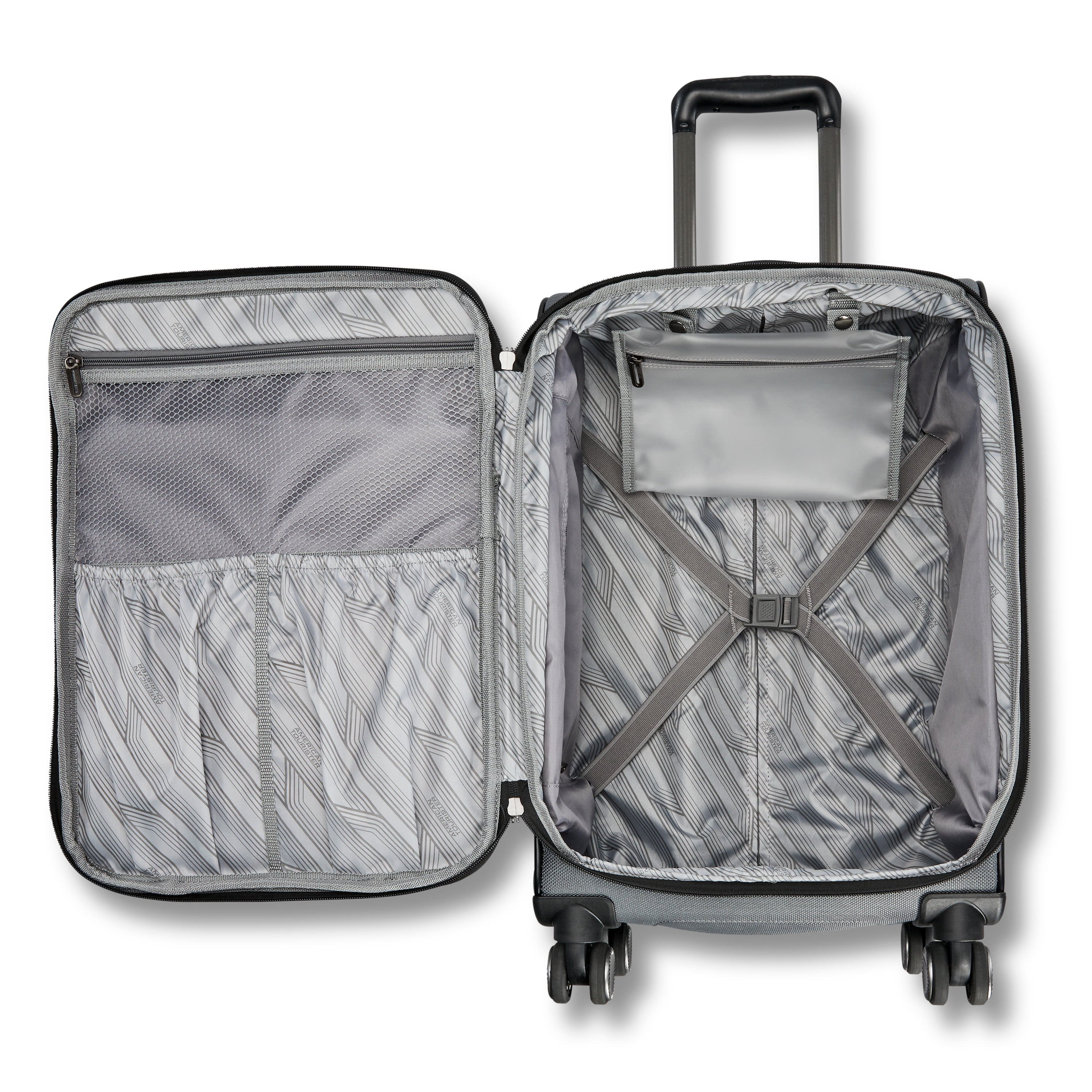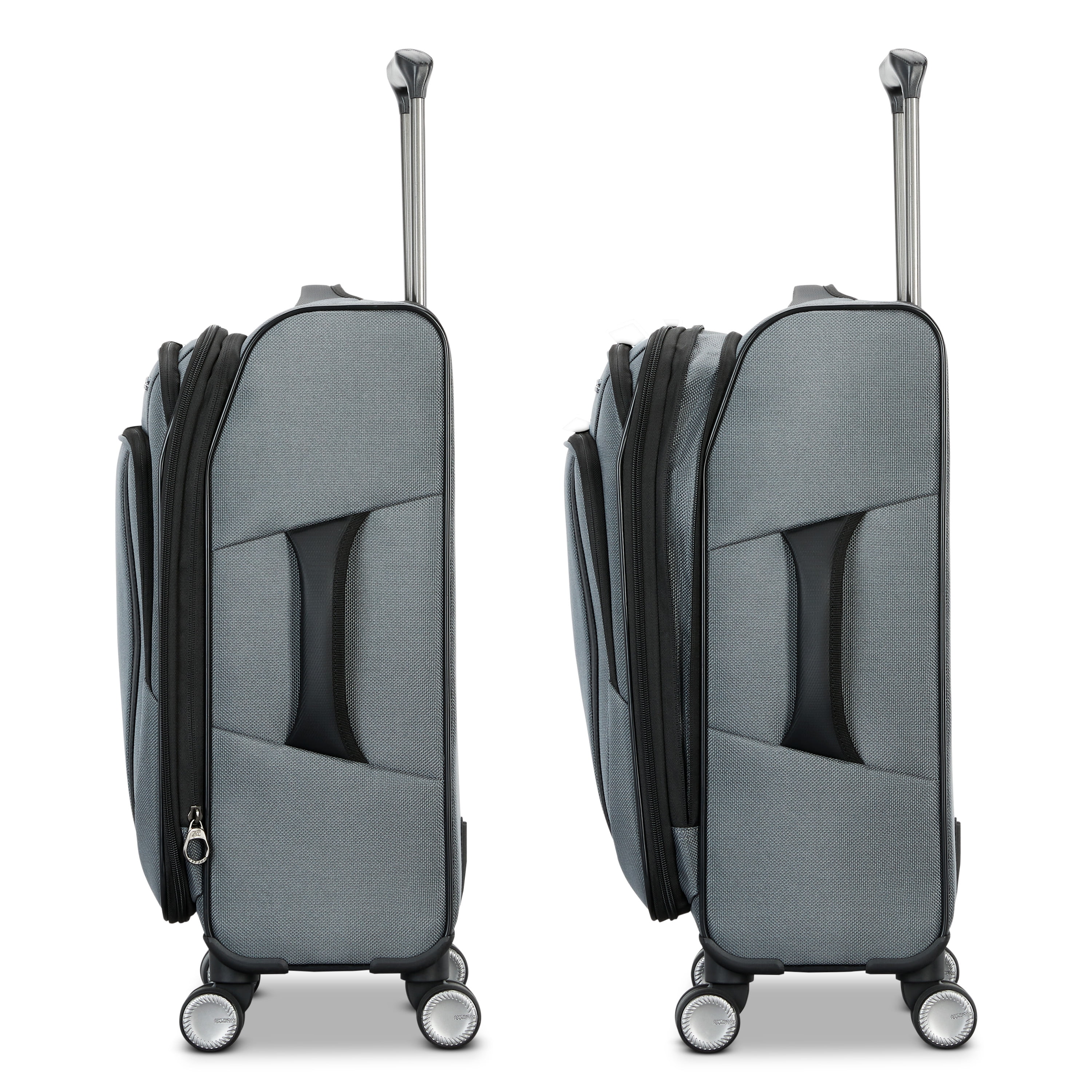 Push-button locking handle adjusts to multiple heights Dual spinner wheels offer 360-degree effortless maneuverability on any surface Rugged polyester with carbon fiber trim accents and gunmetal hardware creates a subtle and sophisticated finished look Max-capacity interior, including a modesty pocket, mesh zipped door pocket, removable wet pocket and elastic tie tapes All cases expand 1″