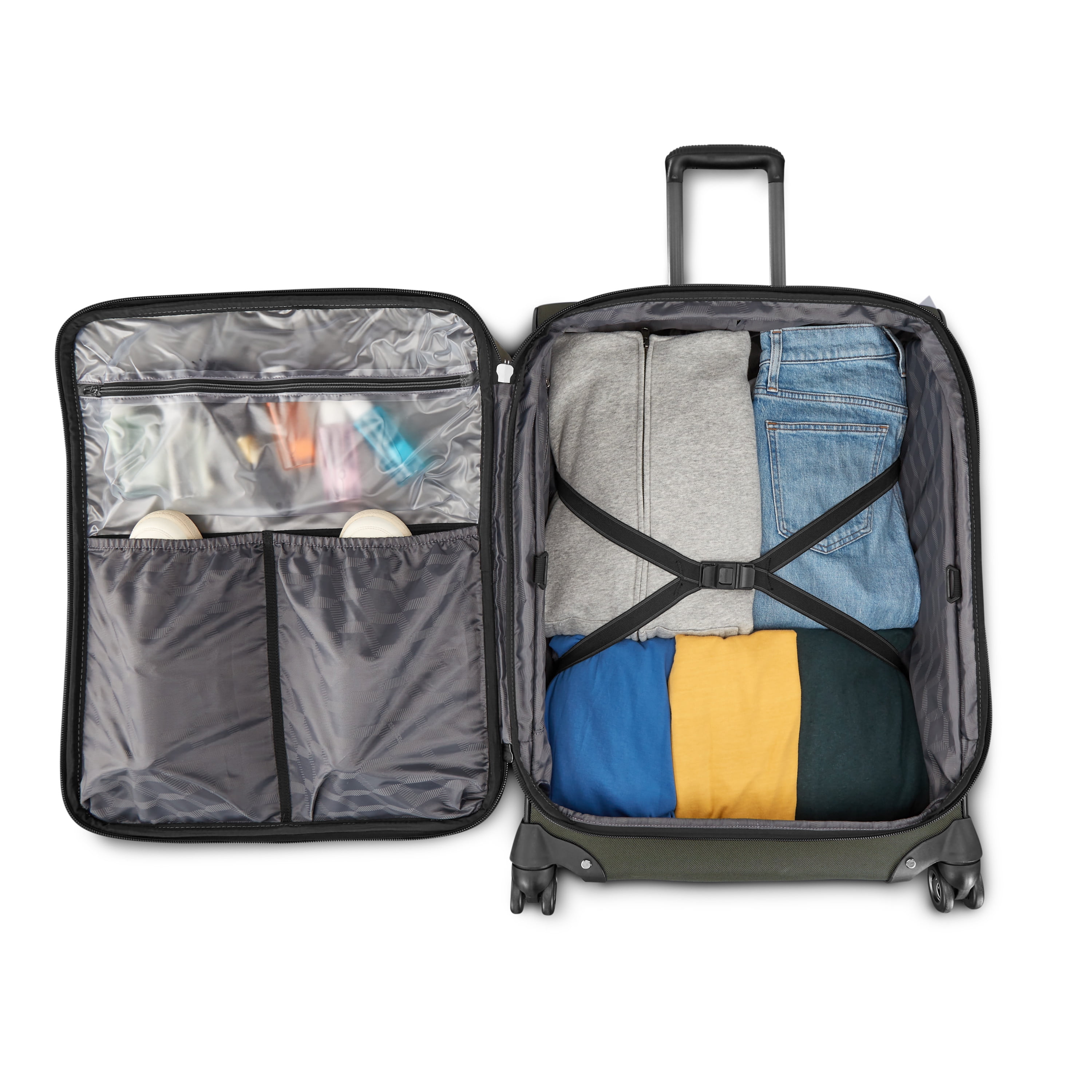 Large sized checked luggage Durable Polyester Softside Right Heightâ„¢ handle with wipe-clean TPR Membrane Double wheel with fender rubber corner guards and textured kickplates for extra durability 3 cargo style external pockets PLUS internal zippered wet pocket, zippered modesty pocket and shoe pockets Smart Fixâ„¢ Organization Buckles