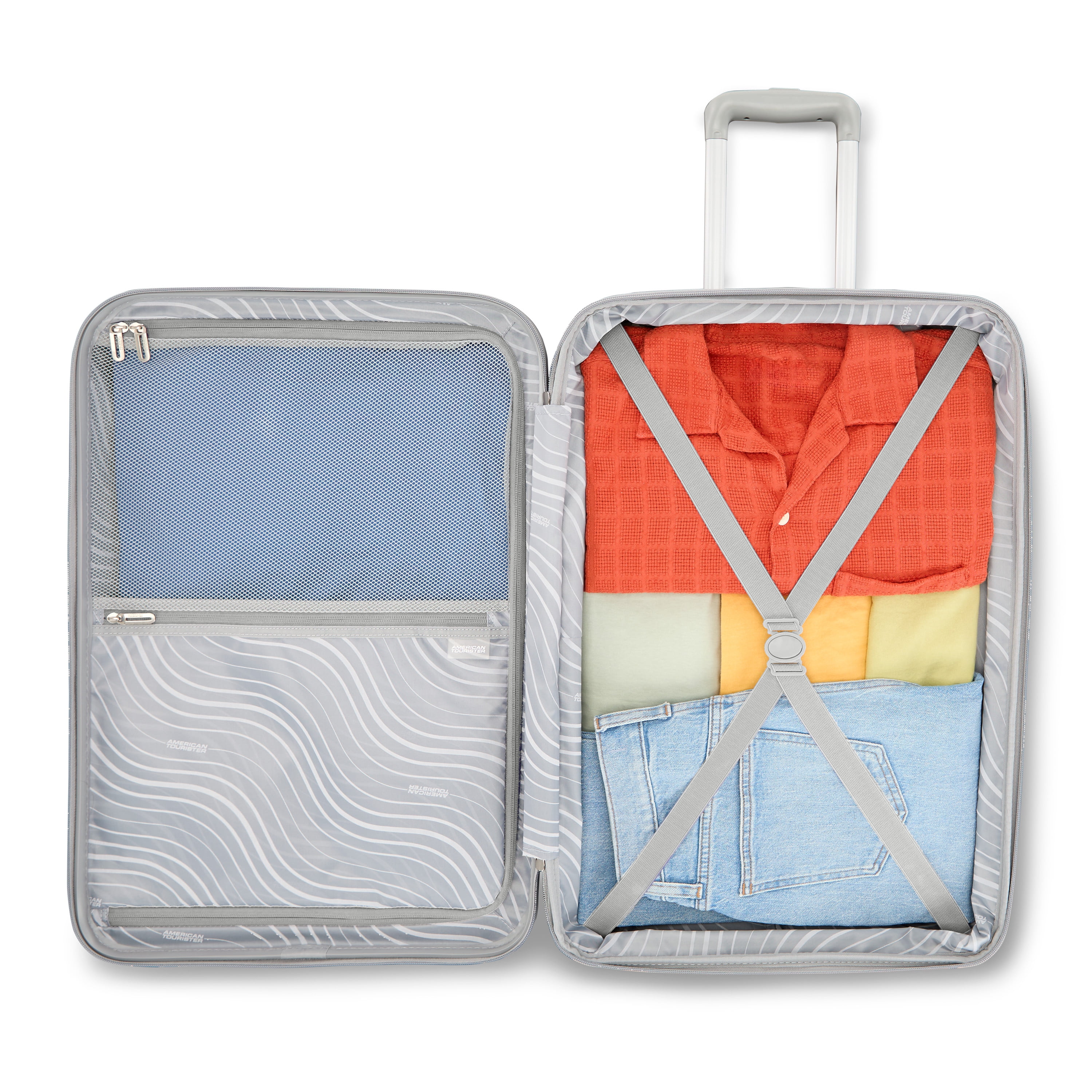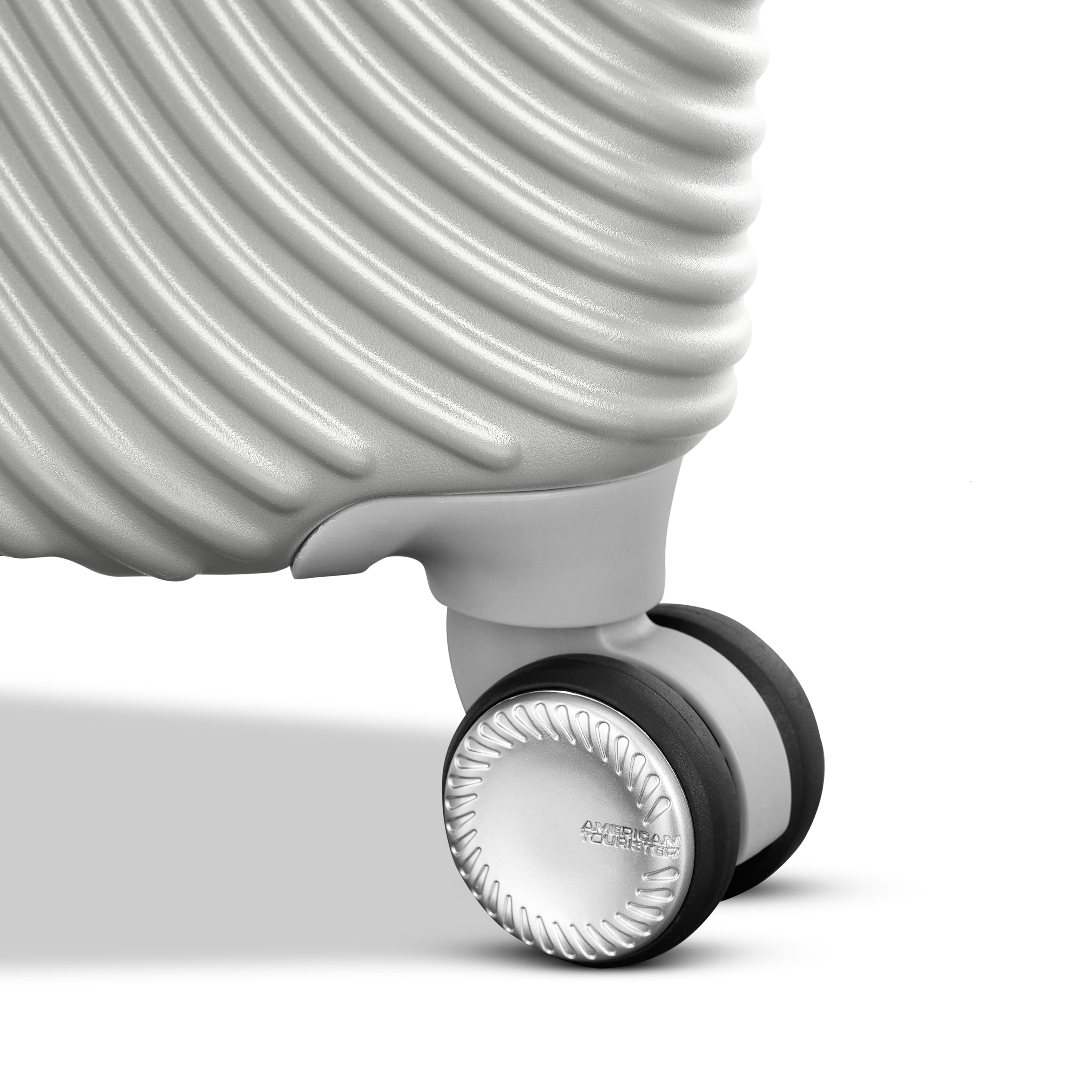 Equipped with 360-degree Dual Spinner Wheels, the American Tourister Waves luggage moves smoothly in all directions RightHeight handle system adjusts to multiple one inch increments for travelers of any size Interior elastic cross straps keep belongings in place during travel Interior panel features a zippered modesty pocket for storing small items Durable yet lightweight, this suitcase is scratch resistant to keep your luggage looking great trip after trip