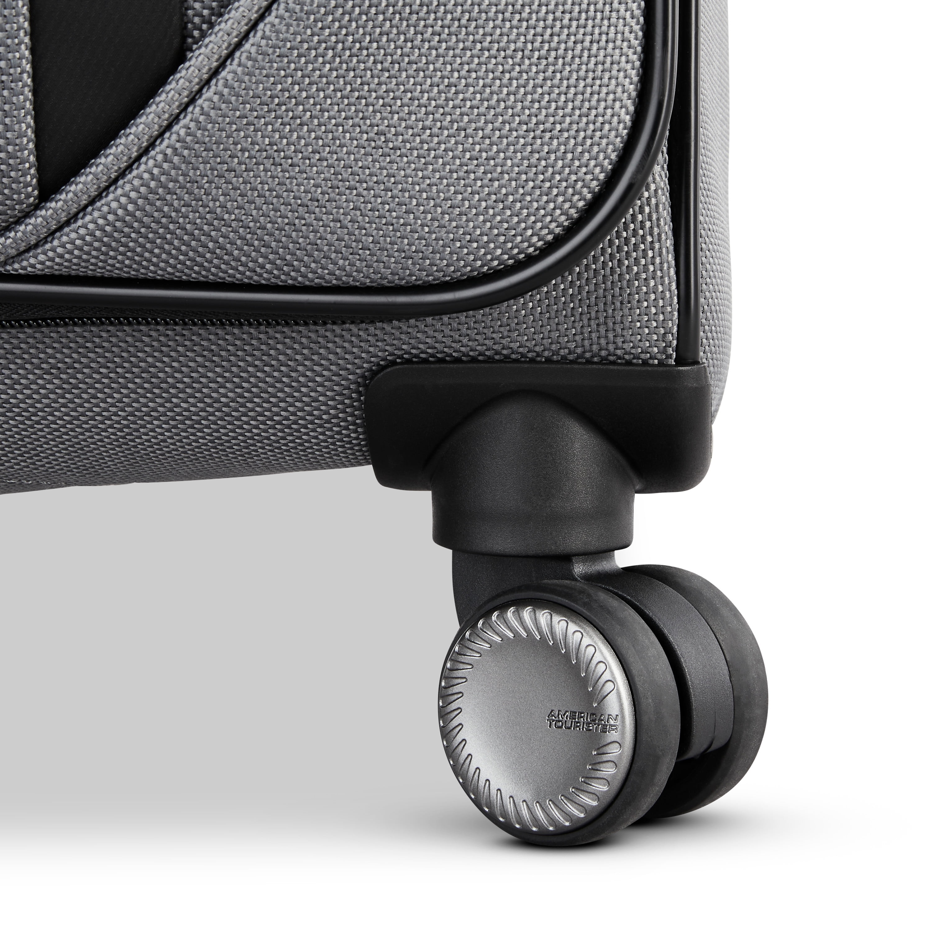 Push-button locking handle adjusts to multiple heights Dual spinner wheels offer 360-degree effortless maneuverability on any surface Rugged polyester with carbon fiber trim accents and gunmetal hardware creates a subtle and sophisticated finished look Max-capacity interior, including a modesty pocket, mesh zipped door pocket, removable wet pocket and elastic tie tapes All cases expand 1″
