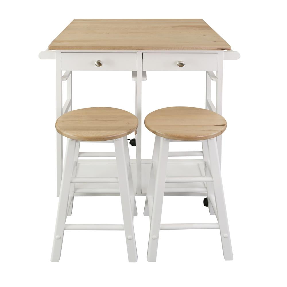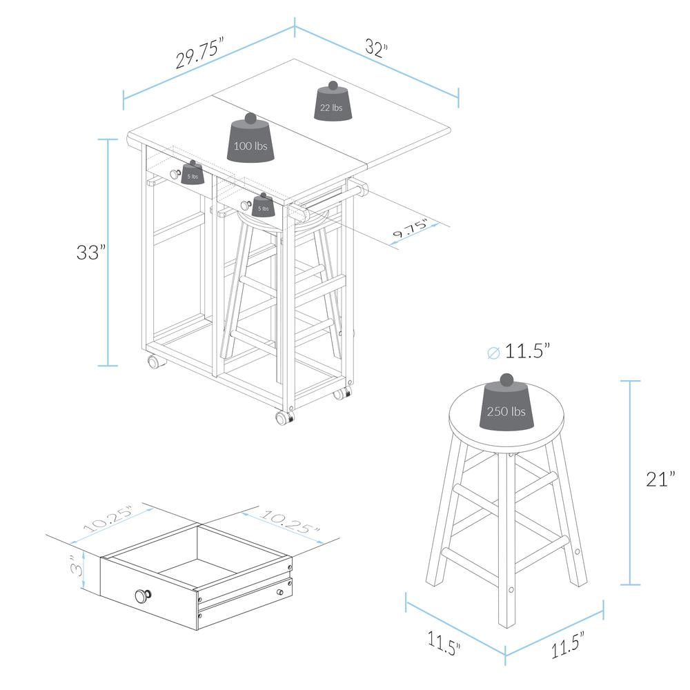 Breakfast Cart with Drop-Leaf Table, American Maple Top, Square – White This very attractive Drop-Leaf Breakfast Cart is made of solid wood. Stylish and functional, it’s sure to bring a smile to your morning. Featuring a space-saving design with a drop-leaf table top, two drawers, and two towel bars for when you need them. Lockable wheels provide stability and mobility on any occasion. Set includes table and two stools. Integrated stool nesting storage design. 2 towel racks serve as a convenient place to hang your towels. Lockable wheels provide mobility and stability. Solid wood construction for increased durability and longevity. Light and easy assembly. Dimensions: Table: 32″W x 29.75″D x 33″H; Stool : 11.5″W x 11.5″D x 21″H – Color/Finish: Two-Tone (Natural Top, White Base) – Item Weight: 49.25 – Primary Material: Maple (Top), Pine (Base) – Weight Capacity(lbs): 100 lbs (Top) 22 lbs (drop leaf)5 lbs (per drawer)250lbs (per Stool)