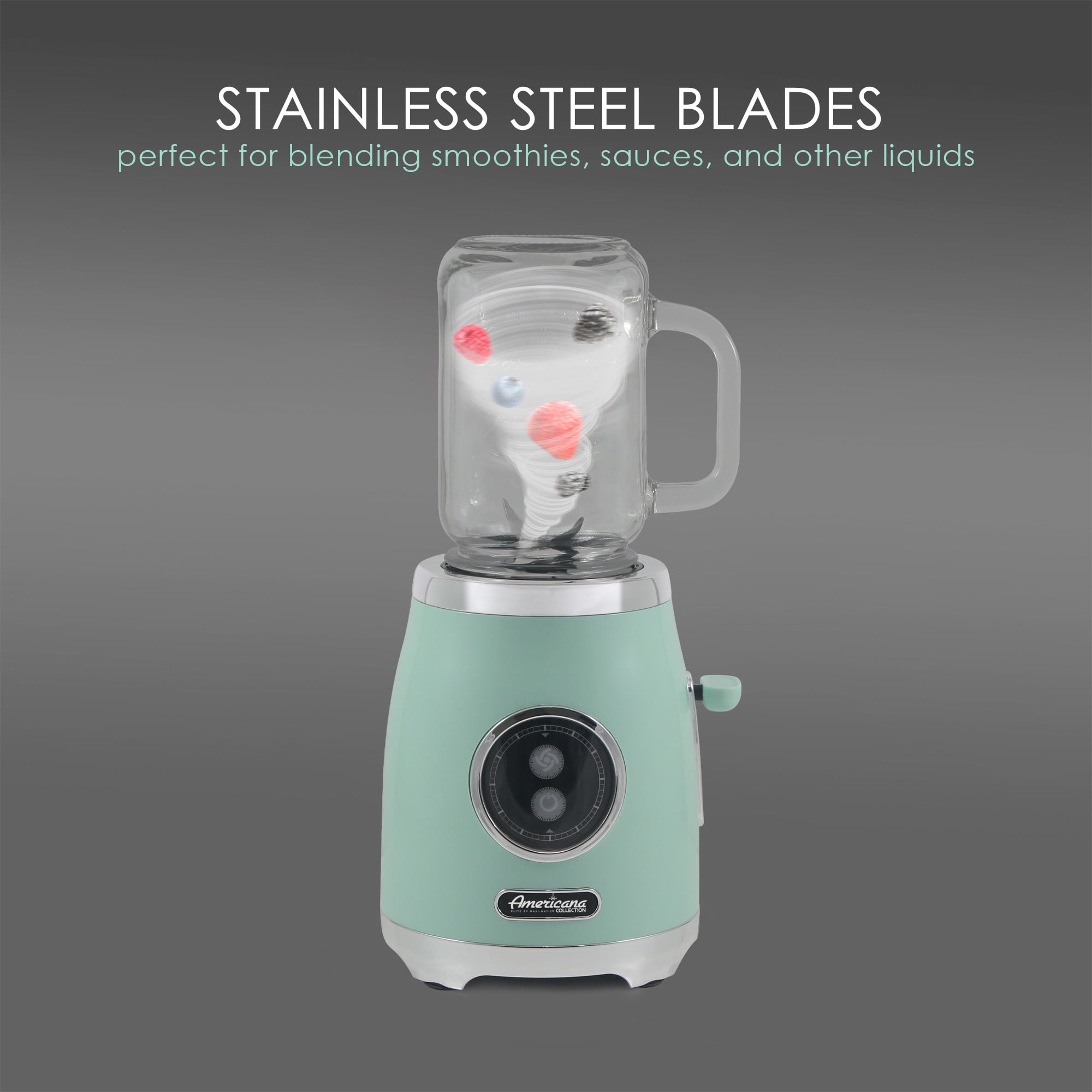 Enjoy your favorite shakes, fruit smoothies, or power packed protein drinks with the Americana Collection by Maxi-Matic Retro Personal Blender. Comes with one 16 oz glass mason jar & lid and a 20 oz sports bottle with drinking lid so you can enjoy your tasty creations on the go. The blender has a powerful 300 W motor and is easy to store. The handy pulse lever makes it easy to start and stop the machine. The power indicator illuminates when the blender is ready to use and the operating light lets you know the machine’s in operation. Easily blend, Make smoothies, Crush ice Easy to use pulse lever Includes blender base, 17oz glass mason jar with lid, 20 oz sports bottle with lid, Blade assembly with stainless steel blades Overheat protection Power and blending light 300 watts