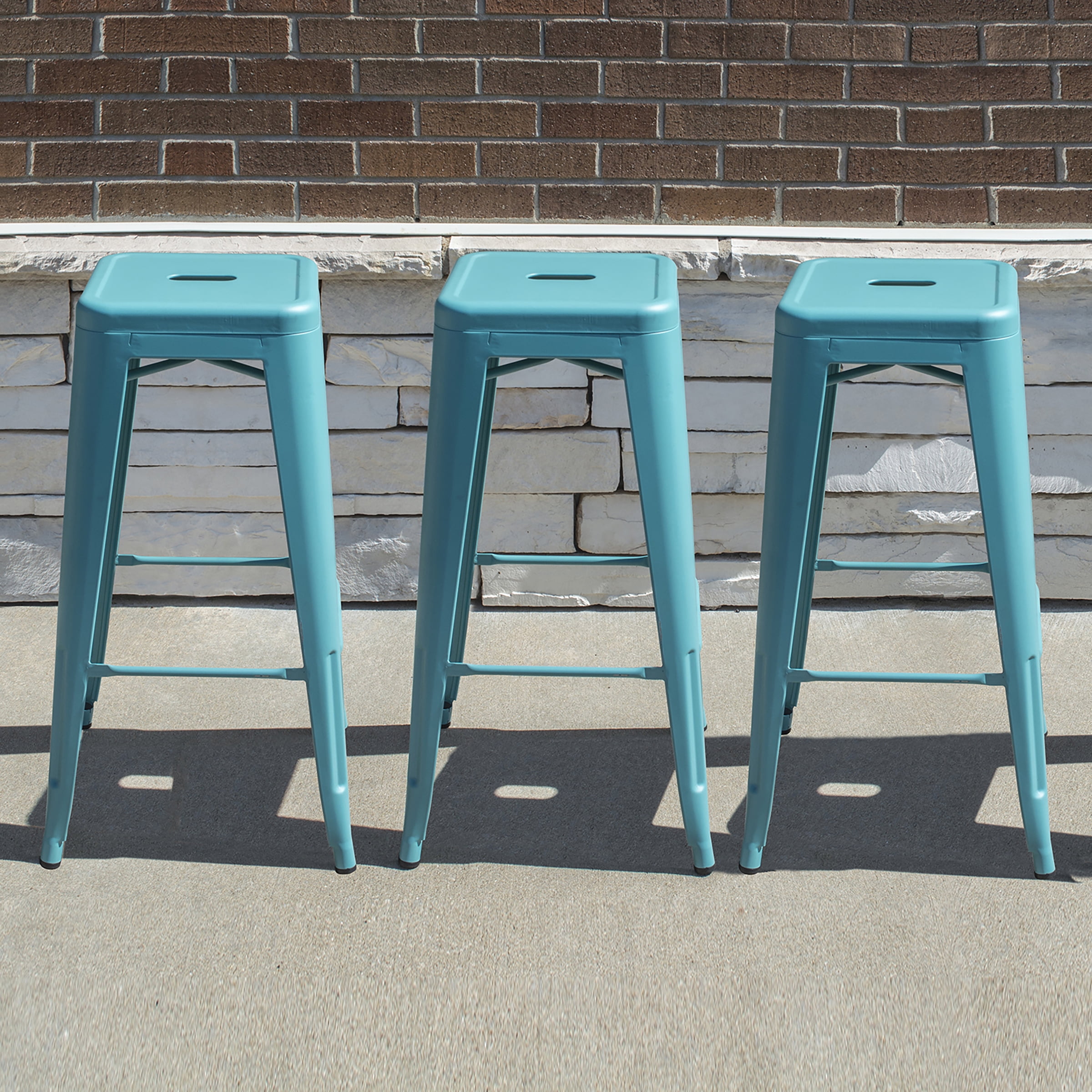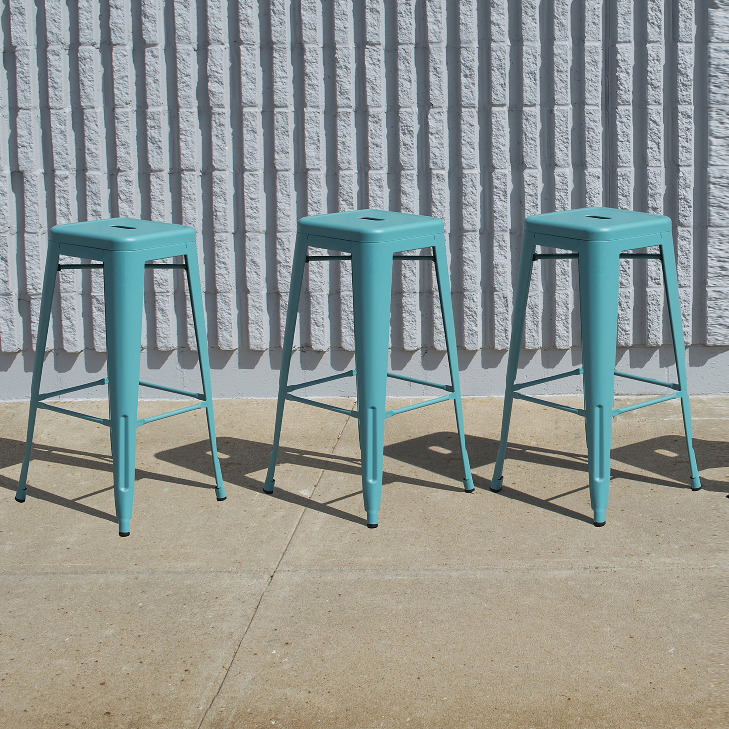 Industrial, modern look for kitchen, dorm, or shop Scratch-resistant powder coated paint finish. Easily stacks for convenient storage. X-brace support under the seat for stability and durability Seat height: 30 in. Seat size: 12 in L x 12 in W 17 in W x 17 in D x 30 in H Weight Capacity: 330 lbs. Each stool weighs 12.5 lbs. Sold in a set of 3 pieces. Backless