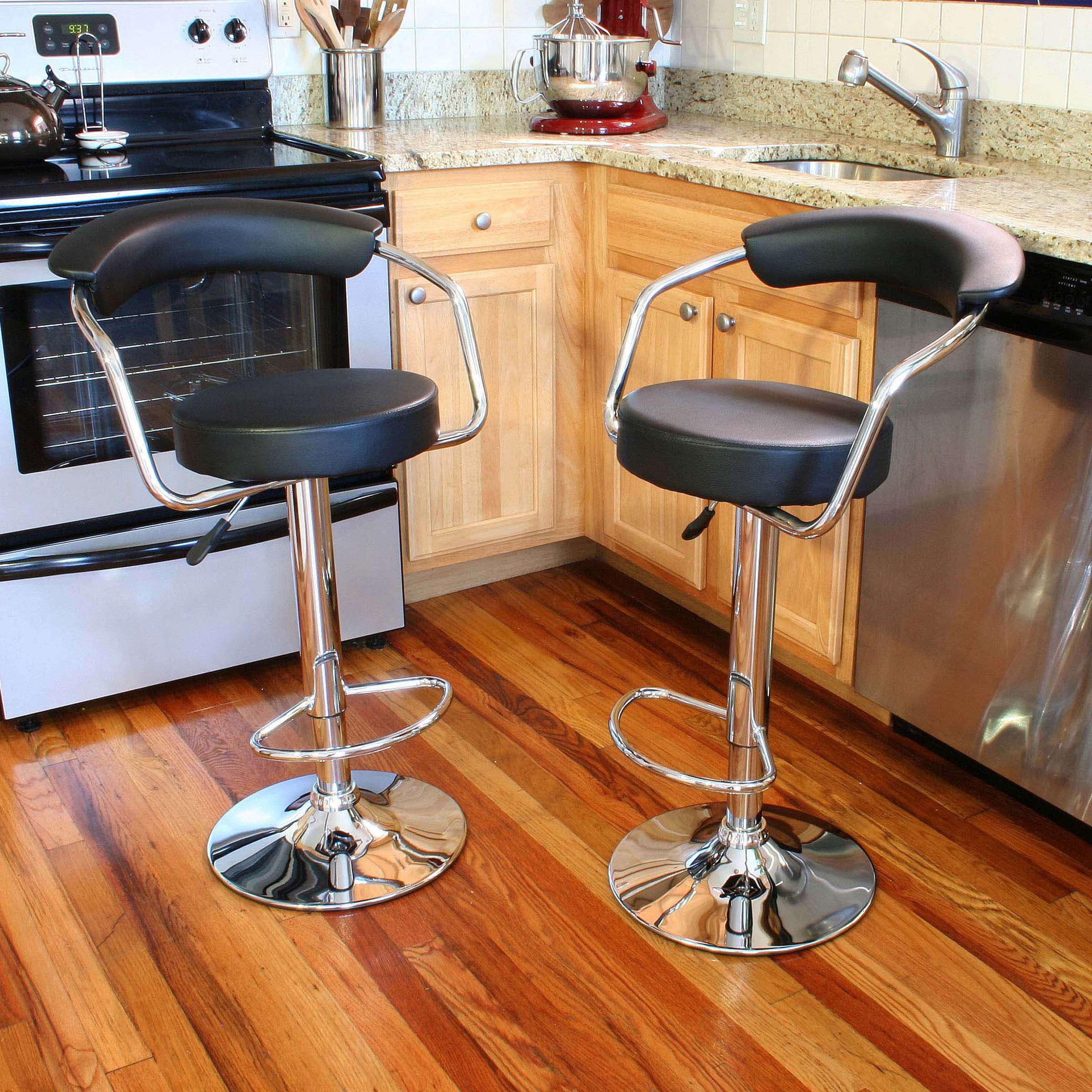AmeriHome Classic Elegant Bar Stool – 2 Piece This AmeriHome 2 Piece Adjustable Height Bar Stool Set includes two retro style, adjustable height black vinyl bar stools. This 2-piece bar stool set is reminiscent of the days of diners and drive-ins, and features a polished chrome base and a black vinyl seat and back rest for a hint of vintage retro style. Designed for maximum comfort, each bar stool features a large 14 inch wide, padded, 360 degree swivel seat, a padded vinyl back, a built in footrest and an adjustable seat height of 24.75 to 32.75 inches, which makes this set comfortable for kids and adults to sit together. Includes 2 retro style, adjustable height black vinyl bar stools Adjustable seat height from 24.75 to 32.75 in. Max seat back height 42.25 in. 14 in. vinyl padded 360-degree swivel seat 330 lbs weight capacity each – Weight: 15 – Color: Black, Silver – Color Family: Multi – Width (inches): 16 – Material: Vinyl, Chrome – Depth (inches): 42.25 – Height (inches): 16