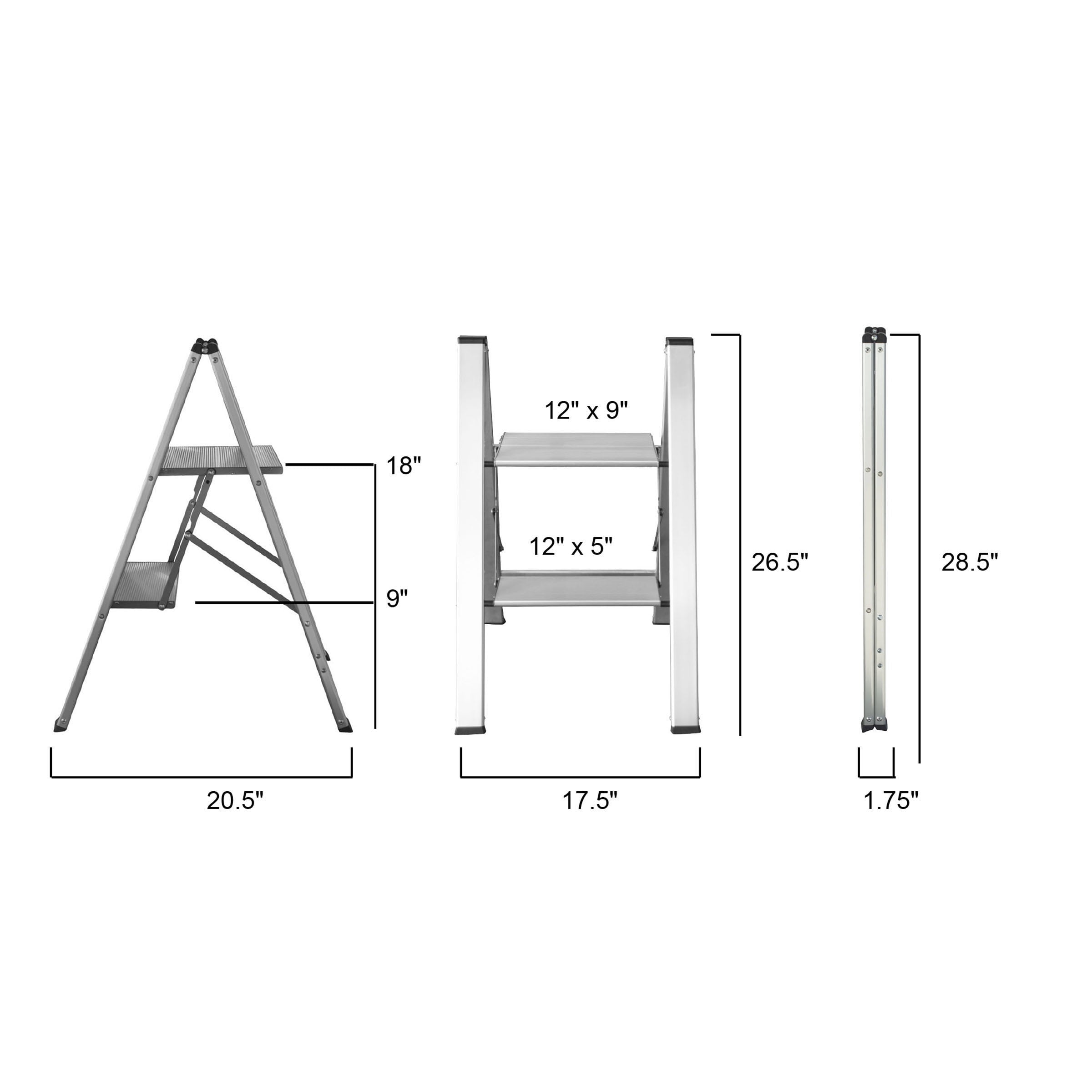 Great for home maintenance projects Pattern on metal steps help to prevent slipping, provides secure footing Ultra-slim fold flat design conserves storage space Fully aluminum frame and steps keep the weight light Locks open to help prevent accidents Closed dimensions 17.5 W x 1.75 D x 28.5 H inches Open dimensions 17.5 W x 20.5 D x 26.5 inches Bottom step measures 12 W x 5 D inches, top step measures 12 W x 9 D inches Steps at 9 and 18 inches from the floor 330 lbs. weight capacity, EN14183