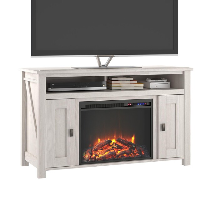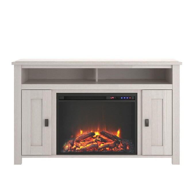 Create a warm and inviting atmosphere in your home with the Ameriwood Home Winthrop Electric Fireplace TV Console. The Console includes a remote controlled 23” electric fireplace insert that gives a realistic glow of a wood burning flame without all the cleanup and work of a wood burning fireplace. This fireplace will heat up a room up to 400 sq. ft. to the perfect temperature from 72° to 82° or use it to create a relaxing ambiance with its multiple light settings without the heat option. The LED light source boast up to 50,000 hours of life for a fireplace that will last for years to come. Made of laminated MDF and particleboard, the off-white woodgrain finish emulates an old wooden barn giving this piece a cozy feel. This TV Console is built to accommodate flat panel TVs up to 50” wide and up to 55 lbs. The Winthrop also includes 2 side cabinets that conceal 4 storage shelves and a large open divided shelve for your cable box, DVD player or video gaming system. The TV Console ships flat to your door and requires assembly upon opening. Two adults are recommended to assemble. Once assembled, the TV Console measures to be 29.125”H x 47.6875”W x 15.6875”D.