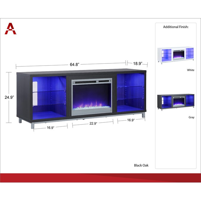 Step away from the ordinary and give your living room a modern makeover with the Ameriwood Home Lumina Fireplace TV Stand. Ready to warm up a 400 square foot room with the touch of a button, you can relax knowing that timers will take care of the rest. If you want to simply enjoy the look of the flames without the heat use the included remote to switch off the heat option and pick your flame brightness. On either side of the fireplace insert are three shelves, 2 glass, that hold your entertainment components like gaming systems, a DVD player, remotes and more. Both of the side shelves are illuminated with blue lights to coordinate with the glowing fireplace. The top can hold up to a 70” flat paneled TV with a maximum weight of 120 lbs. Two adults are recommended to assemble this Fireplace TV Stand. After assembly, the stand measures to be 24.875”H x 64.75”W x 18.875”D.
