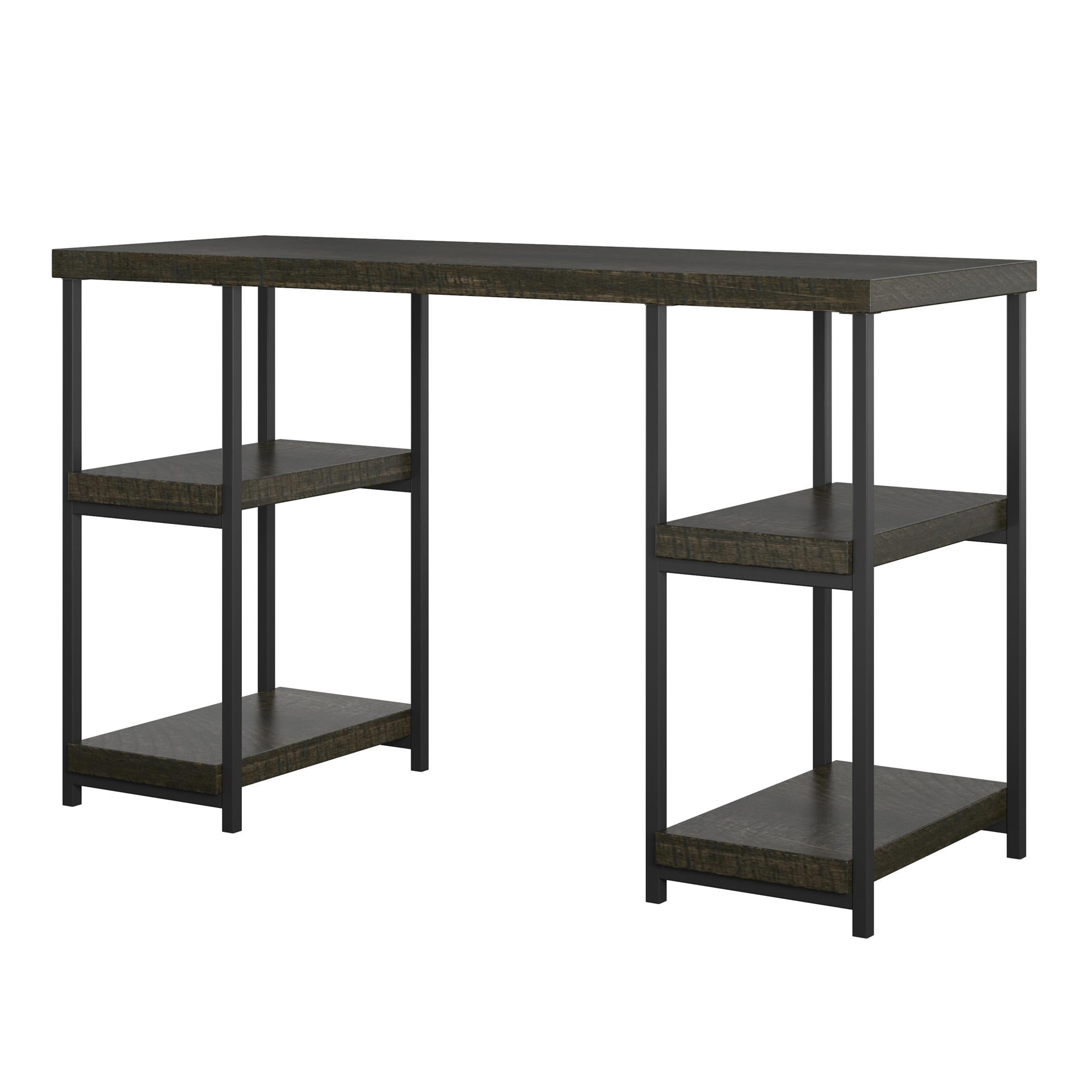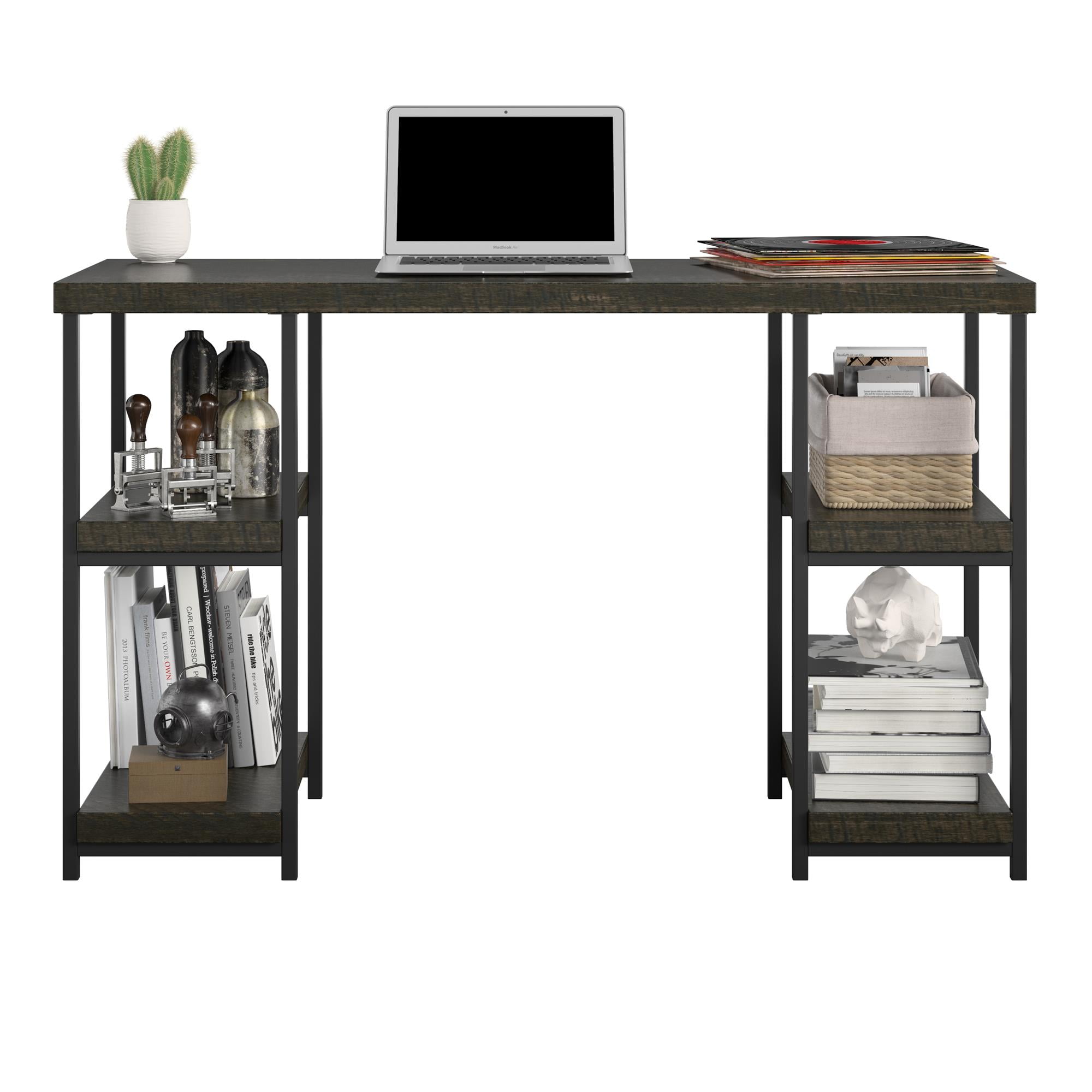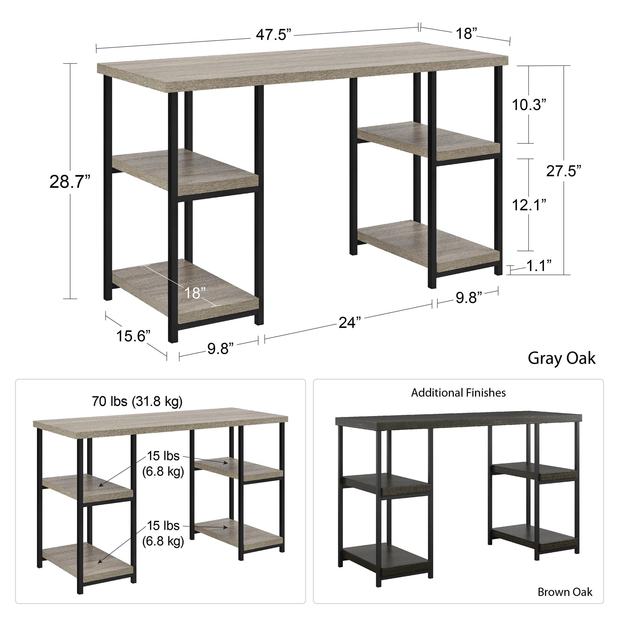 From the home office to the dorm room, the Ameriwood Home Elmwood Double Pedestal Computer Desk can be used in so many different spaces. The sturdy desktop provides a large work surface for your laptop and all your important papers. Four open shelves keep books, office supplies or accessories within easy reach. Made of laminated hollow core with a powder-coated metal frame, the dark brown woodgrain finish and black metal frame bring an instant upgrade to any space. The Desk ships flat to your door and requires assembly upon opening. Two adults are recommended to assemble. Once assembled, the Desk measures to be 28.7″H x 47.5″W x 18″D.