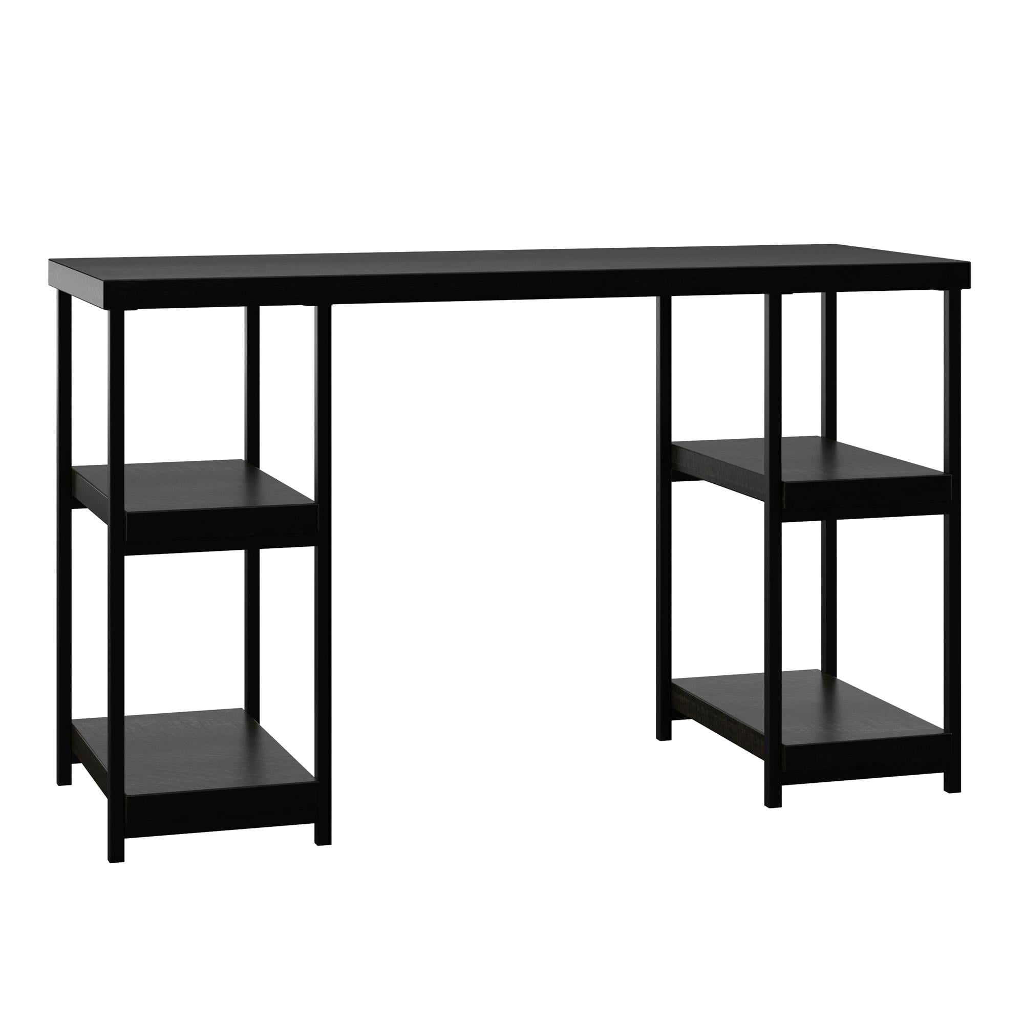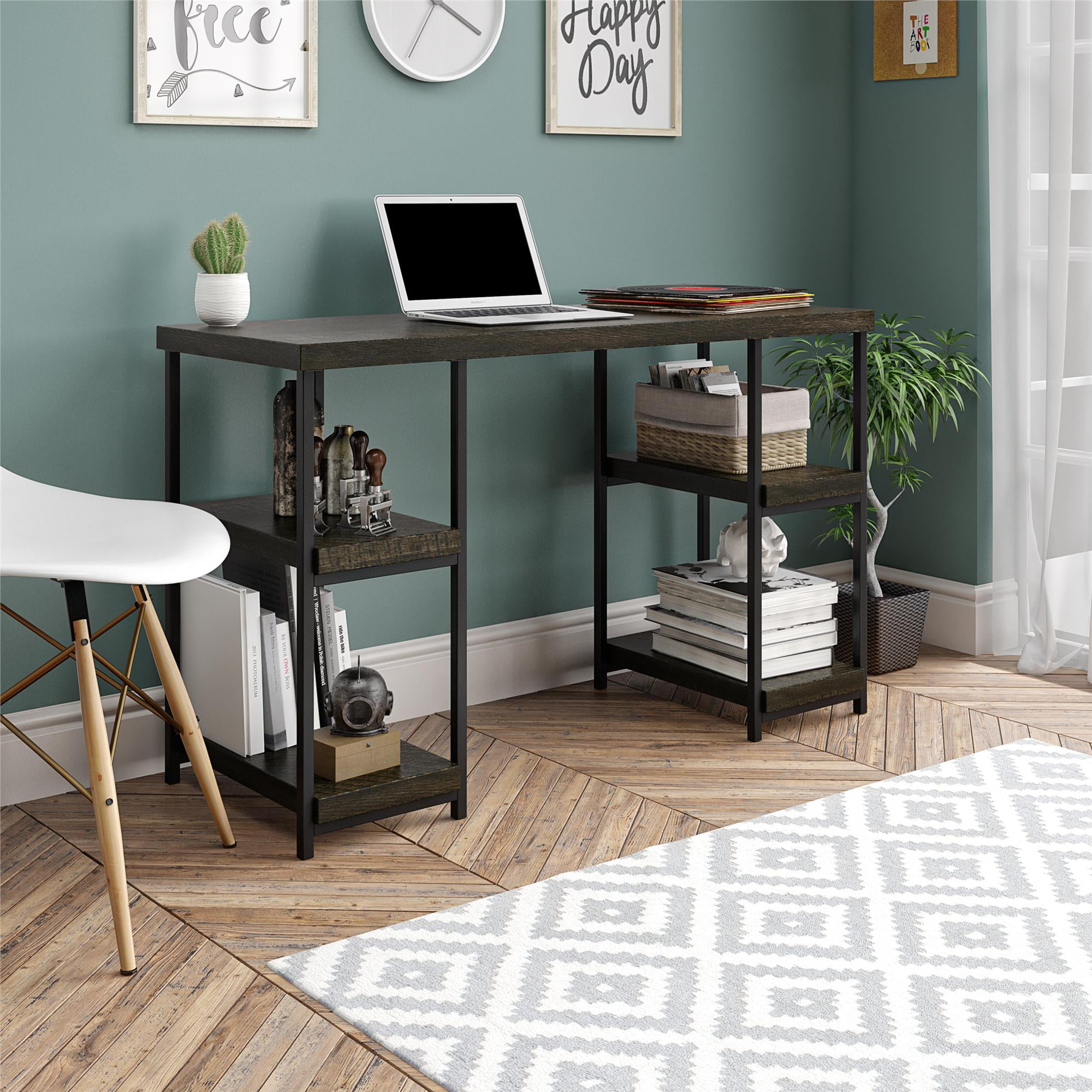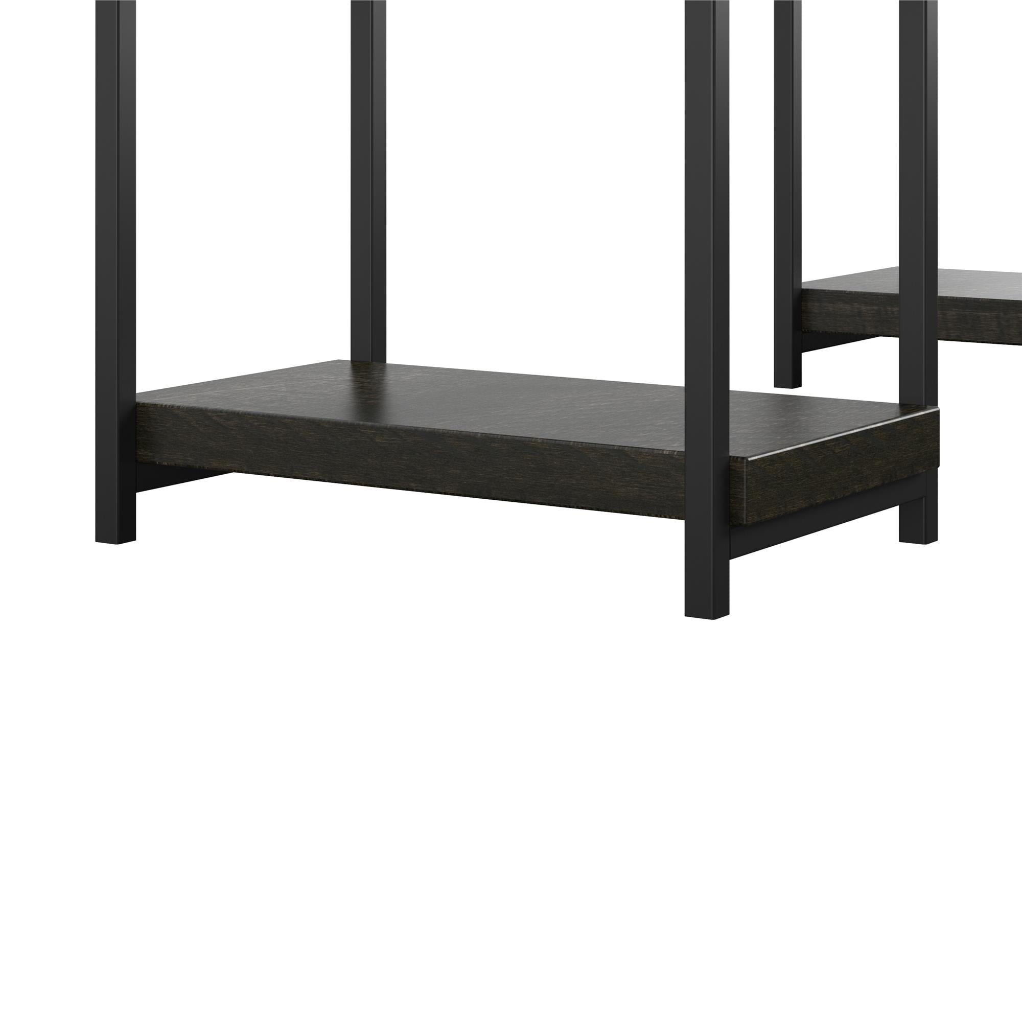 From the home office to the dorm room, the Ameriwood Home Elmwood Double Pedestal Computer Desk can be used in so many different spaces. The sturdy desktop provides a large work surface for your laptop and all your important papers. Four open shelves keep books, office supplies or accessories within easy reach. Made of laminated hollow core with a powder-coated metal frame, the dark brown woodgrain finish and black metal frame bring an instant upgrade to any space. The Desk ships flat to your door and requires assembly upon opening. Two adults are recommended to assemble. Once assembled, the Desk measures to be 28.7″H x 47.5″W x 18″D.