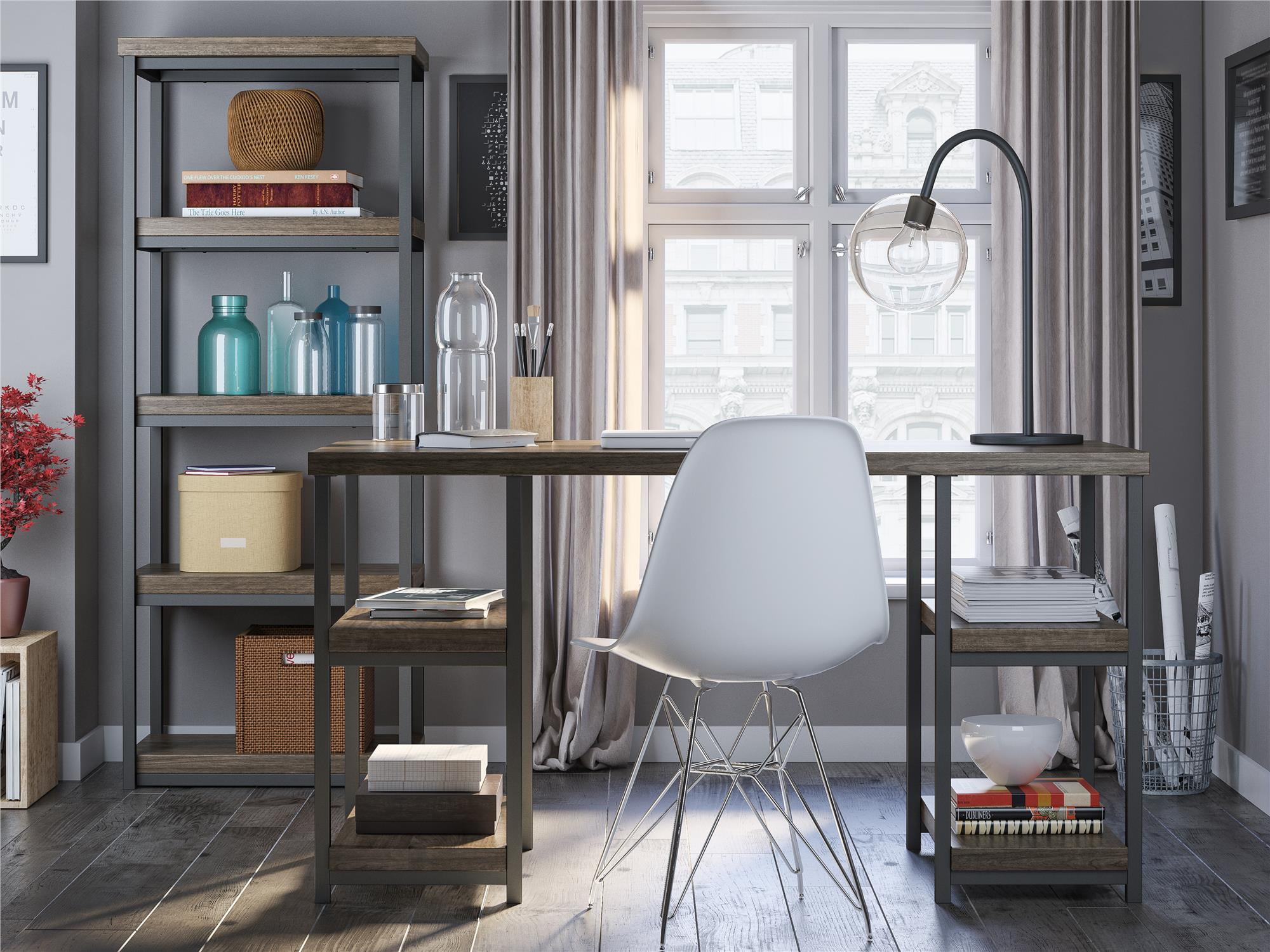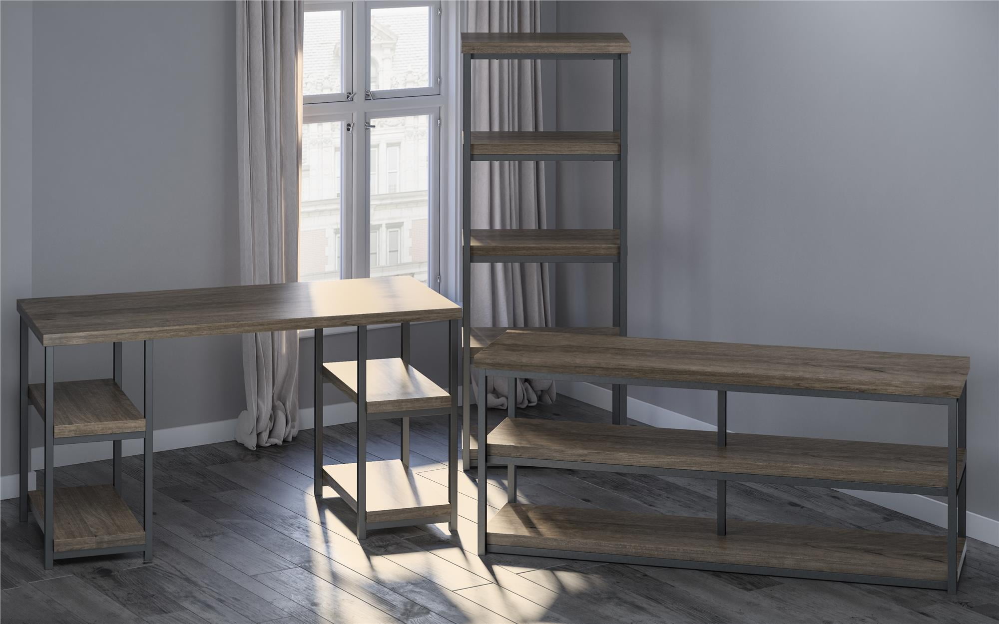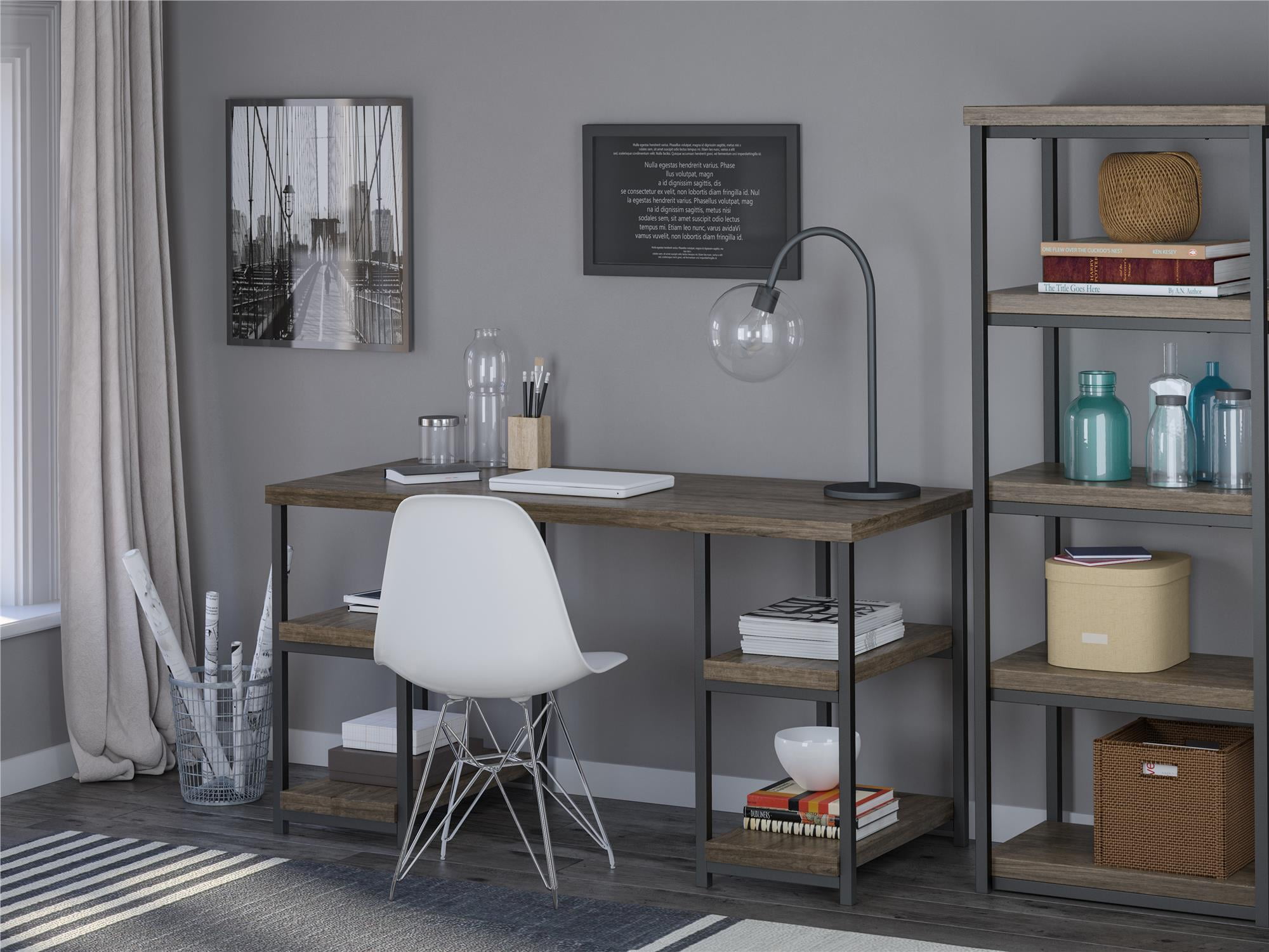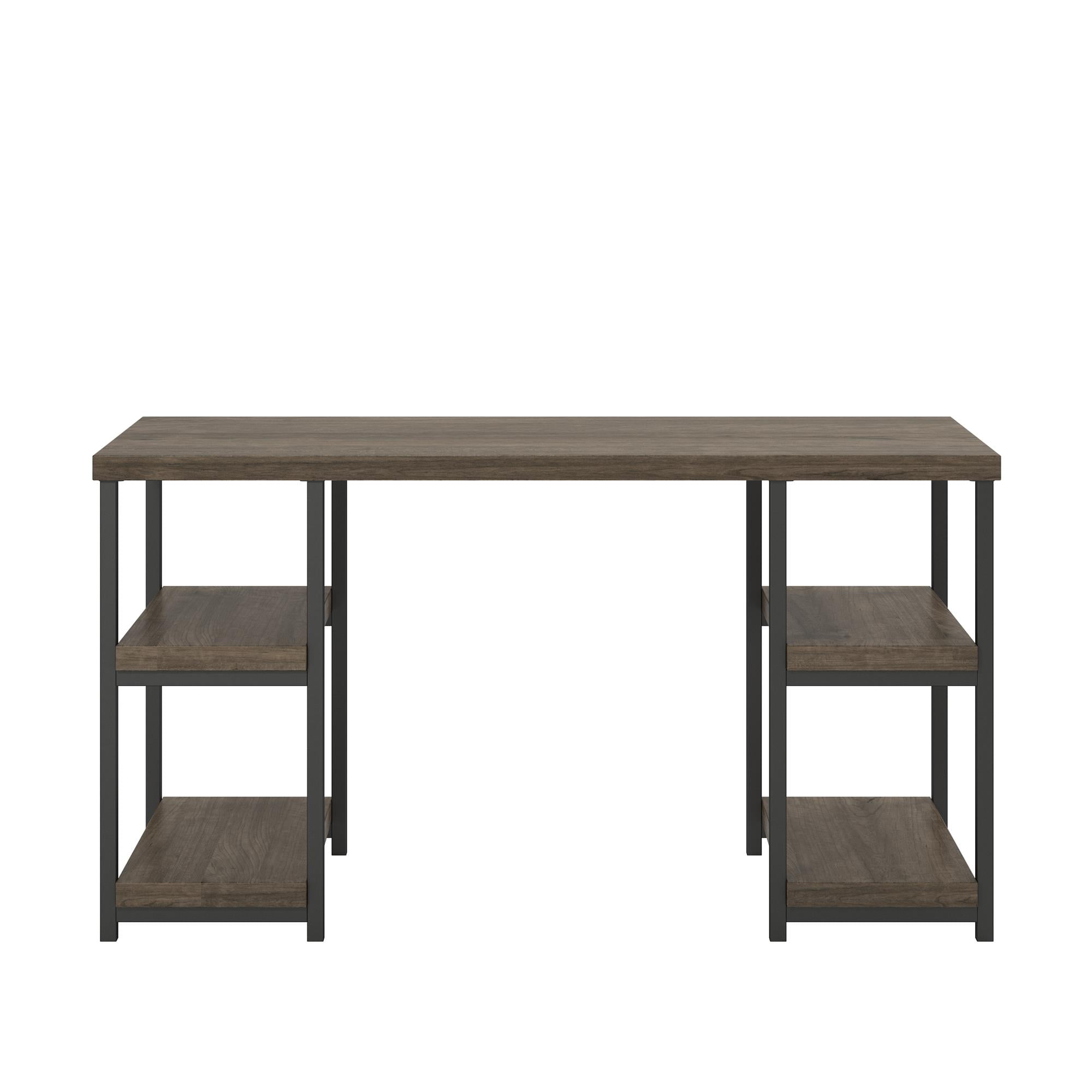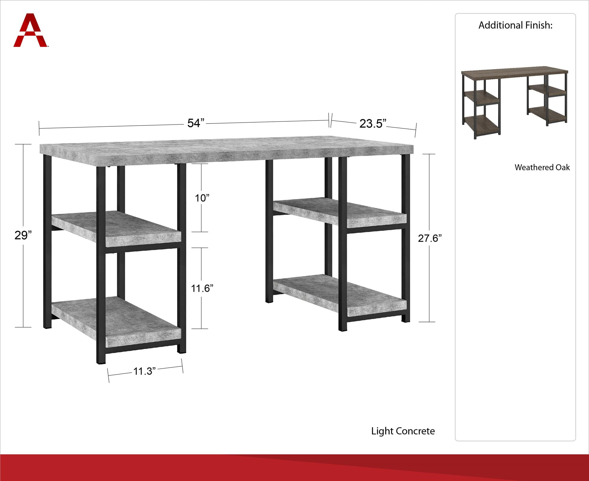 Transform your home office with the beautifully simple Ameriwood Home Ashlar Desk The double pedestal design offers 4 open shelves for paper, manuals, and extra office supplies and a spacious desktop for your laptop, paperwork, and printer Made of laminated particleboard and metal, the stunning rustic gray finish with brown undertones paired with the dark gray, powder-coated metal frame creates a clean, modern structure that’ll add style to any room Complete your space with the entire Ashlar collection for a coordinated look (each sold separately) The Desk ships flat to your door and 2 adults are recommended to assemble. The desktop can support up to 100 lbs. and each shelf can hold up to 30 lbs. Assembled dimensions: 29″H x 54″W x 23.5″D Ameriwood Home warrants this product to be free from defects and agrees to remedy any such defect. This warranty covers one year from the date of original purchase With over 30 years’ experience in RTA furniture, Ameriwood Home offers a wide range of home furniture products for every room of the house Acquired by Dorel Industries in 1978, Ameriwood Home has become a leader of RTA furniture growing in Bedroom, Home Office, Entertainment, Storage and Youth products