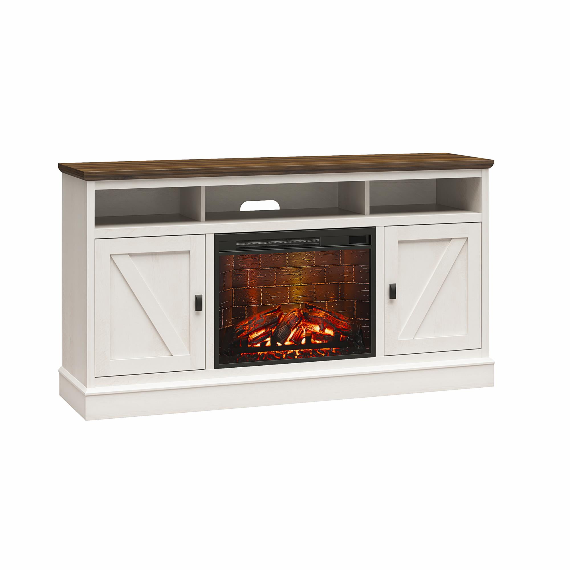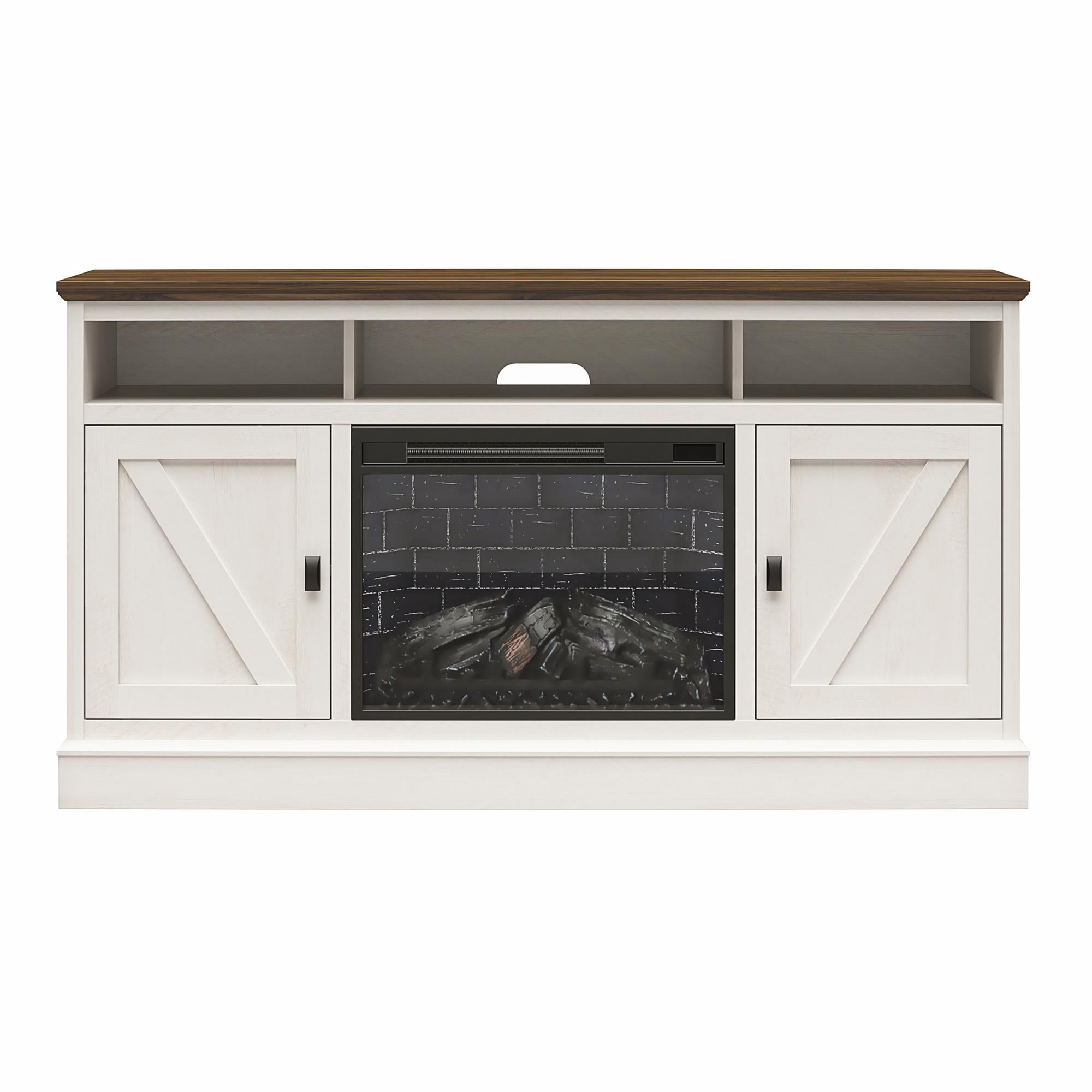 Elevate the ambiance of your home with the Ameriwood Home Ashton Lane Electric Fireplace TV Console with Remote Control, an excellent choice that brings warmth and charm to your living room or family room at an affordable price. This console features a convenient remote-controlled 23″ electric fireplace insert, providing the mesmerizing glow of a wood-burning flame without the hassle of upkeep. With the ability to heat up to 400 sq. ft., you can effortlessly achieve the perfect temperature ranging from 72?? to 82??, or opt for the soothing ambiance of the multiple light settings without the heat. The LED light source ensures long-lasting performance, boasting an impressive lifespan of up to 50,000 hours, guaranteeing years of enjoyment. Designed to accommodate flat panel TVs up to 65″ wide and weighing up to 70 lbs., this console offers practicality and functionality. It includes two side cabinets that discreetly conceal four storage shelves, along with a spacious open divided shelf, perfect for organizing your cable box, DVD player, or gaming systems. Experience the warmth, style, and affordability of the Ameriwood Home Ashton Lane Electric Fireplace TV Console, a delightful addition to any home d??cor. This item ships in one flat box and requires assembly. Two adults are recommended to assemble. Assembled measurements: 58″ W ?? 15.75″ D ?? 31.125″ H.
