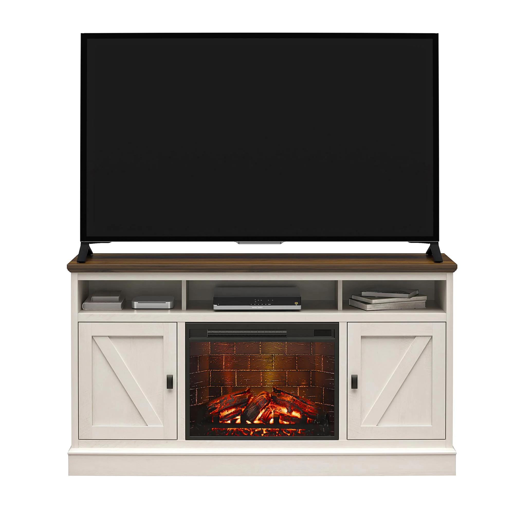 Ashton Lane Electric Fireplace TV Stand with Remote for TVs up to 65in, Magnolia Oak/Columbia Walnut