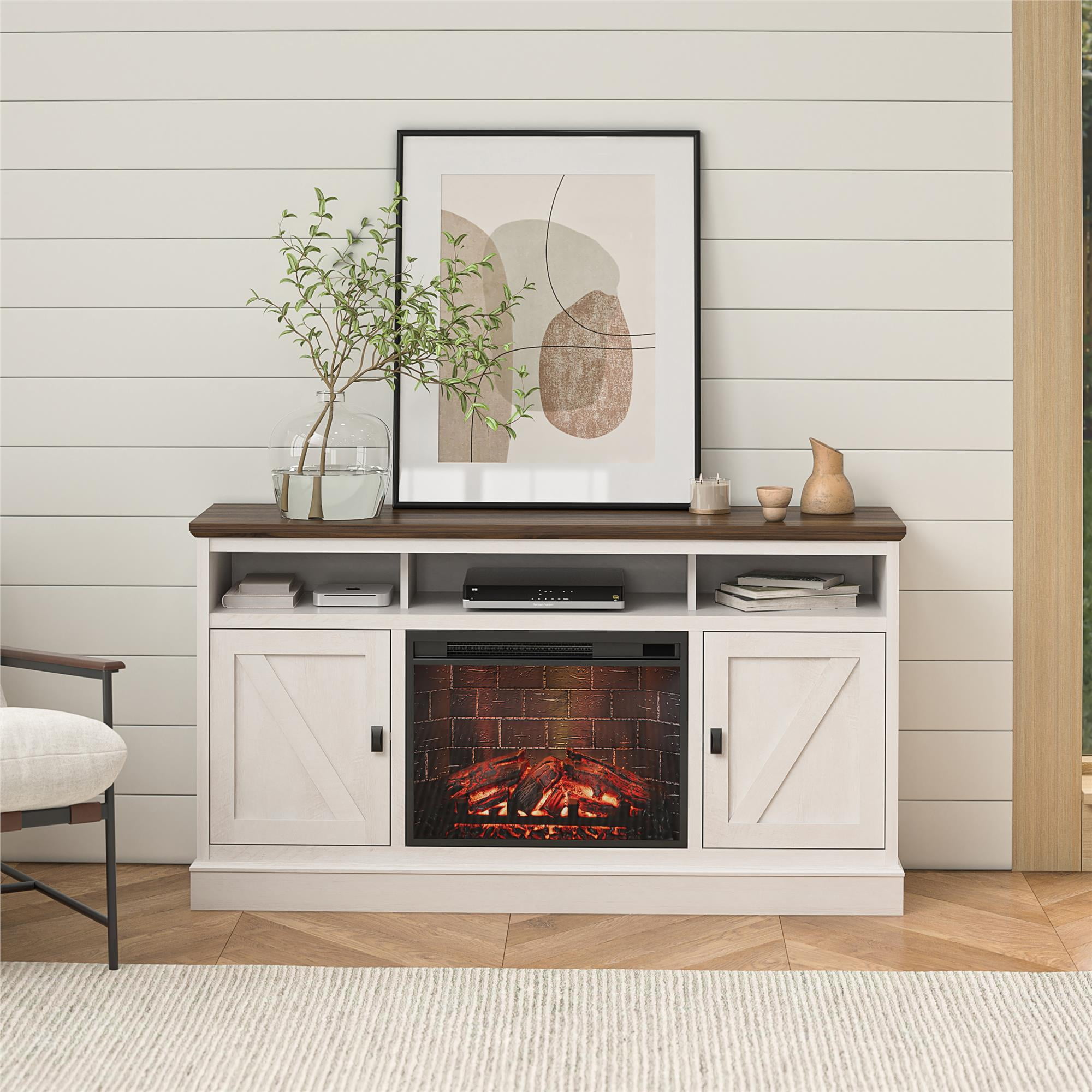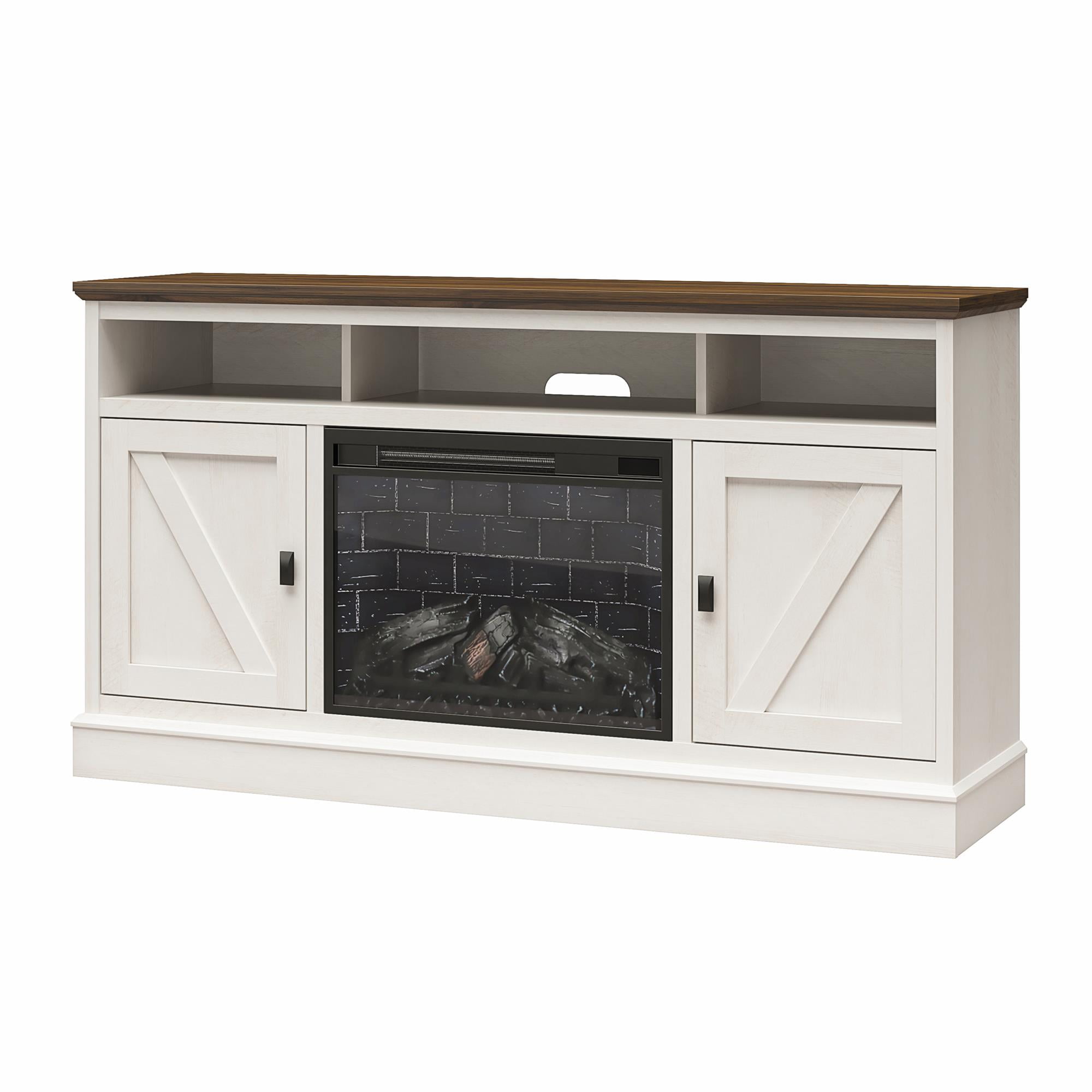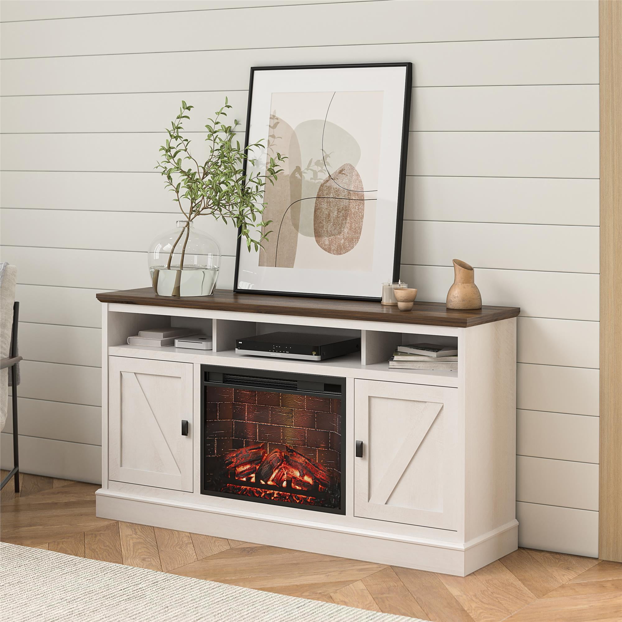 AFFORDABLE MODERN FARMHOUSE DESIGN: Elevate the ambiance of your home with the Ameriwood Home Ashton Lane Electric Fireplace TV Console FIREPLACE FEATURES: Remote-controlled 23″ electric fireplace insert with the mesmerizing glow of a wood-burning flame, ability to heat up to 400 sq. ft.; temperature setting ranging from 72?? to 82?? FLAME FEATURES: Multiple light settings available and can be on with or without heat to accommodate all seasons COLOR OPTIONS: Black Oak, Rustic Oak, and Magnolia Oak/Walnut SHIPPING & ASSEMBLY: The Fireplace TV Stand ships in one flat box and requires assembly. Two adults are recommended to assemble MEASUREMENTS: Assembled dimensions: 58″ W ?? 15.75″ D ?? 31.125″ H; Rated to accommodate most flat screen TVs up to 65″, up to 70 lbs. WARRANTY: 1-Year Limited Warranty Included