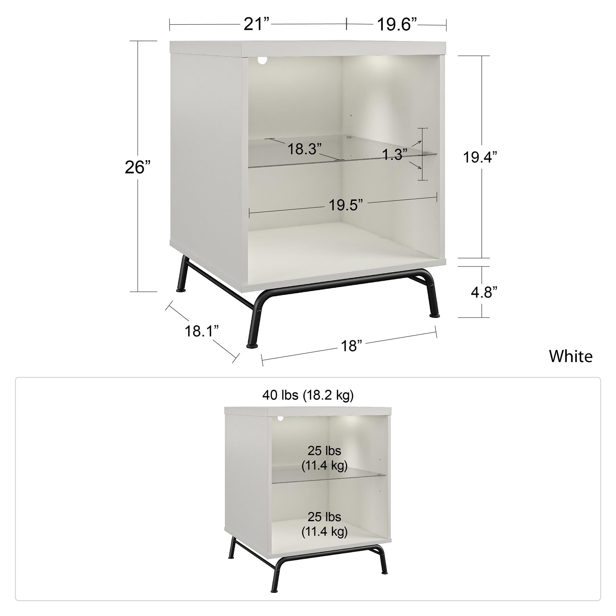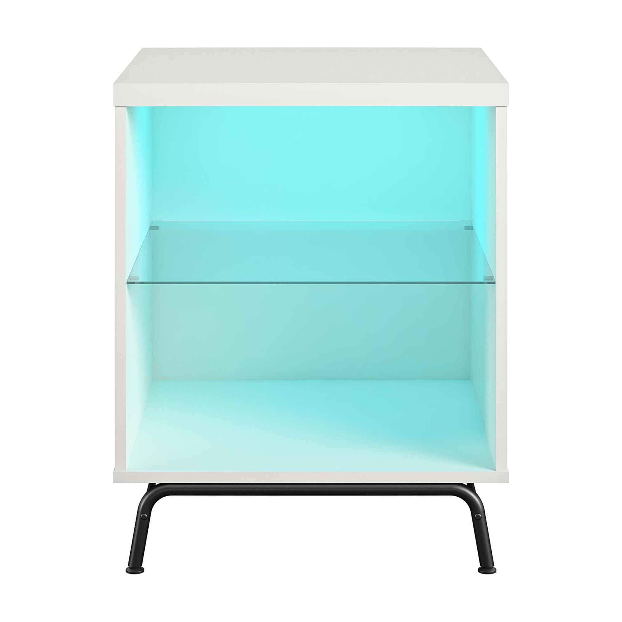The Ameriwood Home Melbourne End Table will add a modern and functional storage option for all of your entertainment needs Made of sturdy metal feet with beautiful white laminated particleboard and MDF with tempered glass to make a sleek and modern End Table for your home With 2 open shelves for remotes, books, and magazines, this Table can store everything you need for movie night The inside of the Table features LED lighting with 7 different color settings for a fun look for your living room or man cave The Table ships flat to your door and 2 adults are recommended to assemble. The table top can hold up to 40 lbs. while each shelf can hold 25 lbs. Assembled dimensions: 26″H x 21″W x 19.625″D Ameriwood Home warrants this product to be free from defects and agrees to remedy any such defect. This warranty covers one year from the date of original purchase With over 30 years’ experience in RTA furniture, Ameriwood Home offers a wide range of home furniture products for every room of the house Acquired by Dorel Industries in 1990, Ameriwood Home has become a leader of RTA furniture growing in Bedroom, Home Office, Entertainment, Storage and Youth products