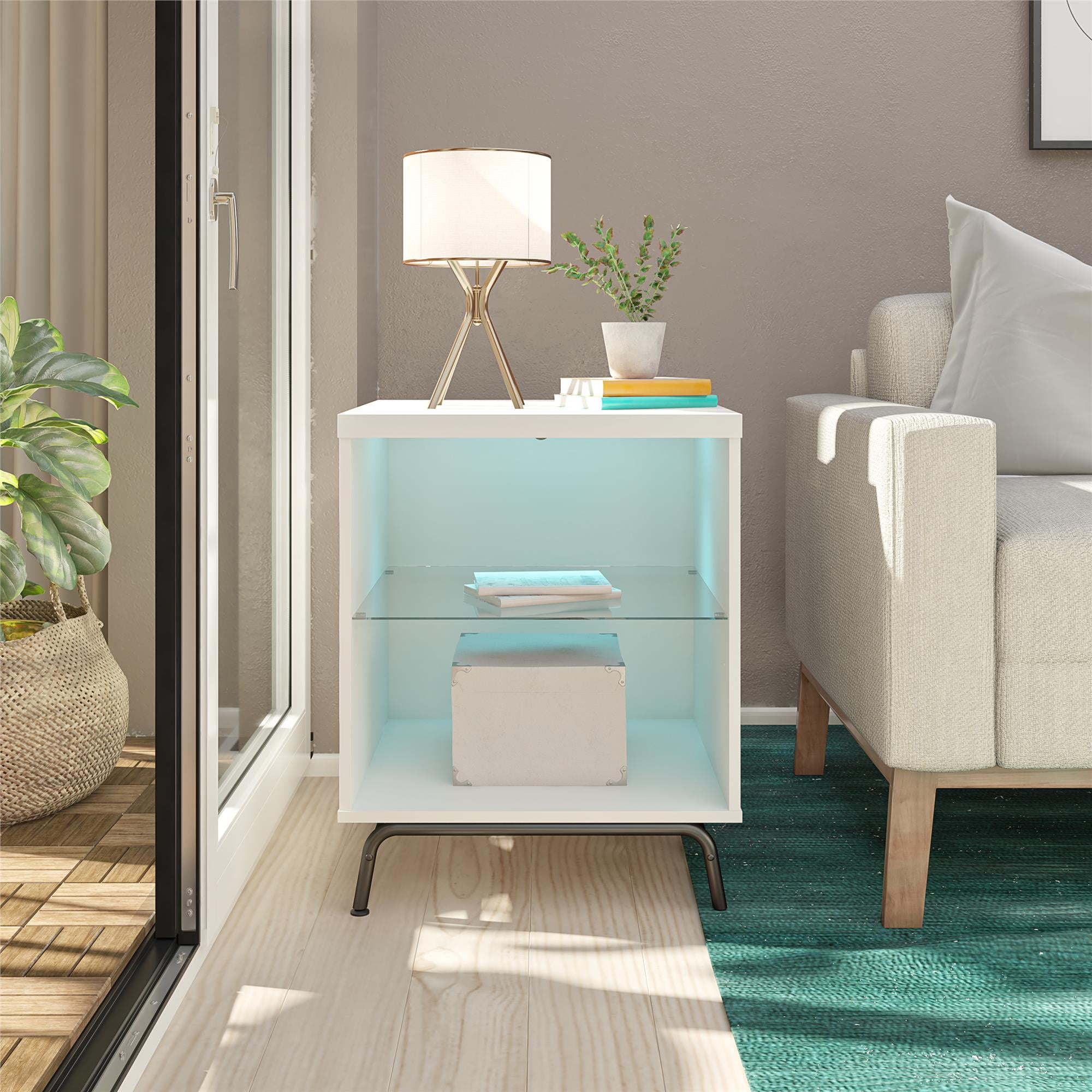 Step away from the ordinary and give your living room a modern makeover with the Ameriwood Home Melbourne End Table. This End Table features LED lighting with 7 different color settings for a fun and funky look for your entertainment space. But the modern touches don’t stop there. The 2 open shelves, 1 glass, can organize remotes, magazines, or other electronics so you have everything you need for family movie or game night. This Table has a mix of white laminated particleboard and MDF with metal feet and tempered glass shelving. Combined together this Table makes for a very sturdy addition to your room. The Table ships flat to your door and requires assembly upon opening. Two adults are recommended to assemble. After assembly, the Table measures to be 26″H x 21″W x 19.625″D.