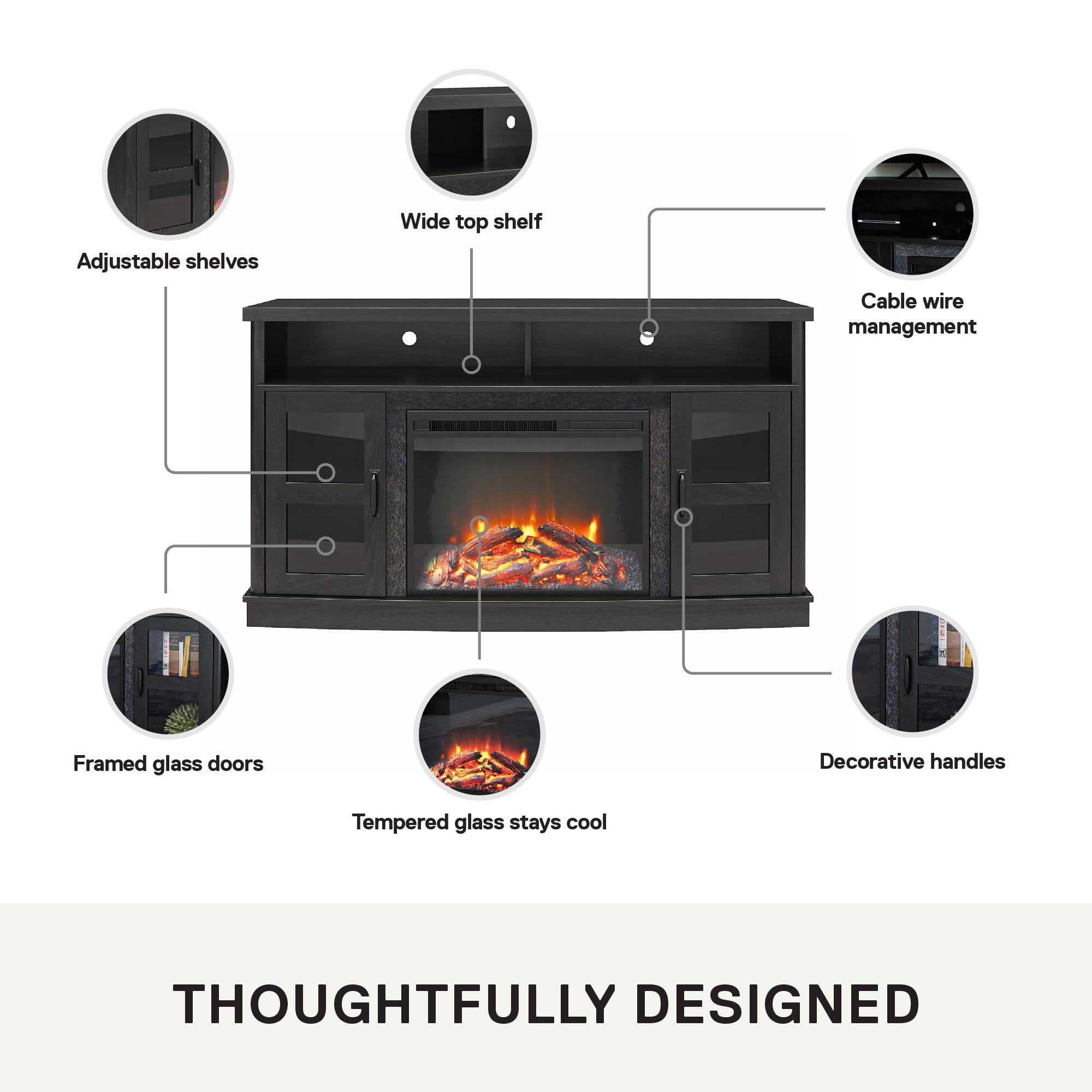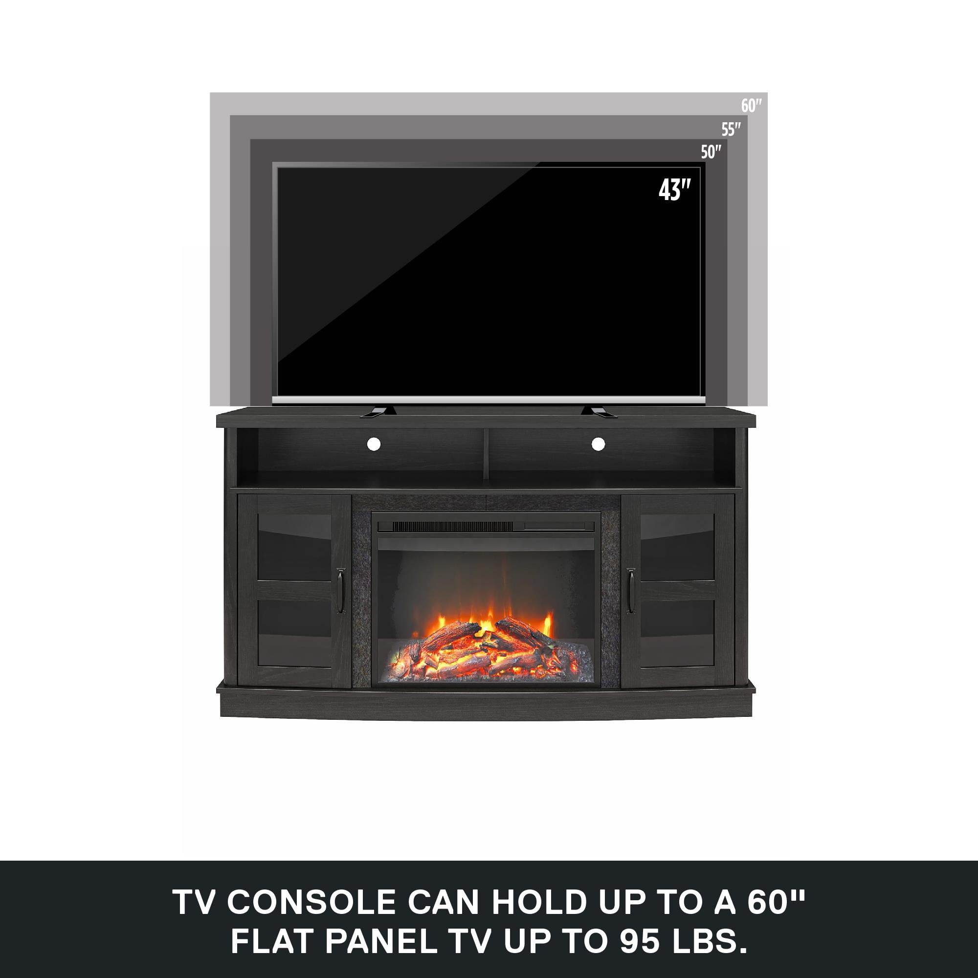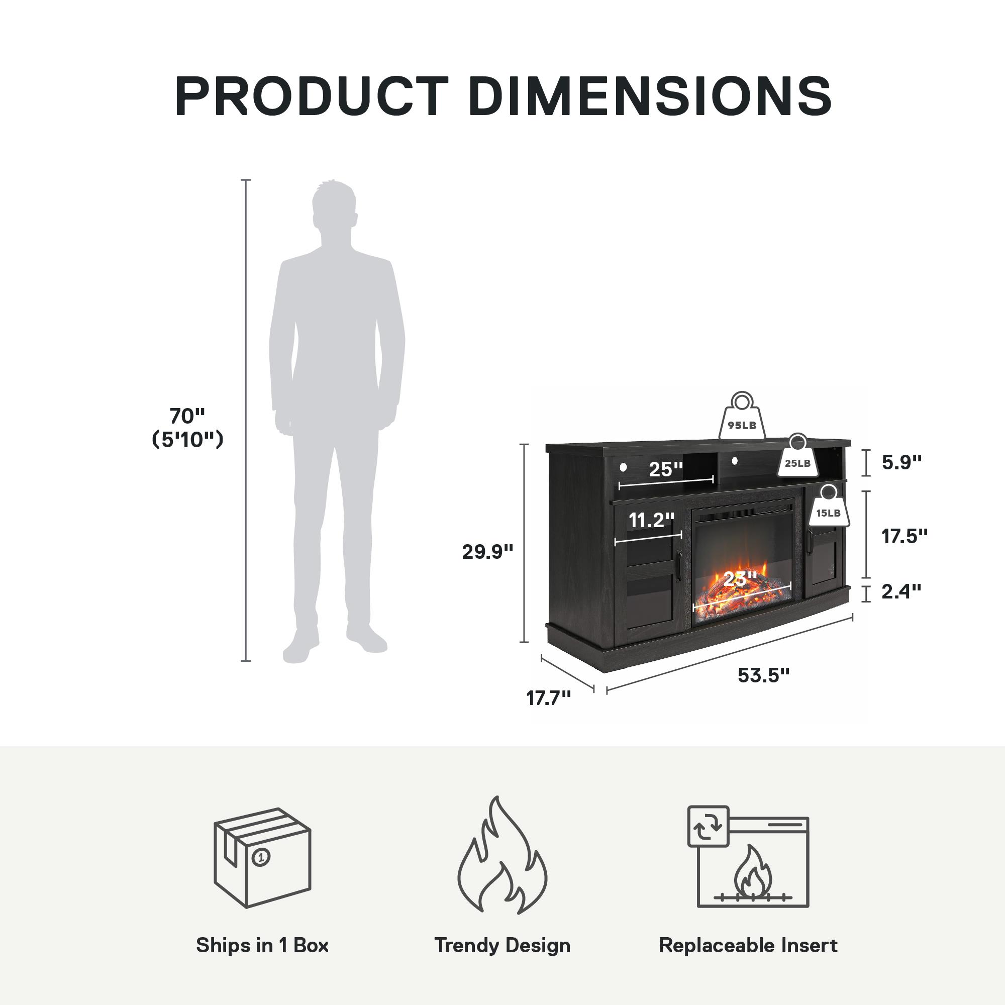 Warm up your living room with the Ameriwood Home Barrow Creek Fireplace TV Console with Glass Doors for TVs up to 60″ wide or 95 lbs Made of laminated MDF and particleboard with framed glass doors The 23″ electric fireplace insert plugs into a standard 120V outlet and can heat a room up to 400 sq. ft. and be used with or without heat. Adjust the flame and heat settings with the remote control or touch panel The divided top shelf and adjustable shelving behind the 2 glass doors provide plenty of space for components and DVDs. Wire management holes allow easy access to outlets and keep cords organized The TV Console ships flat to your door and 2 adults are recommended to assemble. The open top shelf can hold up to 25 lbs. while each of the shelves behind the doors can hold 15 lbs. Assembled dimensions: 29.9″H x 53.5″W x 17.7″D 1-Year Limited Warranty Included
