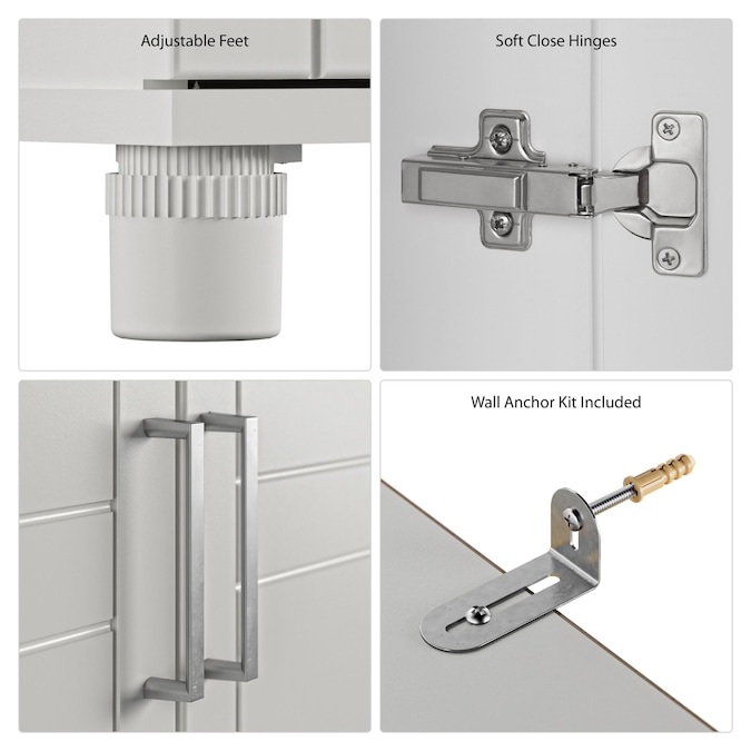 - Soft closing hinges prevent slamming doors and adjustable feet keep your Cabinet level on uneven floors
