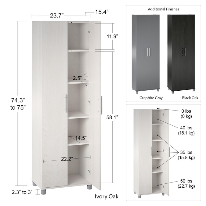 Add much needed storage space to any room in your home with the SystemBuild Camberly 24” Storage Cabinet. Made of laminated particleboard, the ivory oak finish and satin nickel hardware pair nicely with most any décor so the Cabinet can be used wherever extra storage is desired. The interior of this Cabinet features 5 shelves, 3 adjustable, allowing you to customize your storage for both small and large items. Store and organize anything from office supplies to cleaning supplies and even kitchen pantry items. The adjustable feet make keeping your Cabinet level on uneven floors simple, and also keeps the unit up off the floor protecting the bottom from spills or standing water. A wall anchor kit is included to secure the Cabinet to the wall and prevent tipping injuries. Use this piece as a stand-alone item or combine it with additional SystemBuild Camberly storage items to create the perfect storage solution for your home. The Storage Cabinet ships flat to your door and 2 adults are recommended to assemble. Once assembled, the Cabinet measures 74.29”H x 23.7”W x 15.39”D.