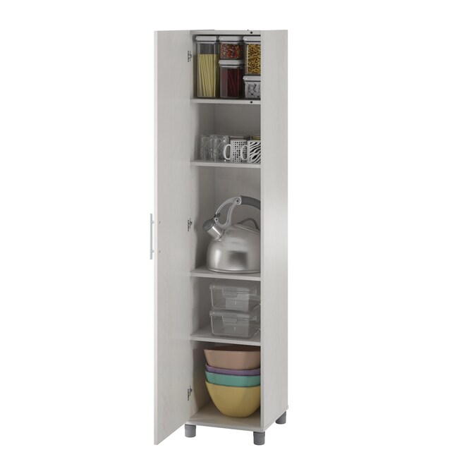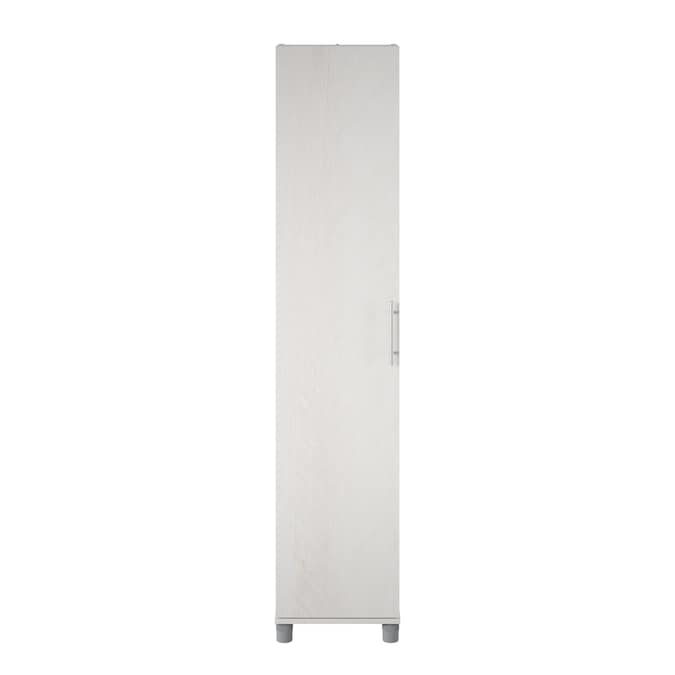 Add much needed storage space to any room in your home with the SystemBuild Evolution Camberly 16” Storage Cabinet. Made of laminated particleboard, the ivory oak finish and satin nickel hardware pair nicely with most any décor so the Cabinet can be used wherever extra storage is desired. The interior of this Cabinet features 5 shelves, 3 adjustable, allowing you to customize your storage for both small and large items. Store and organize anything from office supplies to cleaning supplies and even kitchen pantry items. The adjustable feet make keeping your Cabinet level on uneven floors simple and keeps the unit up off the floor protecting the bottom from spills or standing water. A wall anchor kit is included to secure the Cabinet to the wall and prevent tipping injuries. Use this piece as a stand-alone item or combine it with additional SystemBuild Evolution Camberly storage items to create the perfect storage solution for your home. The Storage Cabinet ships flat to your door and 2 adults are recommended to assemble. Once assembled, the Cabinet measures to be 74.29″H x 15.67”W x 15.39”D.