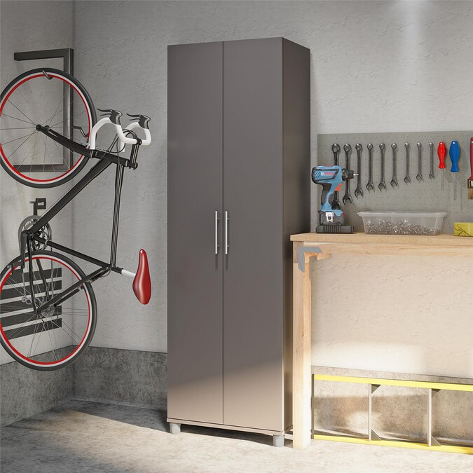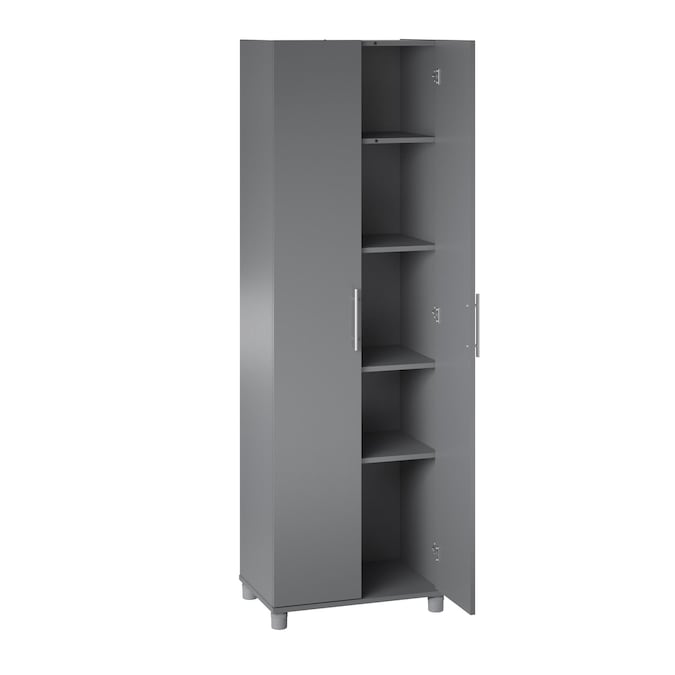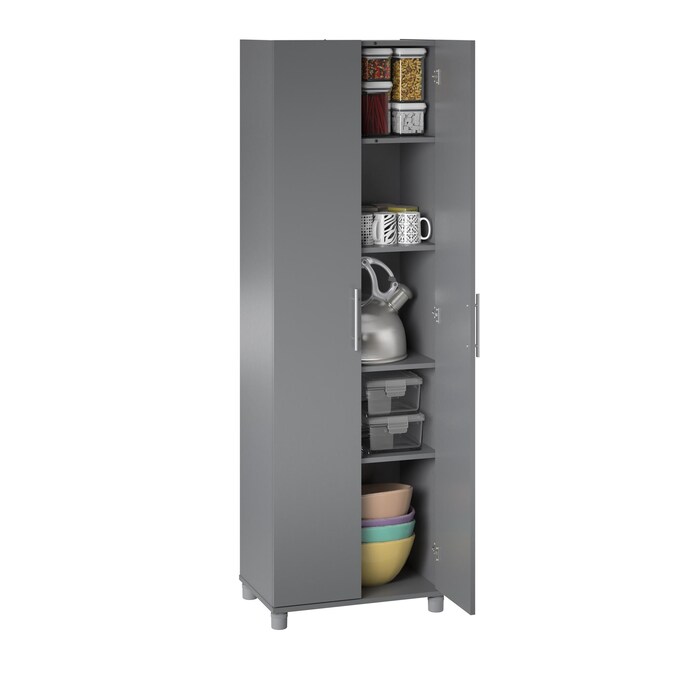 Add much needed storage space to any room in your home with the SystemBuild Evolution Camberly 24” Storage Cabinet. Made of laminated particleboard, the graphite gray finish and satin nickel hardware pair nicely with most any décor so the Cabinet can be used wherever extra storage is desired. The interior of this Cabinet features 5 shelves, 3 adjustable, allowing you to customize your storage for both small and large items. Store and organize anything from office supplies to cleaning supplies and even kitchen pantry items. The adjustable feet make keeping your Cabinet level on uneven floors simple, and also keeps the unit up off the floor protecting the bottom from spills or standing water. A wall anchor kit is included to secure the Cabinet to the wall and prevent tipping injuries. Use this piece as a stand-alone item or combine it with additional SystemBuild Evolution Camberly storage items to create the perfect storage solution for your home. The Storage Cabinet ships flat to your door and 2 adults are recommended to assemble. Once assembled, the Cabinet measures 74.29”H x 23.7”W x 15.39”D.