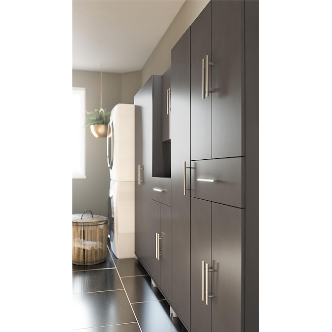 - Made of laminated particleboard, the Camberly 24” Utility Cabinet in graphite gray with satin nickel hardware can be added to any style and décor without breaking the bank