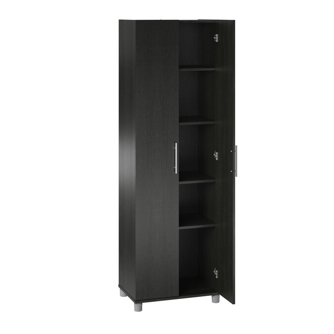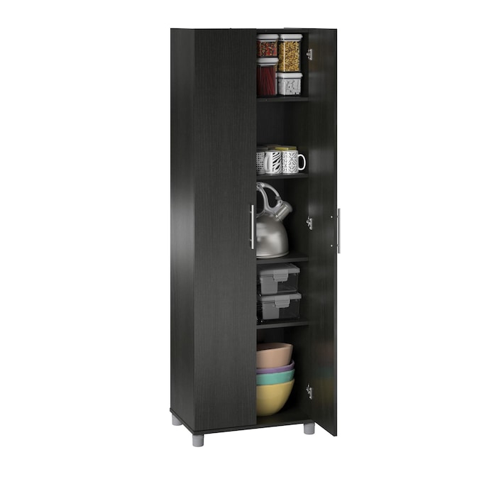 Add much needed storage space to any room in your home with the SystemBuild Evolution Camberly 24” Storage Cabinet. Made of laminated particleboard, the black oak finish and satin nickel hardware pair nicely with most any décor so the Cabinet can be used wherever extra storage is desired. The interior of this Cabinet features 5 shelves, 3 adjustable, allowing you to customize your storage for both small and large items. Store and organize anything from office supplies to cleaning supplies and even kitchen pantry items. The adjustable feet make keeping your Cabinet level on uneven floors simple, and also keeps the unit up off the floor protecting the bottom from spills or standing water. A wall anchor kit is included to secure the Cabinet to the wall and prevent tipping injuries. Use this piece as a stand-alone item or combine it with additional SystemBuild Evolution Camberly storage items to create the perfect storage solution for your home. The Storage Cabinet ships flat to your door and 2 adults are recommended to assemble. Once assembled, the Cabinet measures 74.29”H x 23.7”W x 15.39”D.