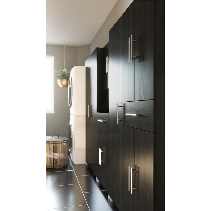 - Made of laminated particleboard, the Camberly 24” Utility Cabinet in black oak with satin nickel hardware can be added to any style and décor without breaking the bank
