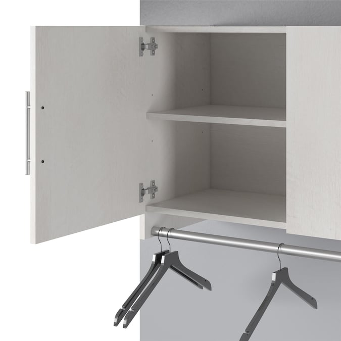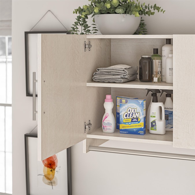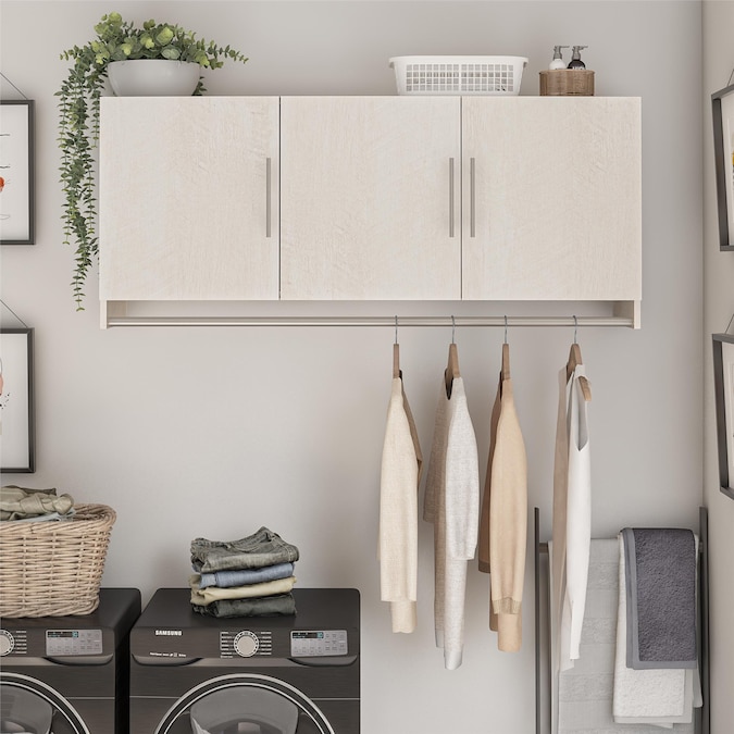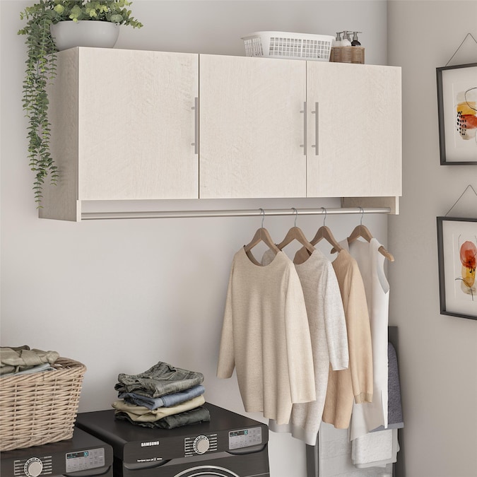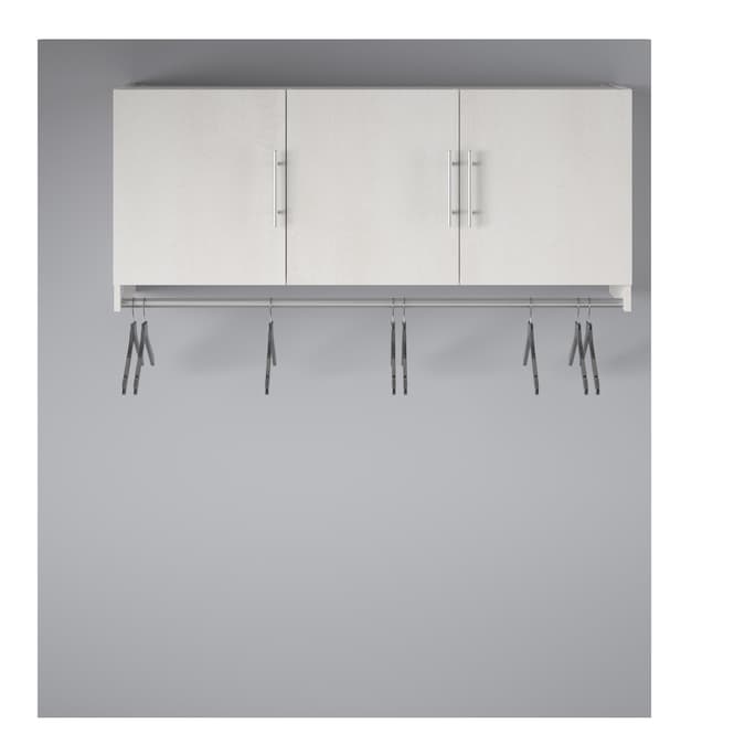 Convert unused wall space into storage with the Systembuild Evolution Camberly 3 Door Wall Cabinet with Hanging Rod. Made of laminated MDF and particleboard, this sturdy storage solution is sure to get you organized. Use the concealed storage of the Wall Cabinet for laundry essentials and cleaning supplies, and hang your cares out to dry on the convenient built in clothing rod below. The interior of each of the 3 Cabinets features 1 adjustable and 1 fixed shelf. The EZ Hang system makes hanging the Wall Cabinet quick and easy. Simply attach and level the support bar on the wall and hook the Wall Cabinet on for a sturdy and level hang on the first try. Use this piece as a stand-alone item, or combine it with additional Systembuild Evolution Camberly storage items to create the perfect storage solution for your home. The Wall Cabinet ships flat to your door and requires assembly. Two adults are recommended to assemble. Once assembled, the Wall Cabinet measures to be 53.98″ W x 15.35″ D x 23.62″ H.